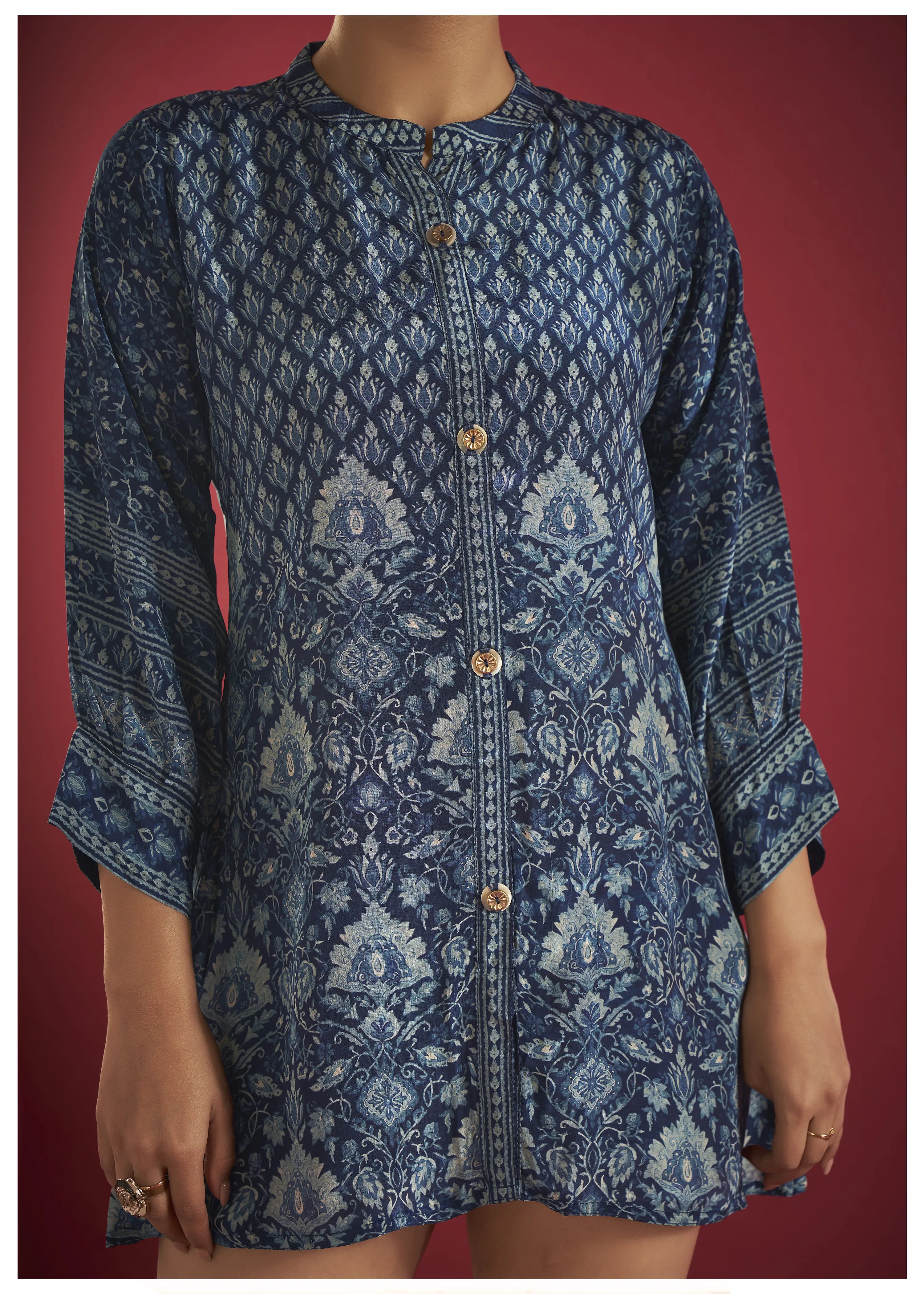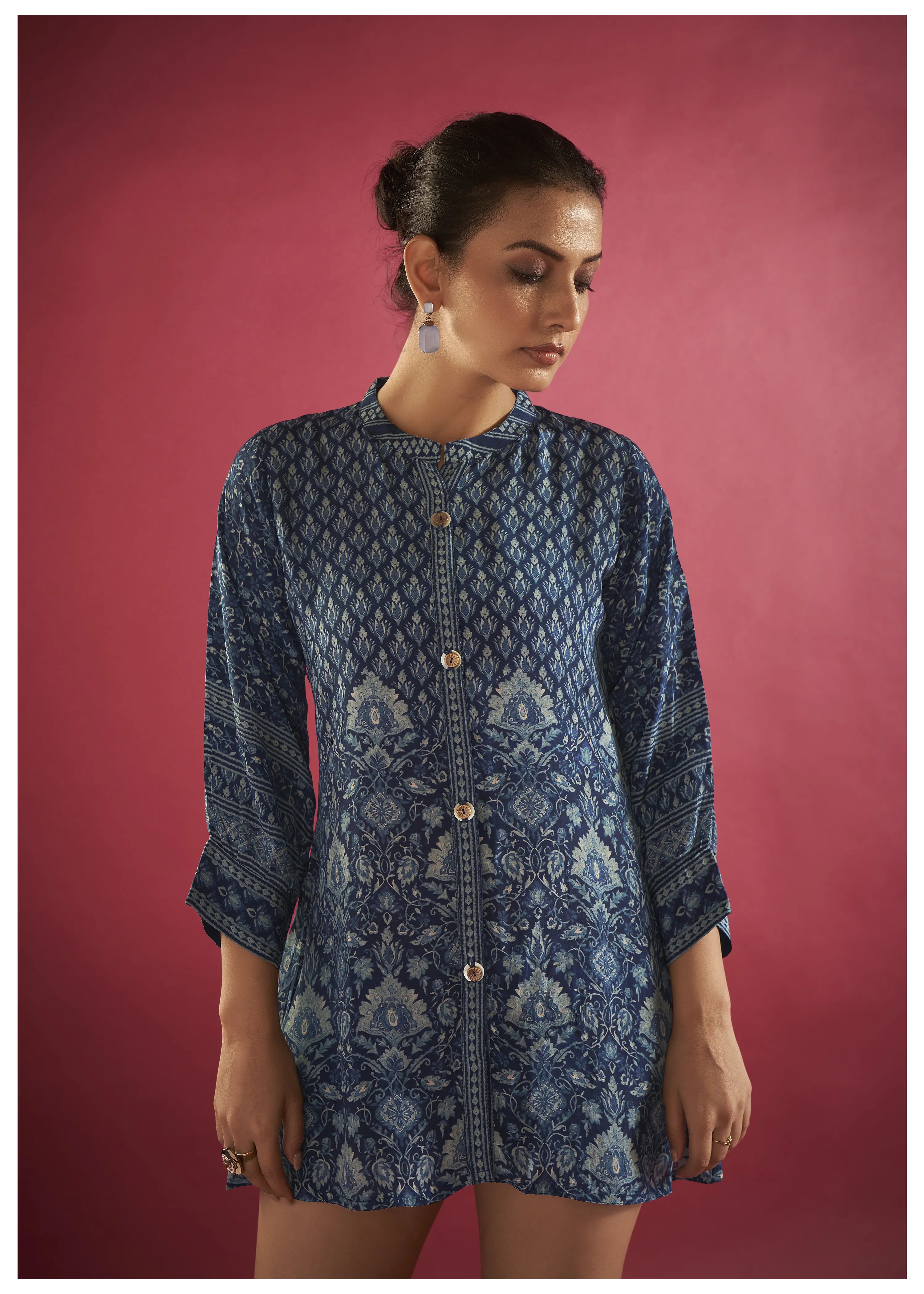 Add a touch of elegance to your casual collection with this blue printed muslin tunic. The eye-catching print, paired with a high-low hemline, offers a modern, chic look that’s perfect for relaxed outings or days at the office. The mandarin collar and 3/4th sleeves with cuffs elevate the design, while the button closure adds a classic touch of refinement.