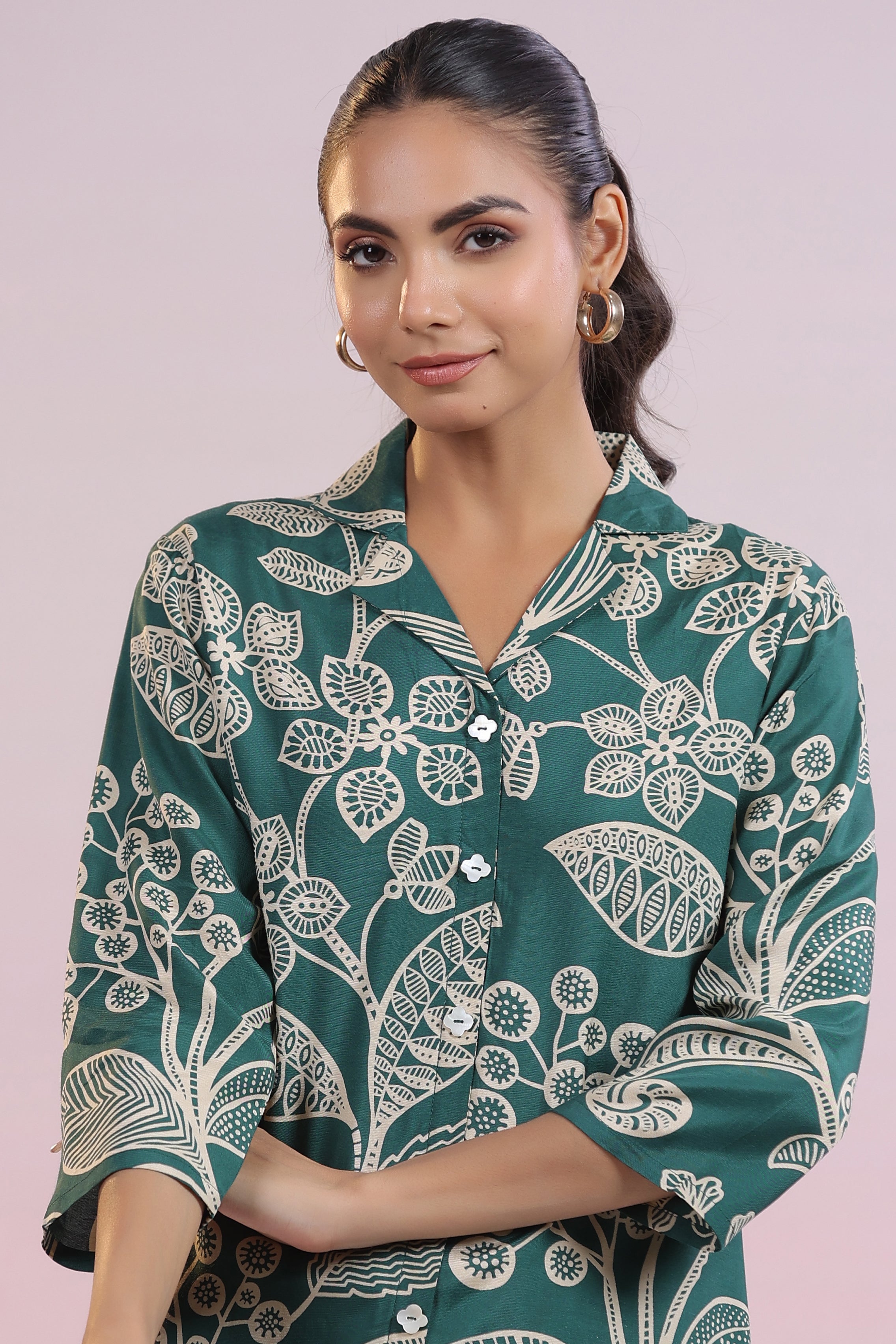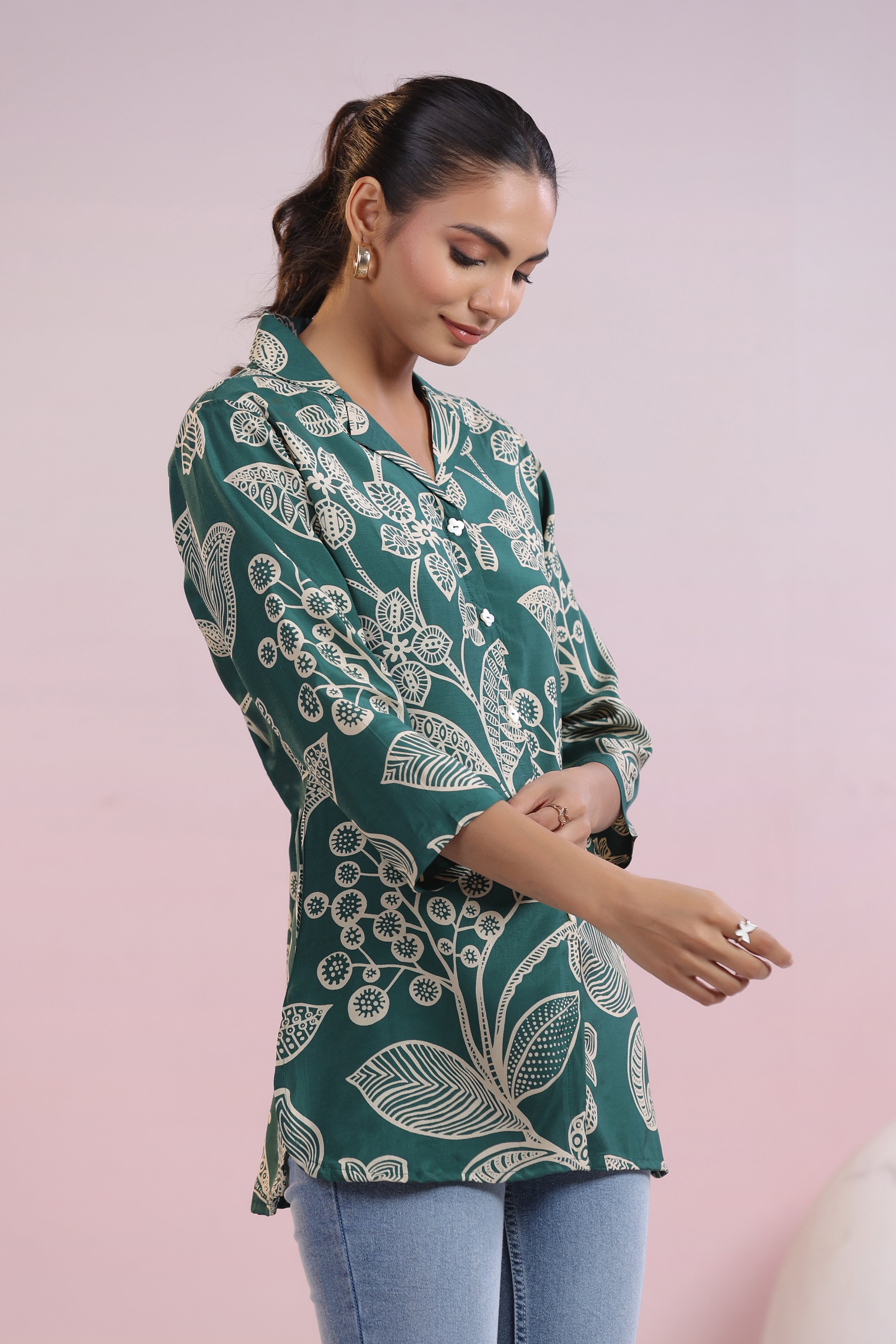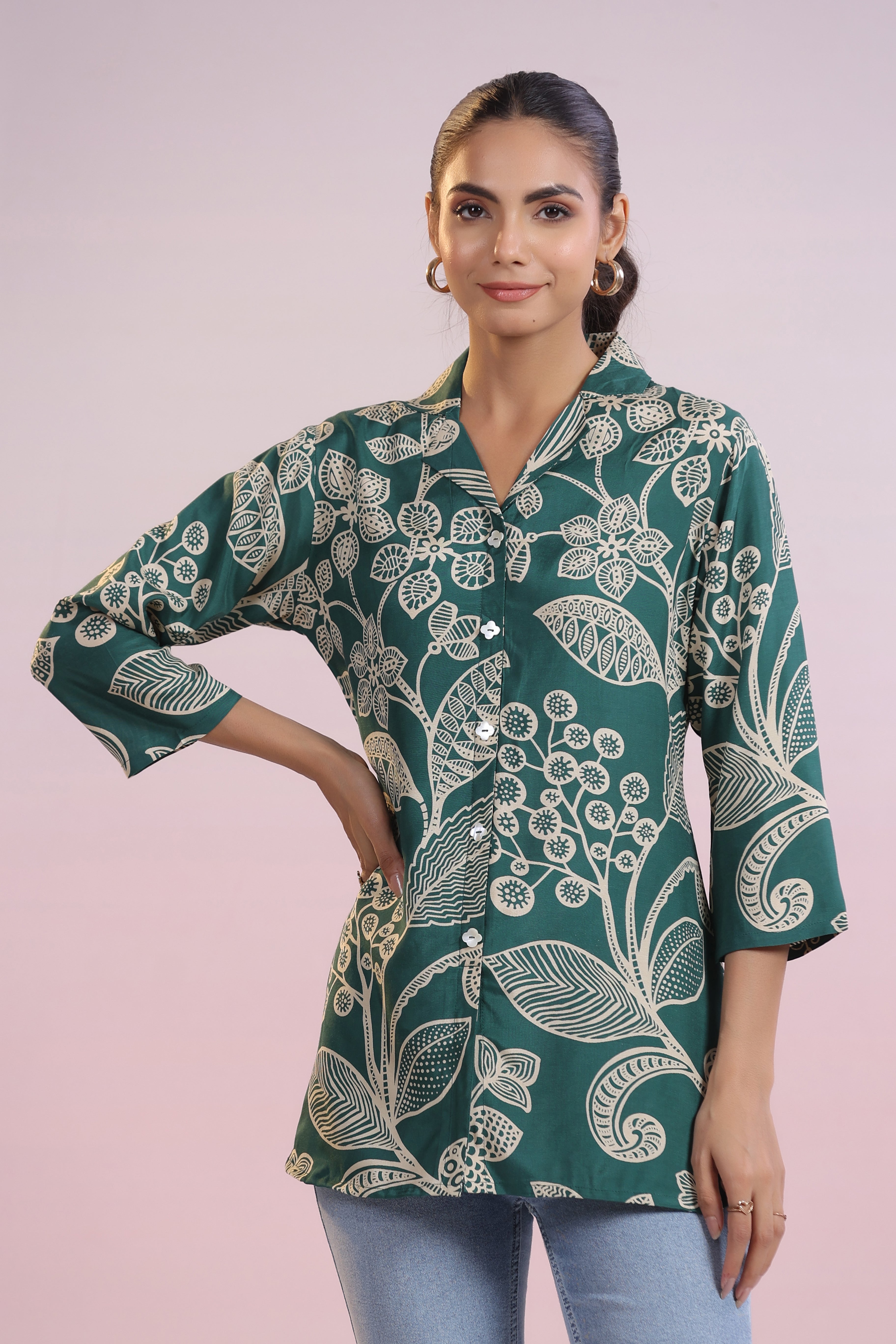 Elevate your style with this luxurious dark green tunic, featuring a stunning abstract floral print that adds a touch of artistic charm to your wardrobe. Designed with a refined notch collar and 3/4th sleeves, this tunic is crafted from sumptuous Russian silk, offering a perfect balance of comfort and elegance. The straight hem and regular fit create a flattering silhouette, making it an ideal choice for both casual outings and evening gatherings.