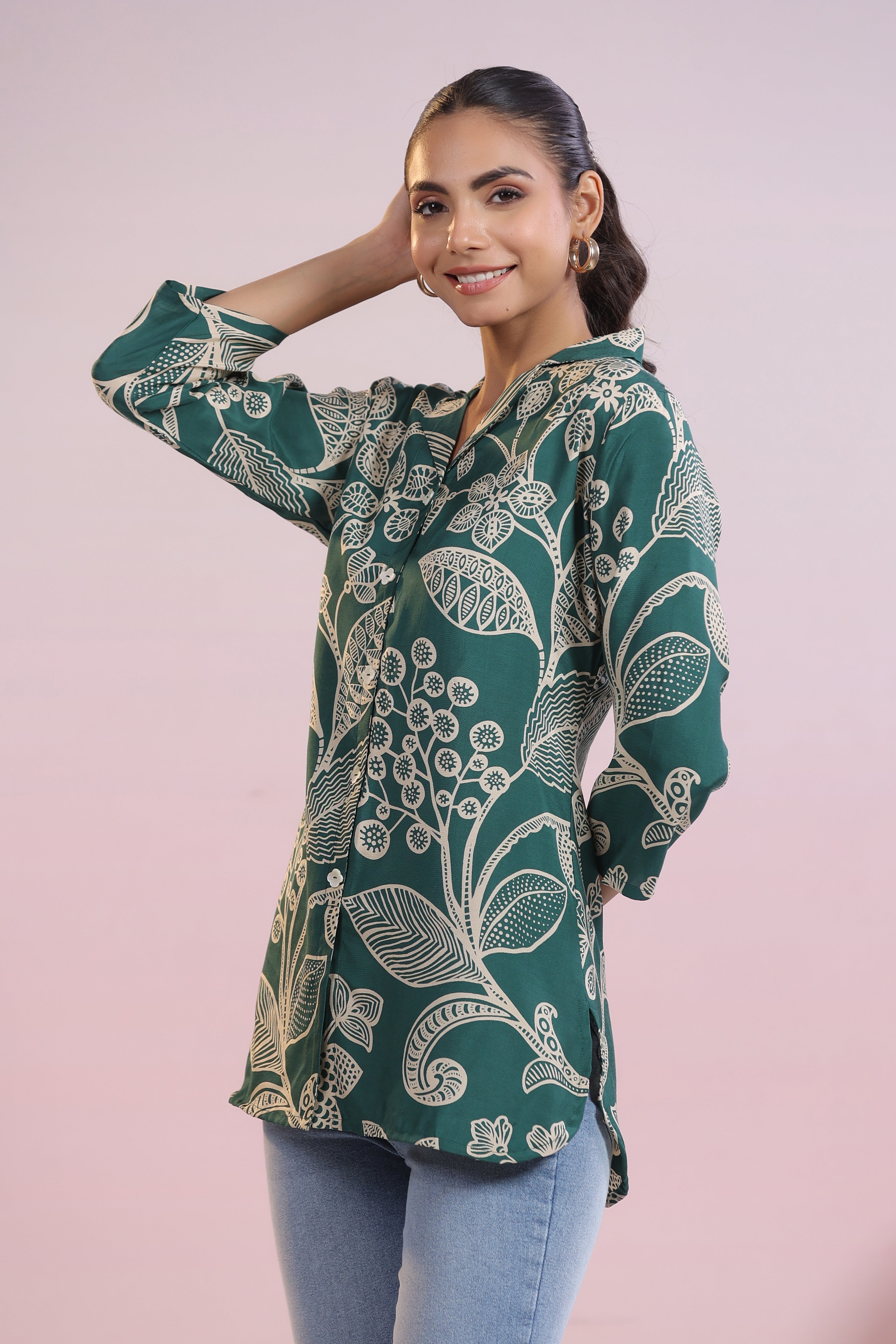 Add a touch of sophistication to your wardrobe with this dark green abstract floral tunicwhere luxury meets effortless style!