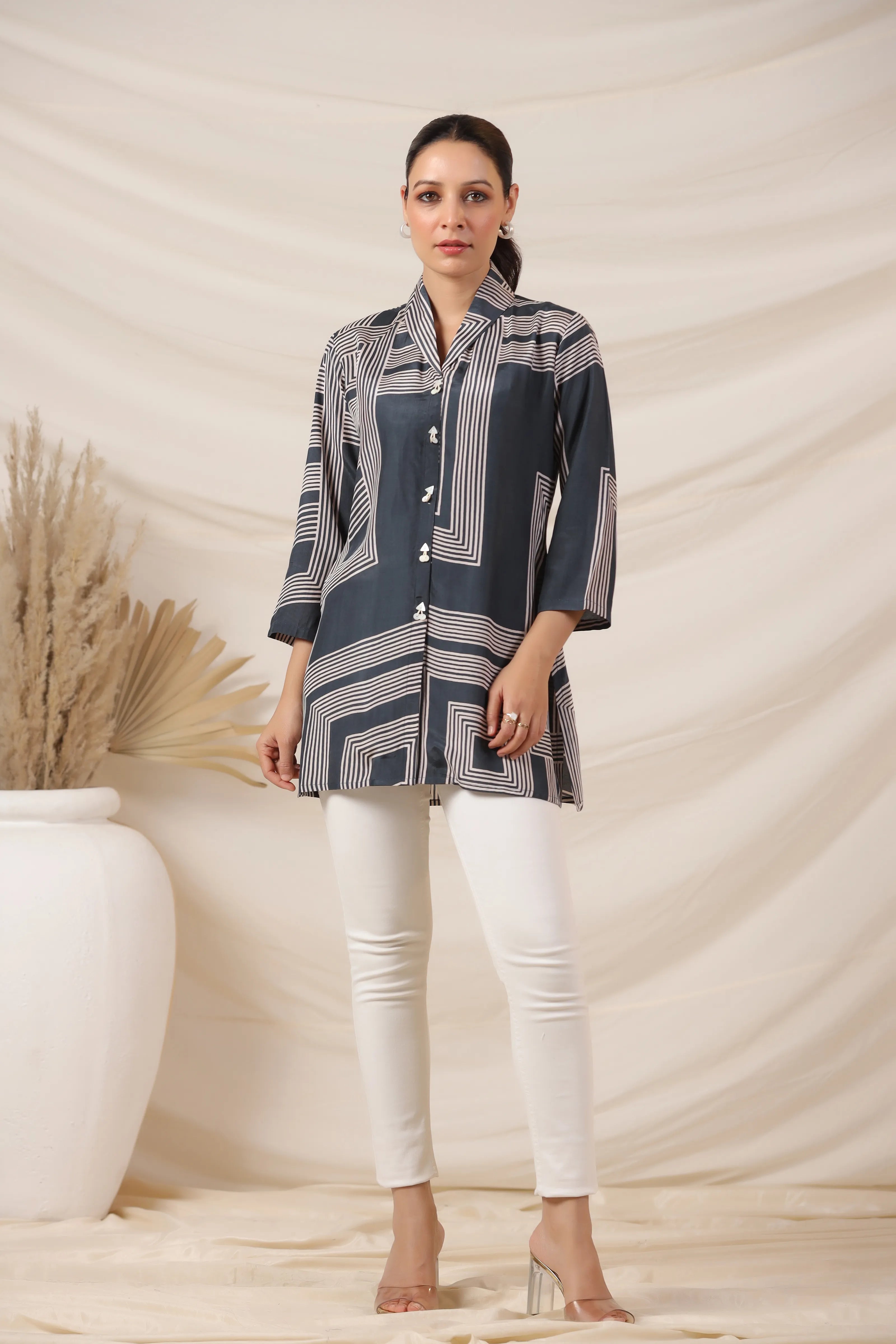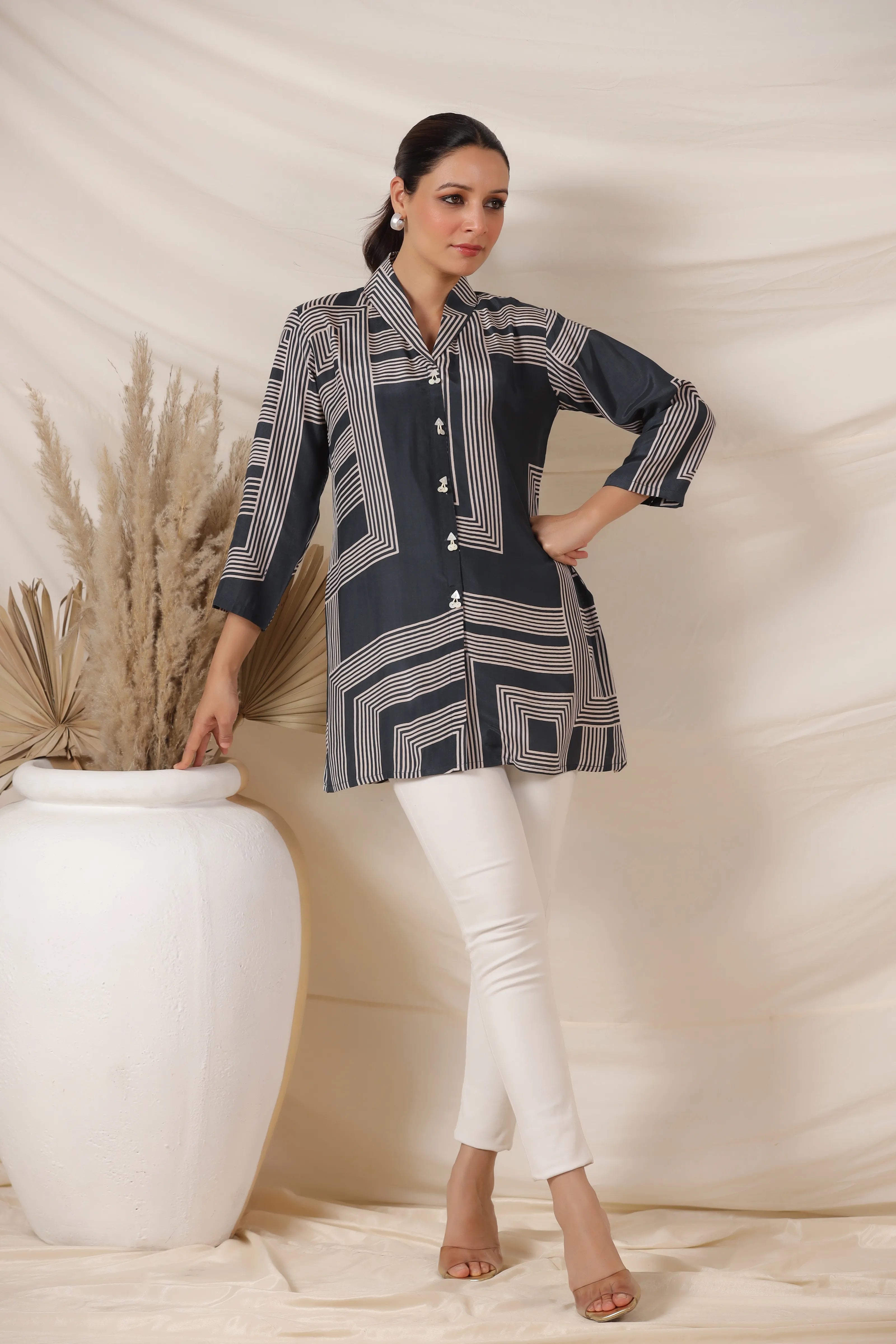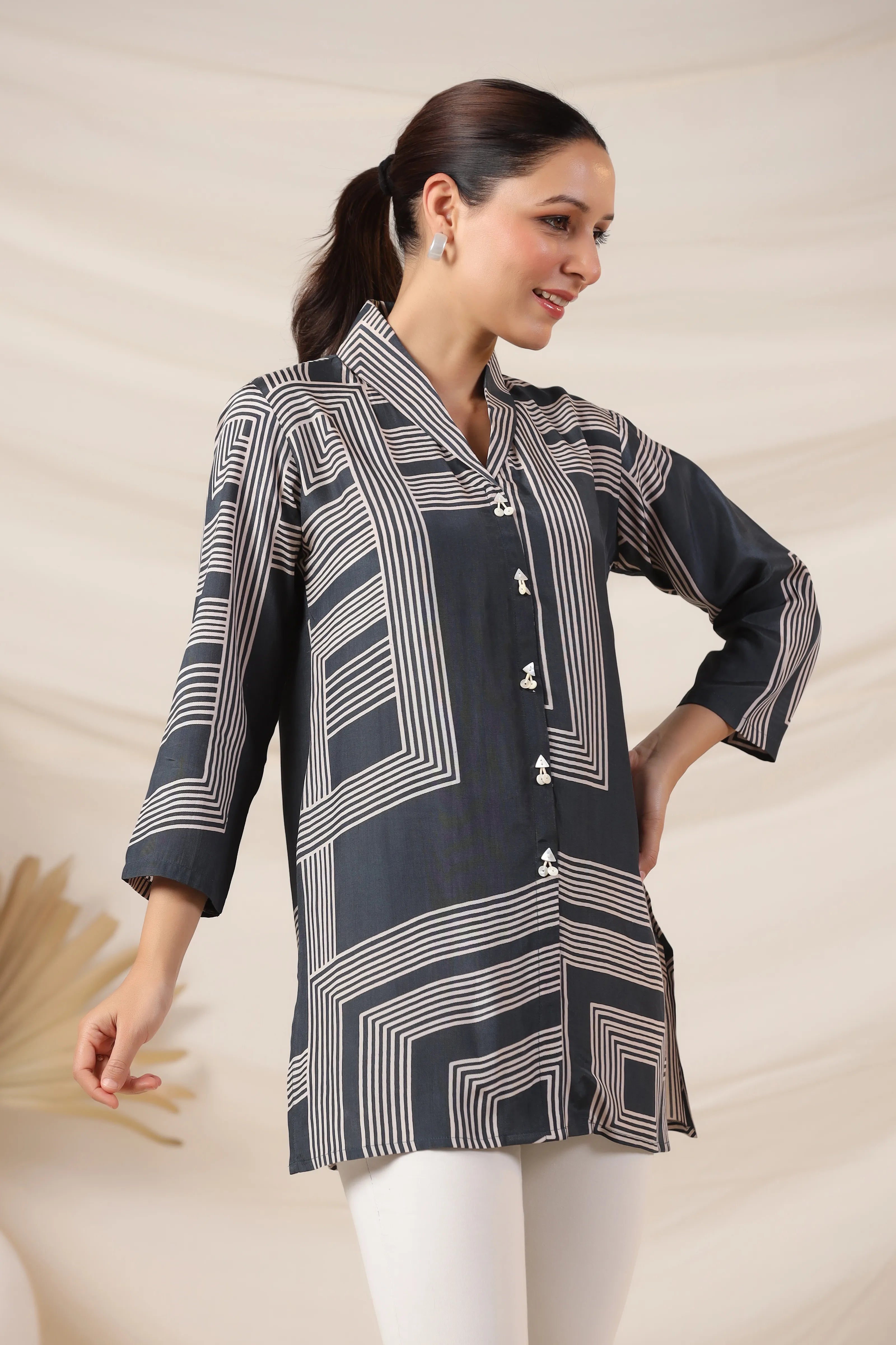 Elevate your wardrobe with this sophisticated dark grey top featuring an abstract cream stripe print that adds a modern edge to a timeless silhouette. Crafted in smooth, flowy Russian silk, this button-front top comes with 3/4th sleeves, making it a perfect choice for both work and casual outings.