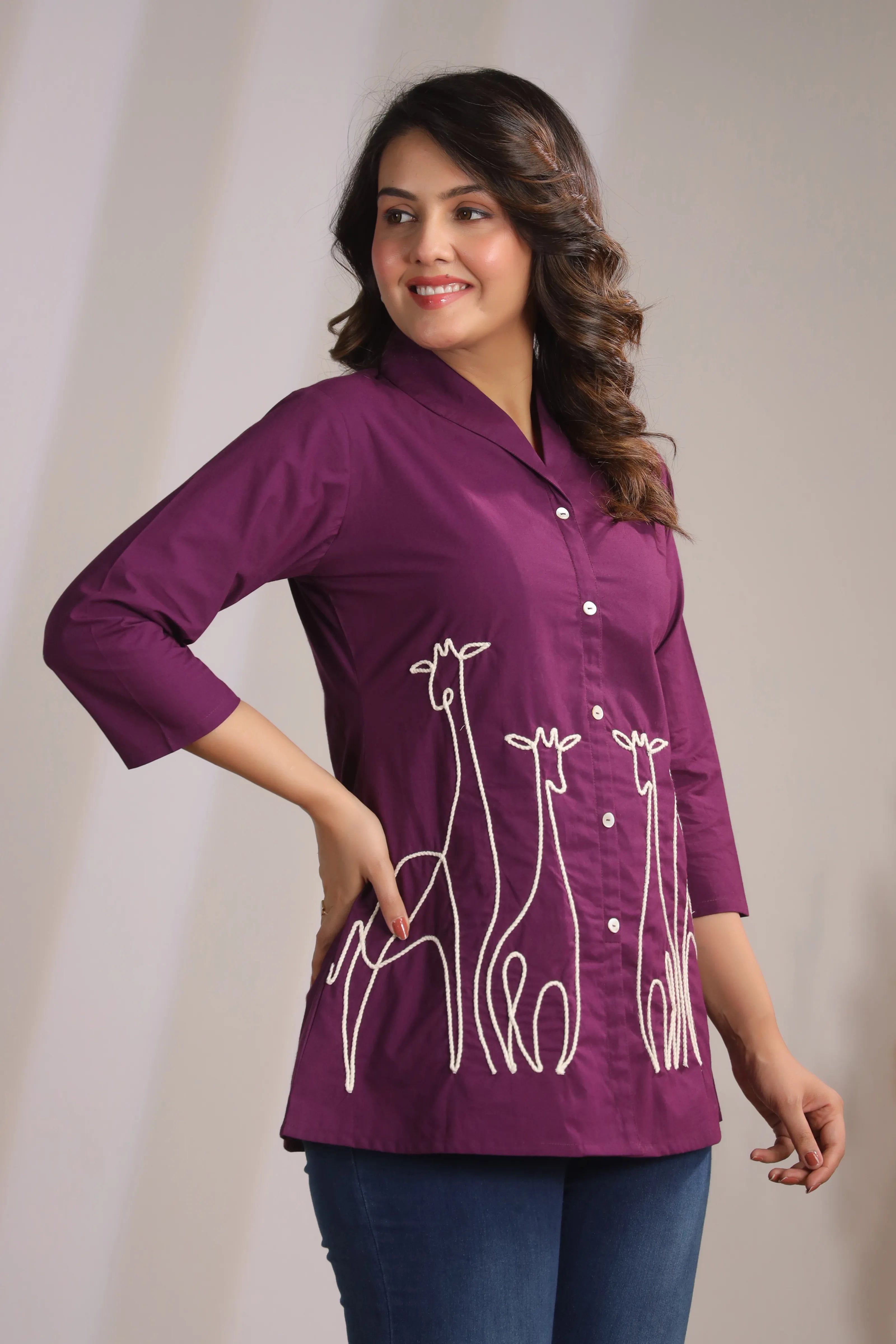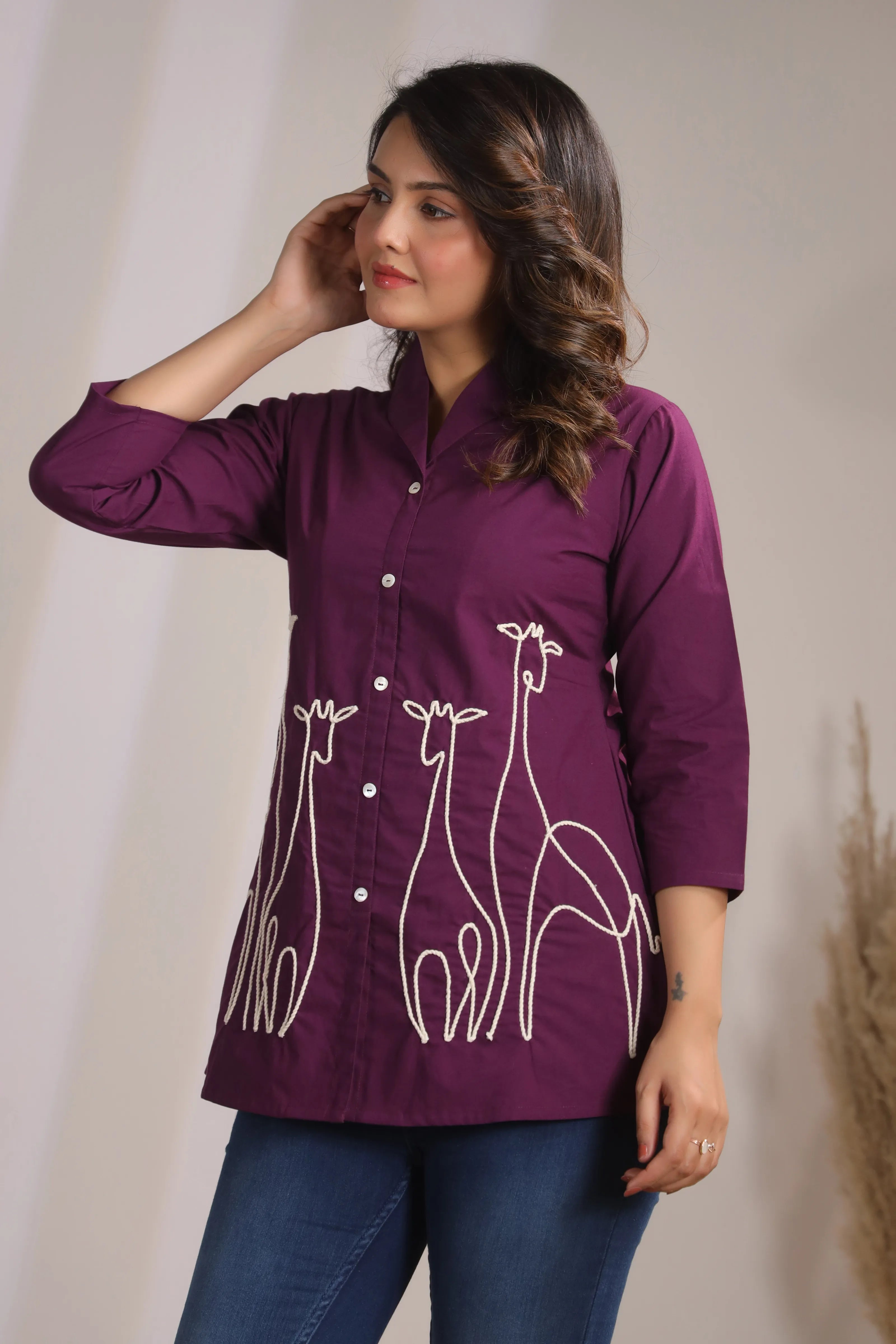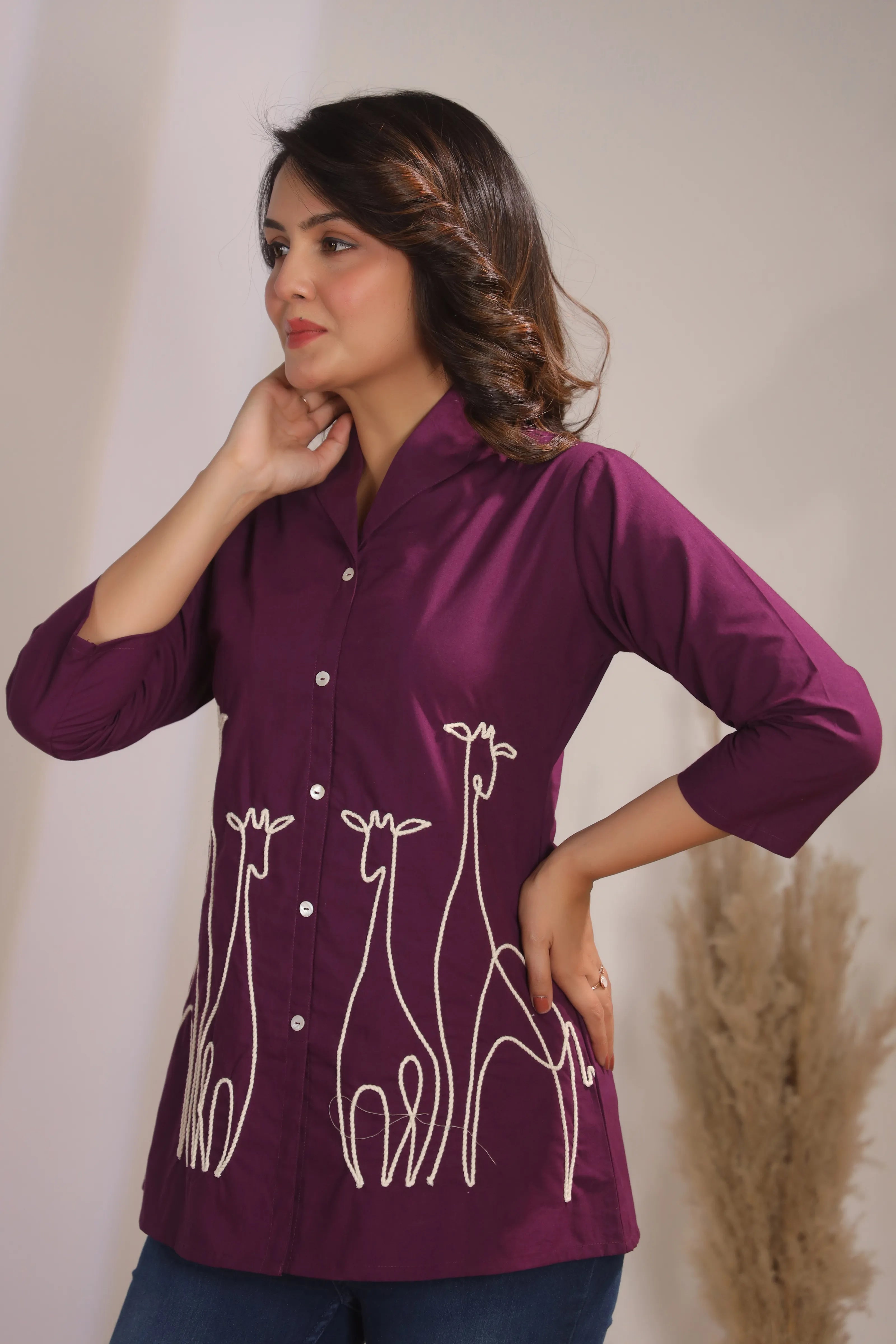 Key Features: • Fabric: 100% cotton cambric – breathable, soft & durable • Color: Dark purple with contrast ivory embroidery • Design Details: Corded animal motif embroidery • Neckline: Lapel collar with shell button-down front • Sleeves: 3/4th sleeve for versatile styling • Fit: Relaxed yet structured silhouette