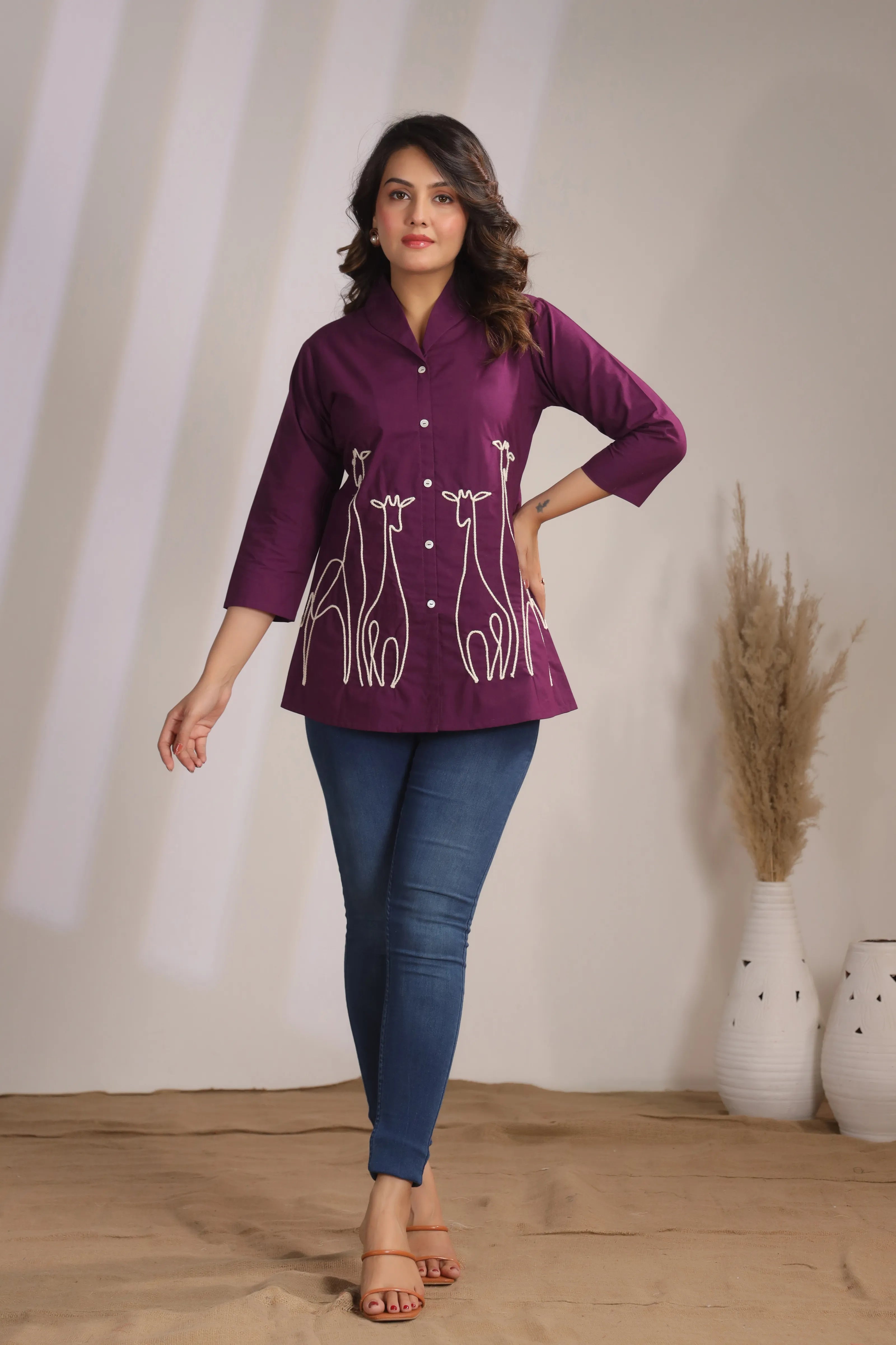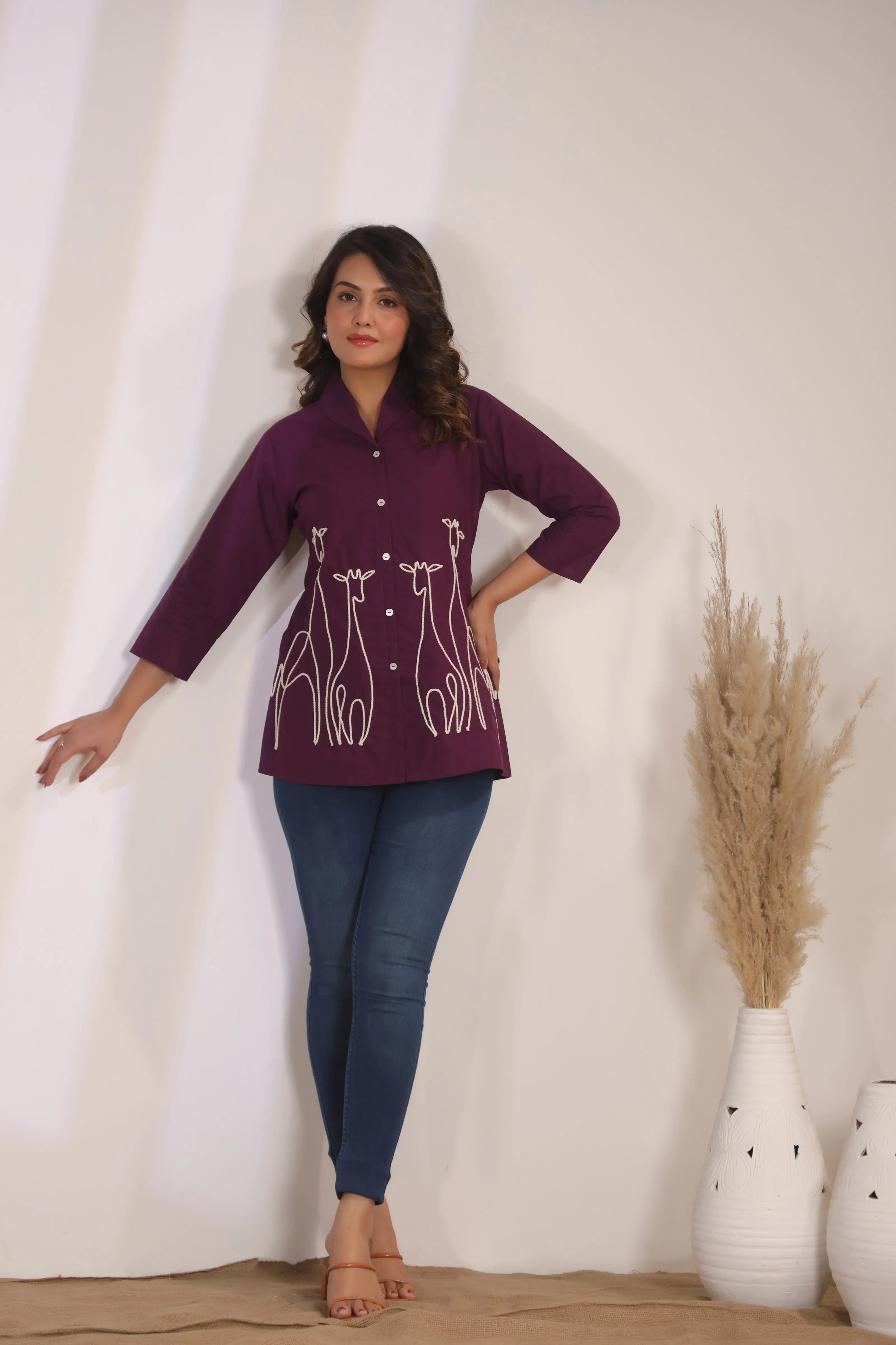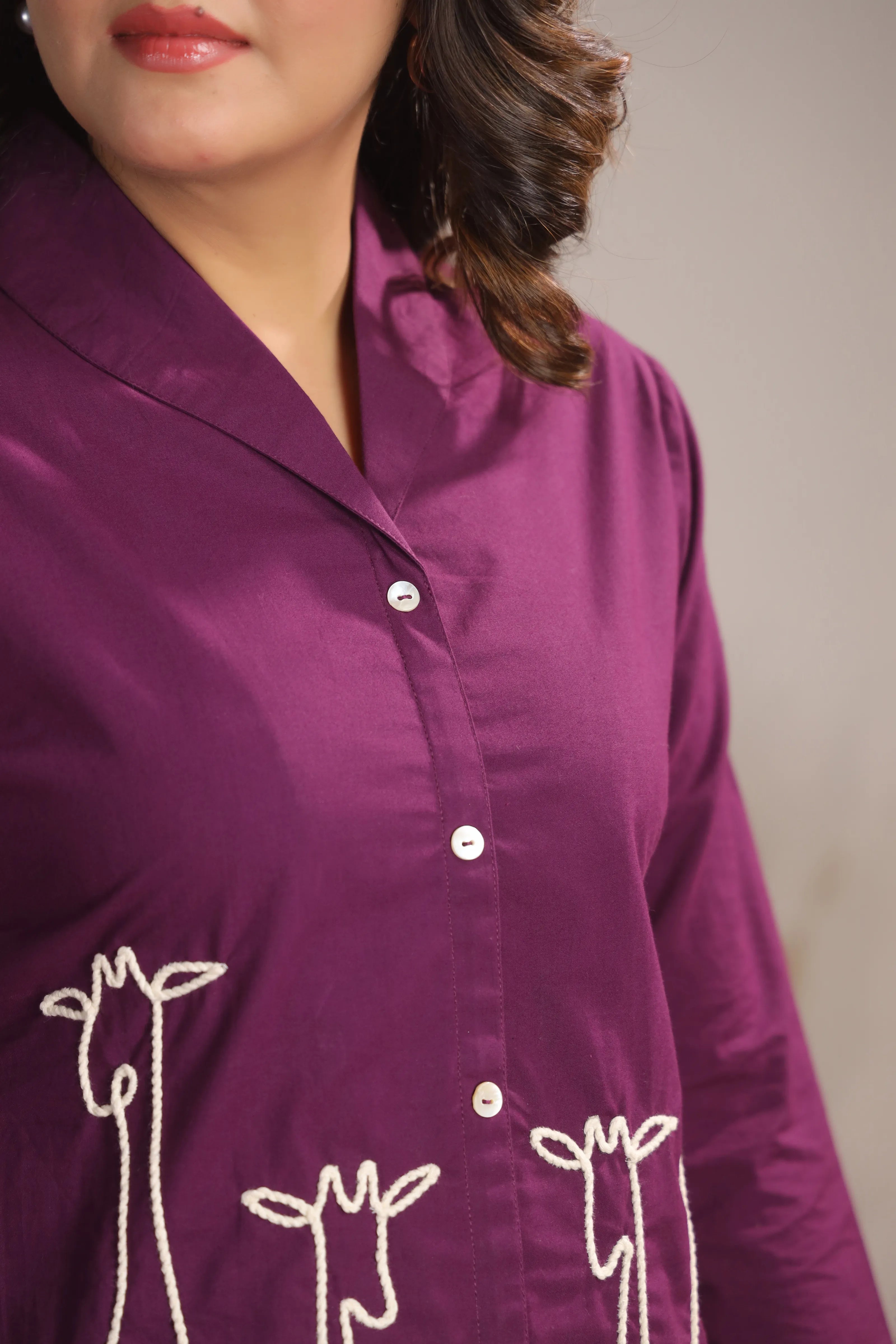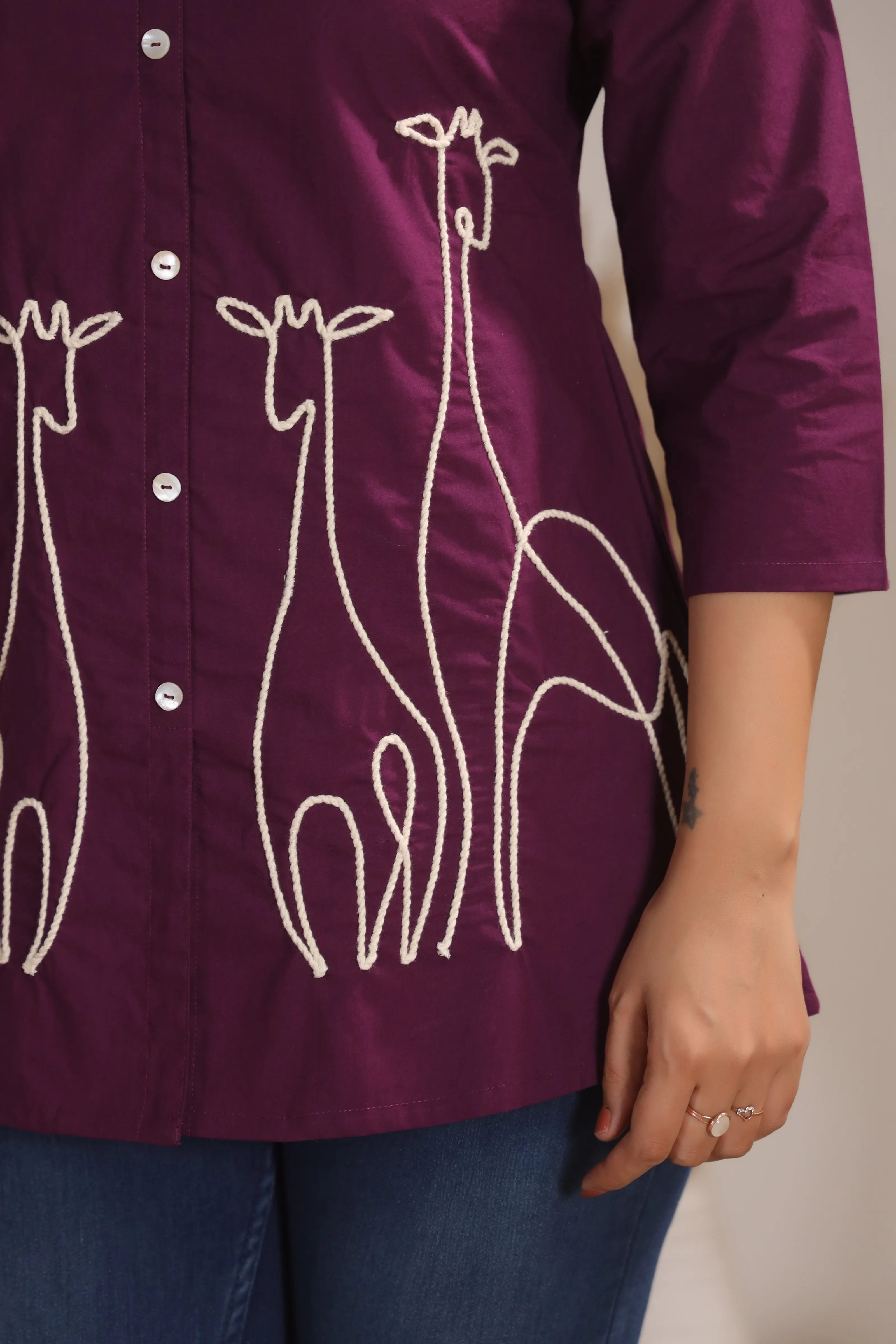 Key Features: • Fabric: 100% cotton cambric – breathable, soft & durable • Color: Dark purple with contrast ivory embroidery • Design Details: Corded animal motif embroidery • Neckline: Lapel collar with shell button-down front • Sleeves: 3/4th sleeve for versatile styling • Fit: Relaxed yet structured silhouette