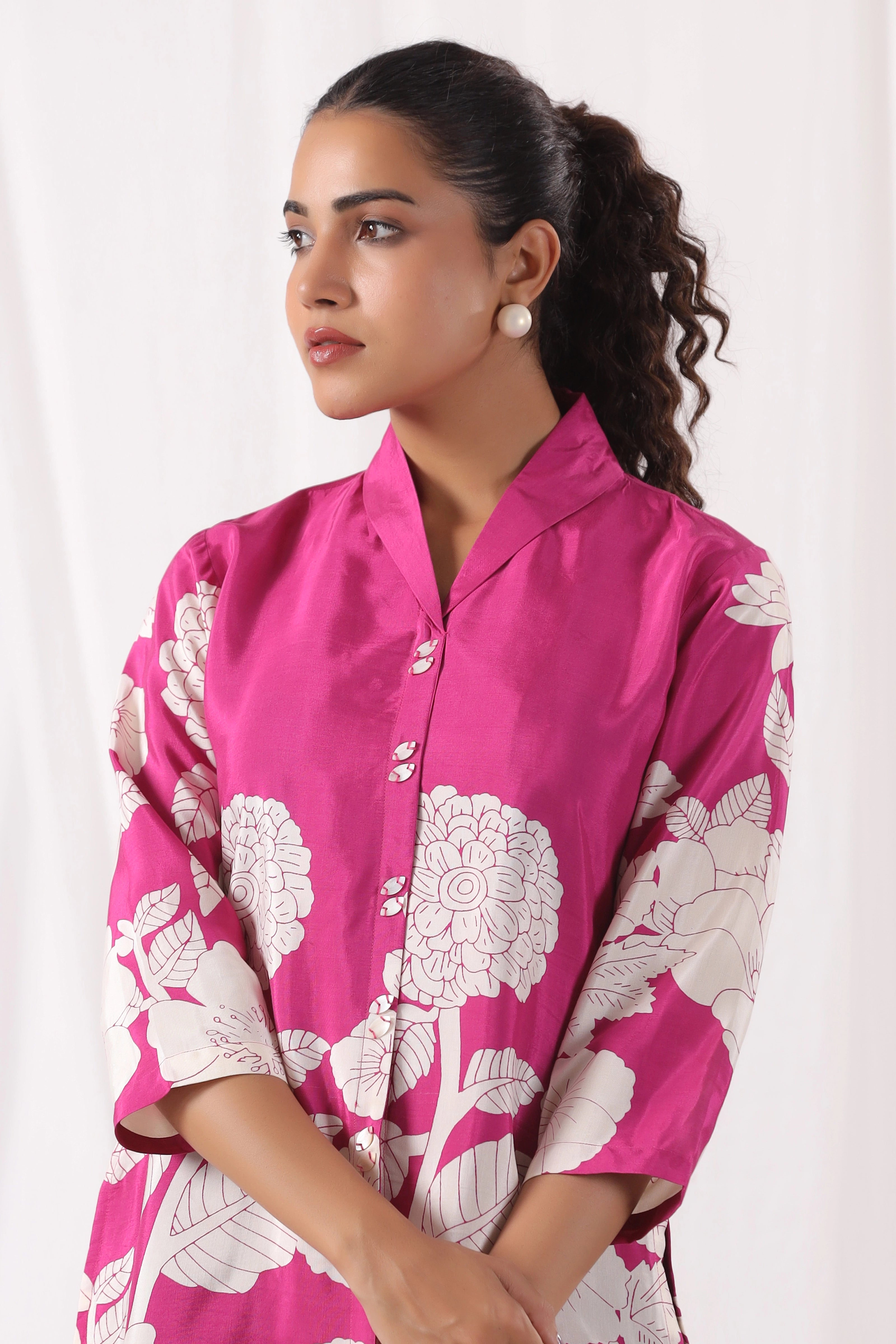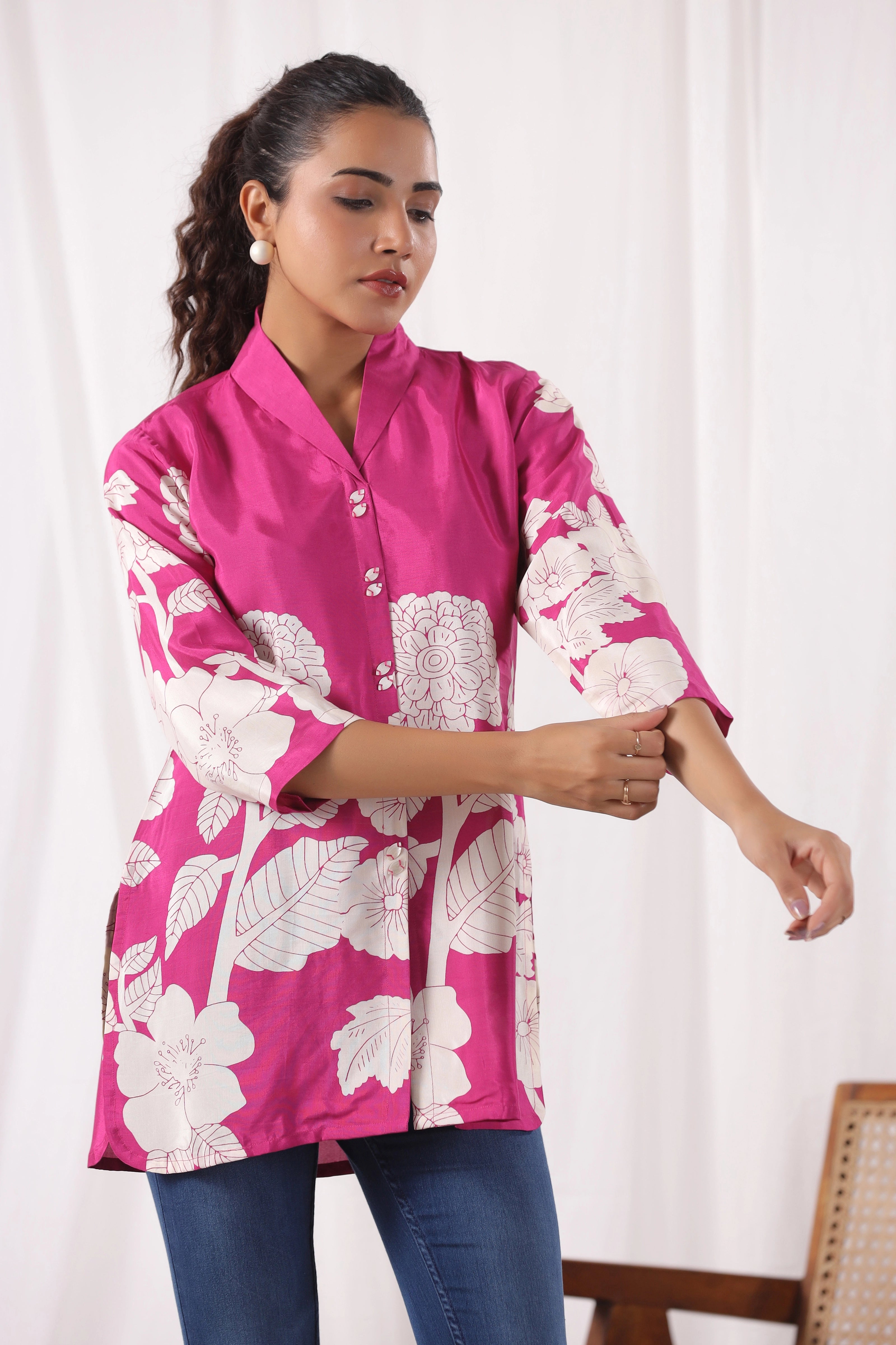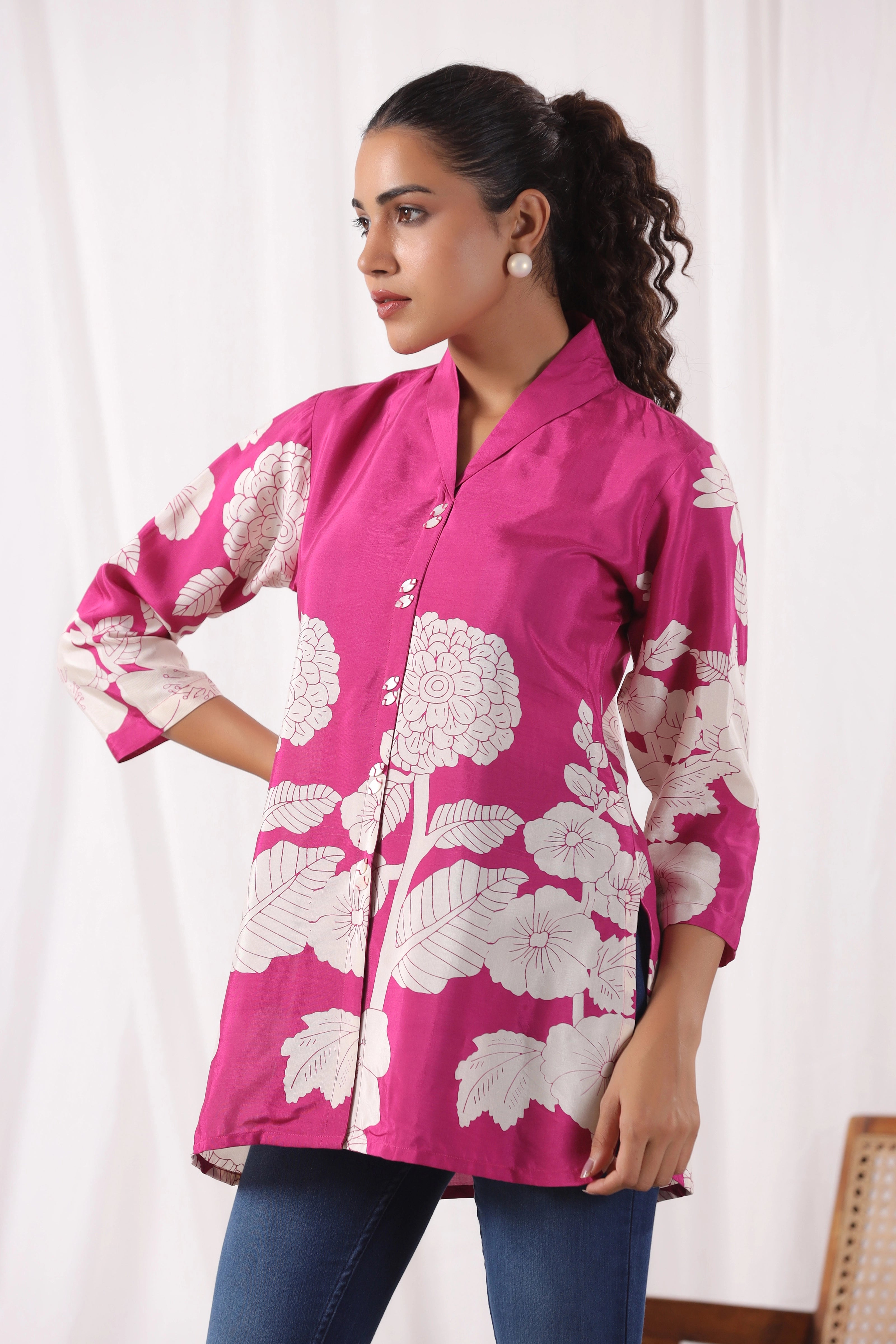 Bring vibrant elegance to your wardrobe with this Fuchsia Pink Base Bold Floral Top in luxurious Russian silk. Featuring a striking cream floral placement print, this top is designed with a lapel collar and stylish 3/4th sleeves, offering a modern take on timeless sophistication. The silky finish adds a refined touch, perfect for both day outings and elevated evenings.