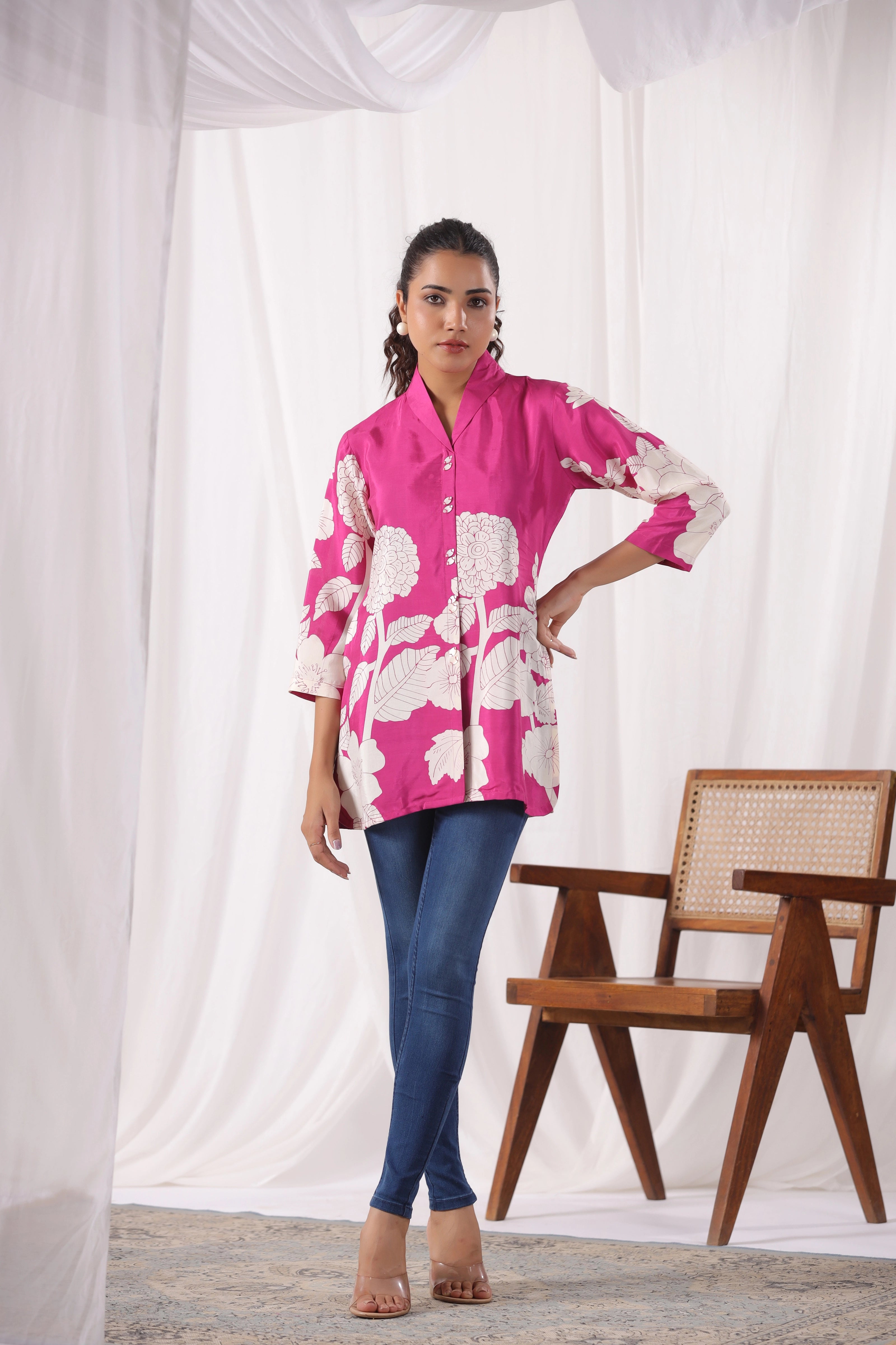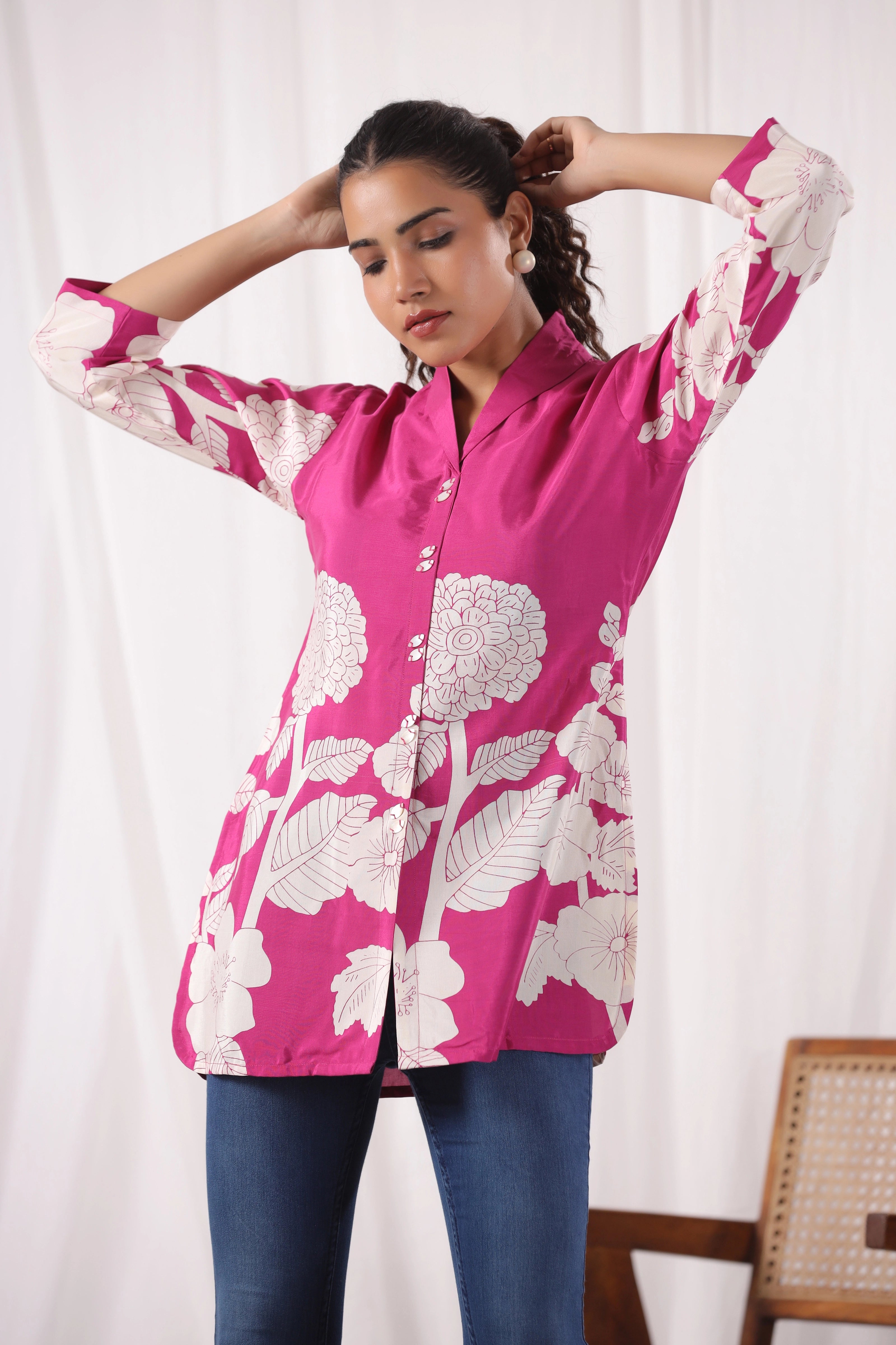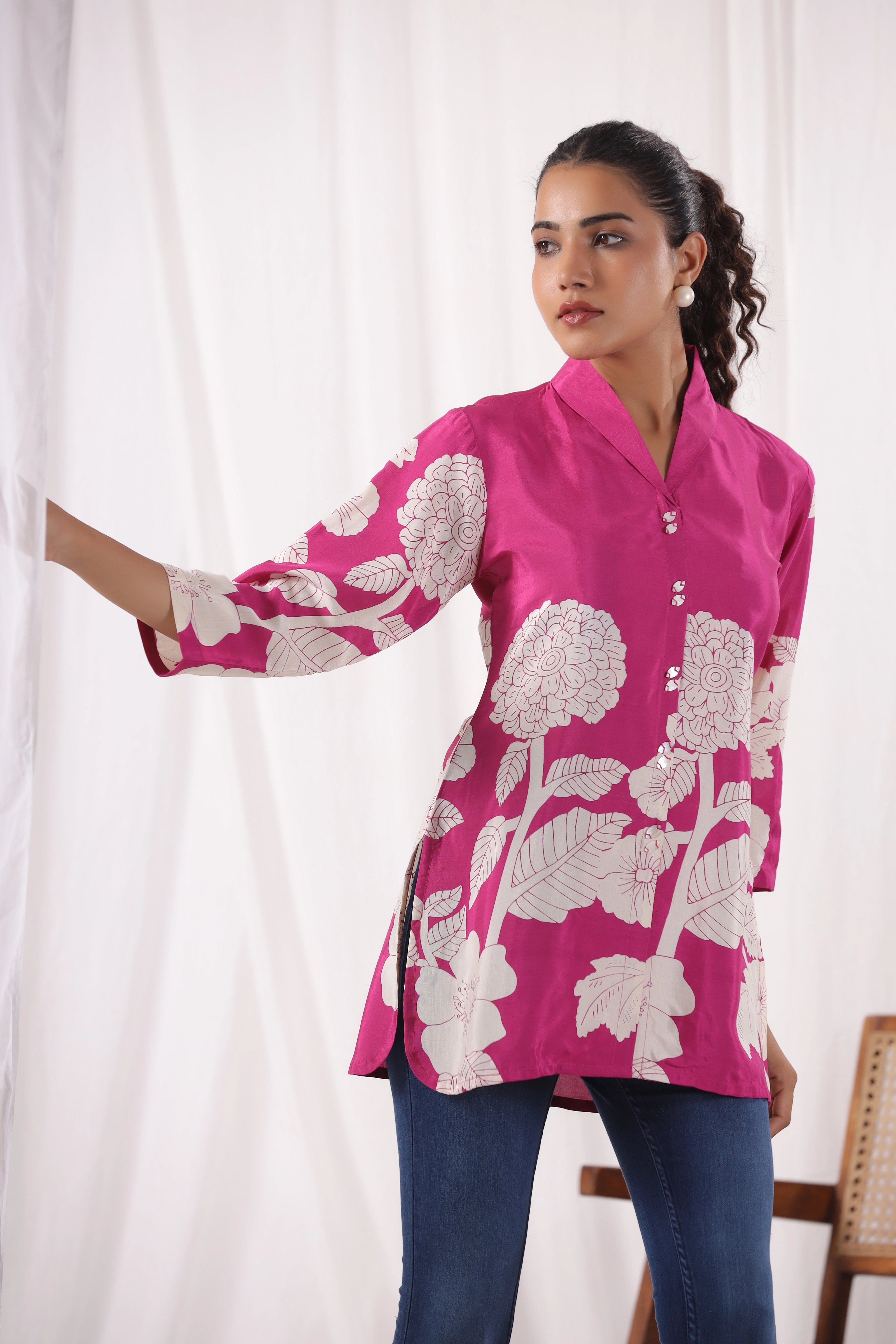 Bring vibrant elegance to your wardrobe with this Fuchsia Pink Base Bold Floral Top in luxurious Russian silk. Featuring a striking cream floral placement print, this top is designed with a lapel collar and stylish 3/4th sleeves, offering a modern take on timeless sophistication. The silky finish adds a refined touch, perfect for both day outings and elevated evenings.