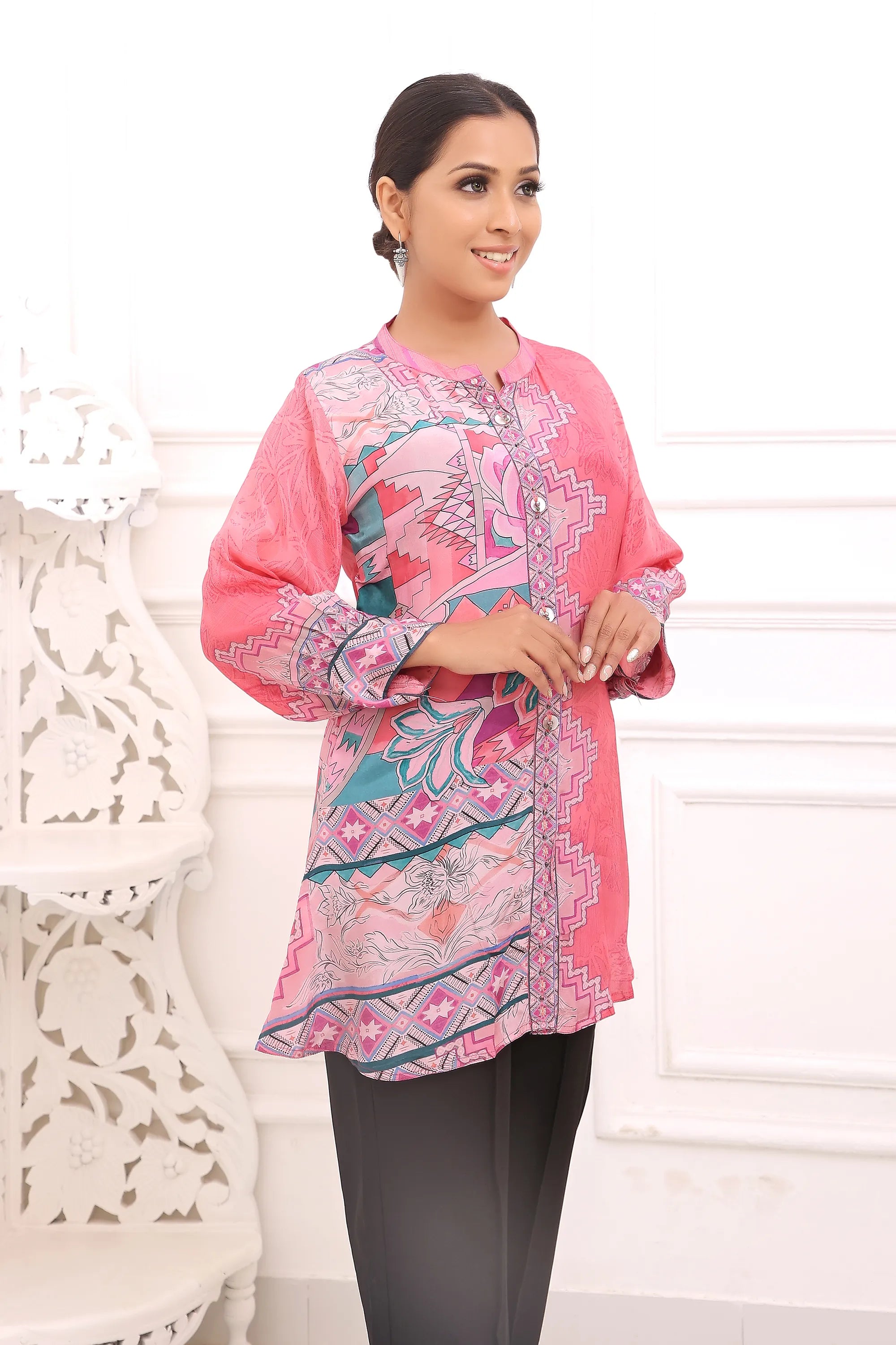 Add a burst of color to your wardrobe with the Fuchsia Pink Tunic, featuring a unique blend of geometric and floral prints. Designed with a mandarin collar and full sleeves with cuffs, this tunic combines modern style with traditional elements. The curved hem adds a flattering finish to the design, while the button closure completes the look.