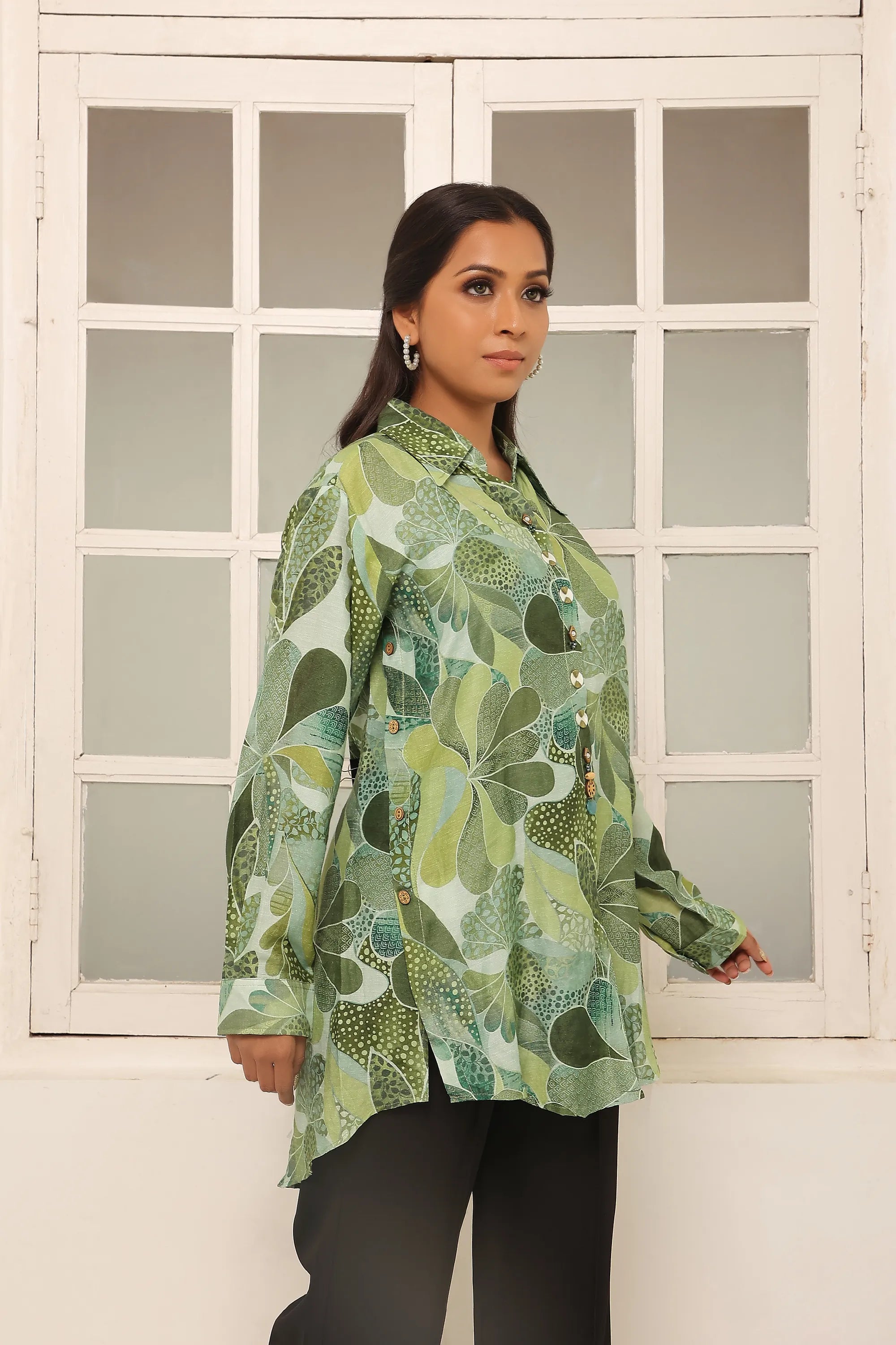 Green Floral Print Shirt-Style Tunic with Bead Detailing