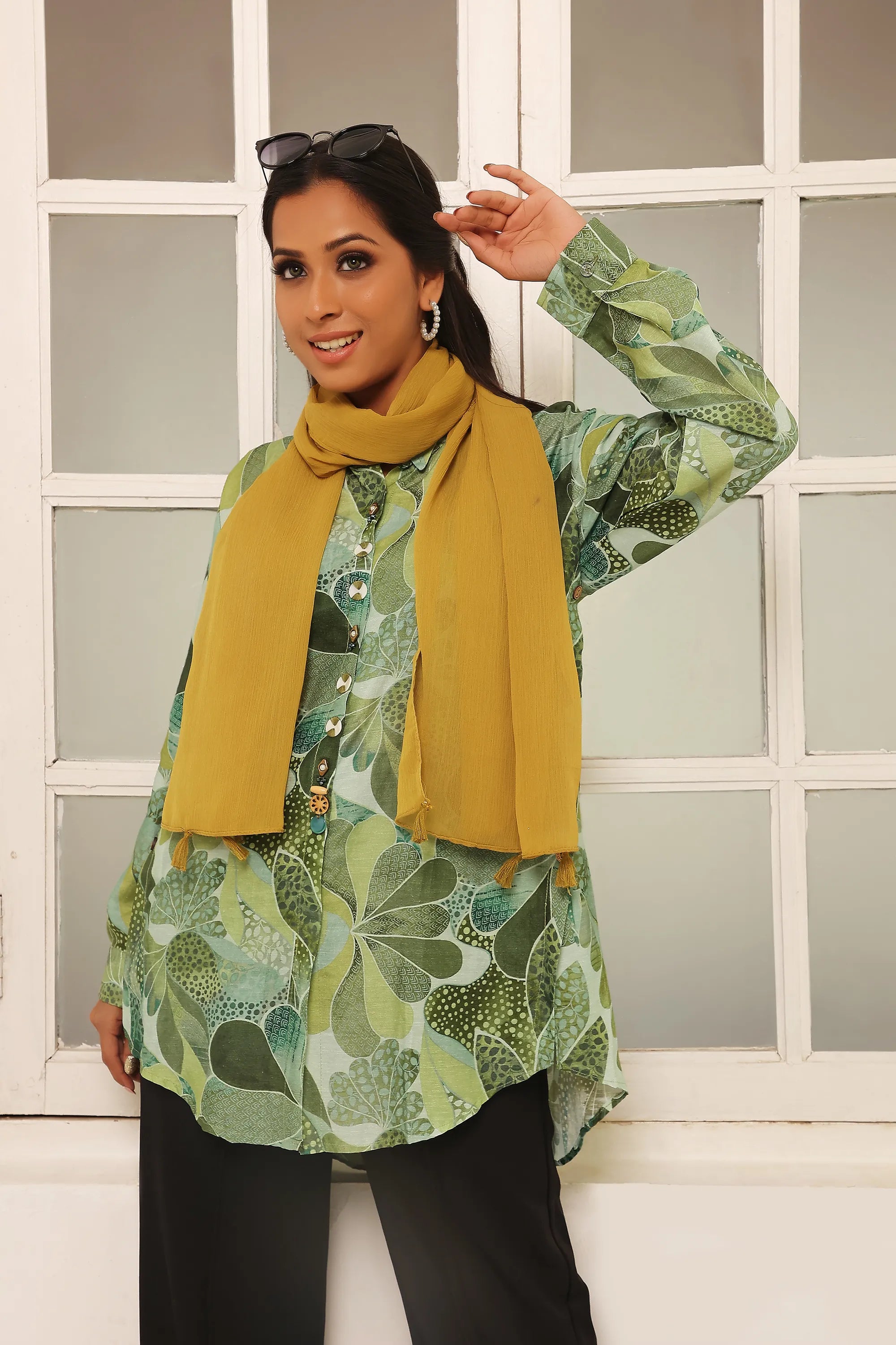 Refresh your wardrobe with this elegant Green Floral Print Tunic, designed for a chic and versatile look. Made from lightweight muslin fabric, this tunic is both breathable and stylish, perfect for casual outings or semi-formal events.