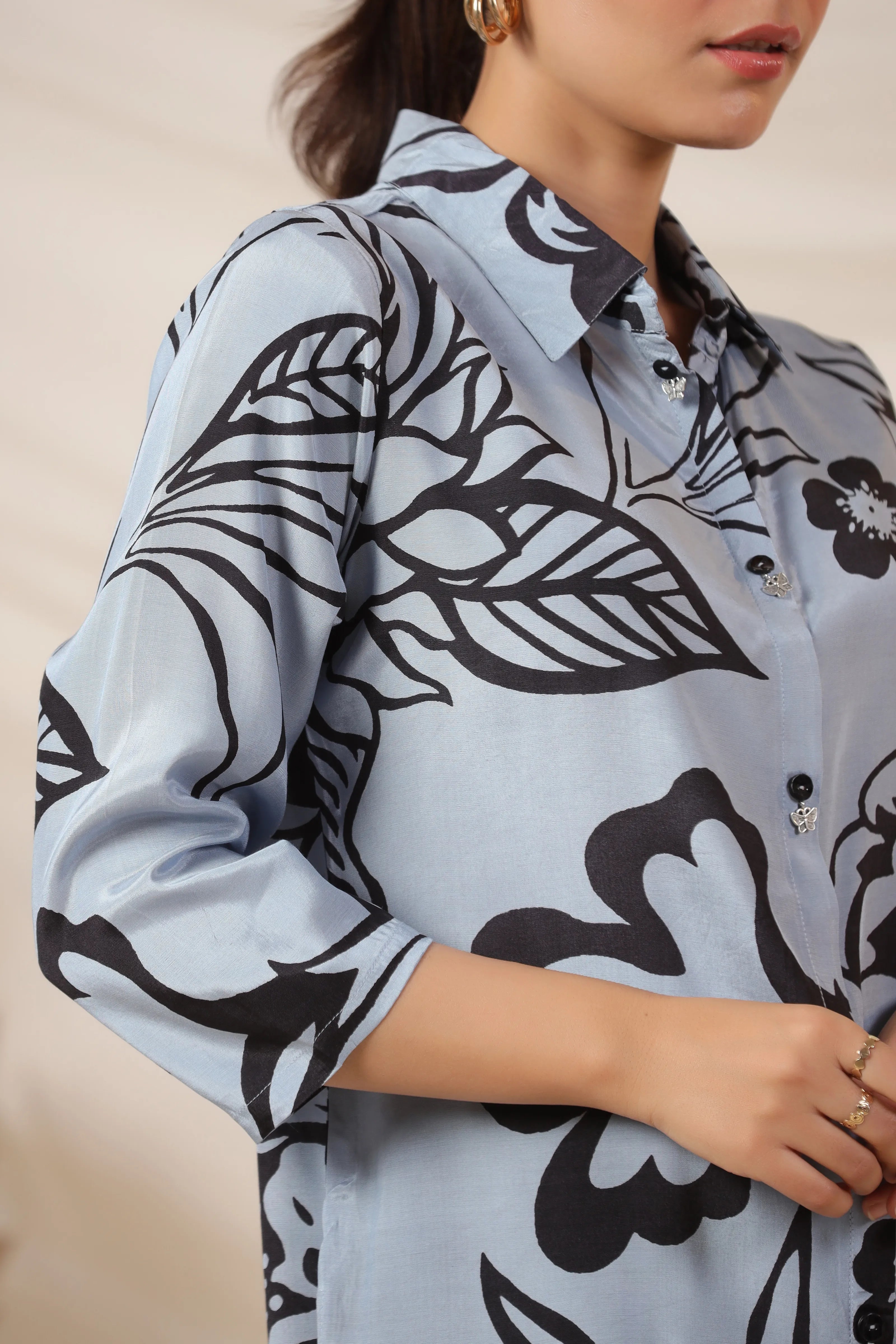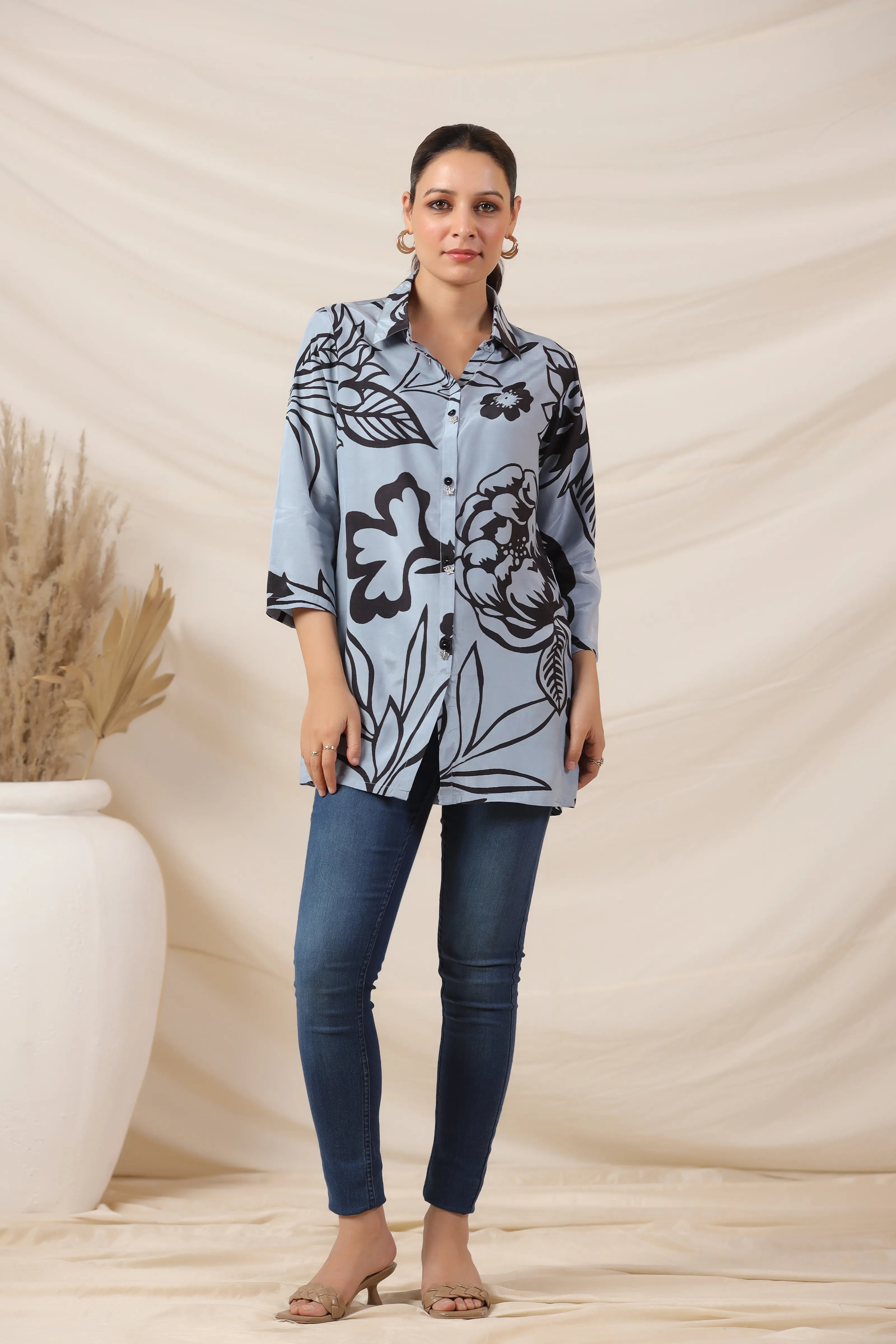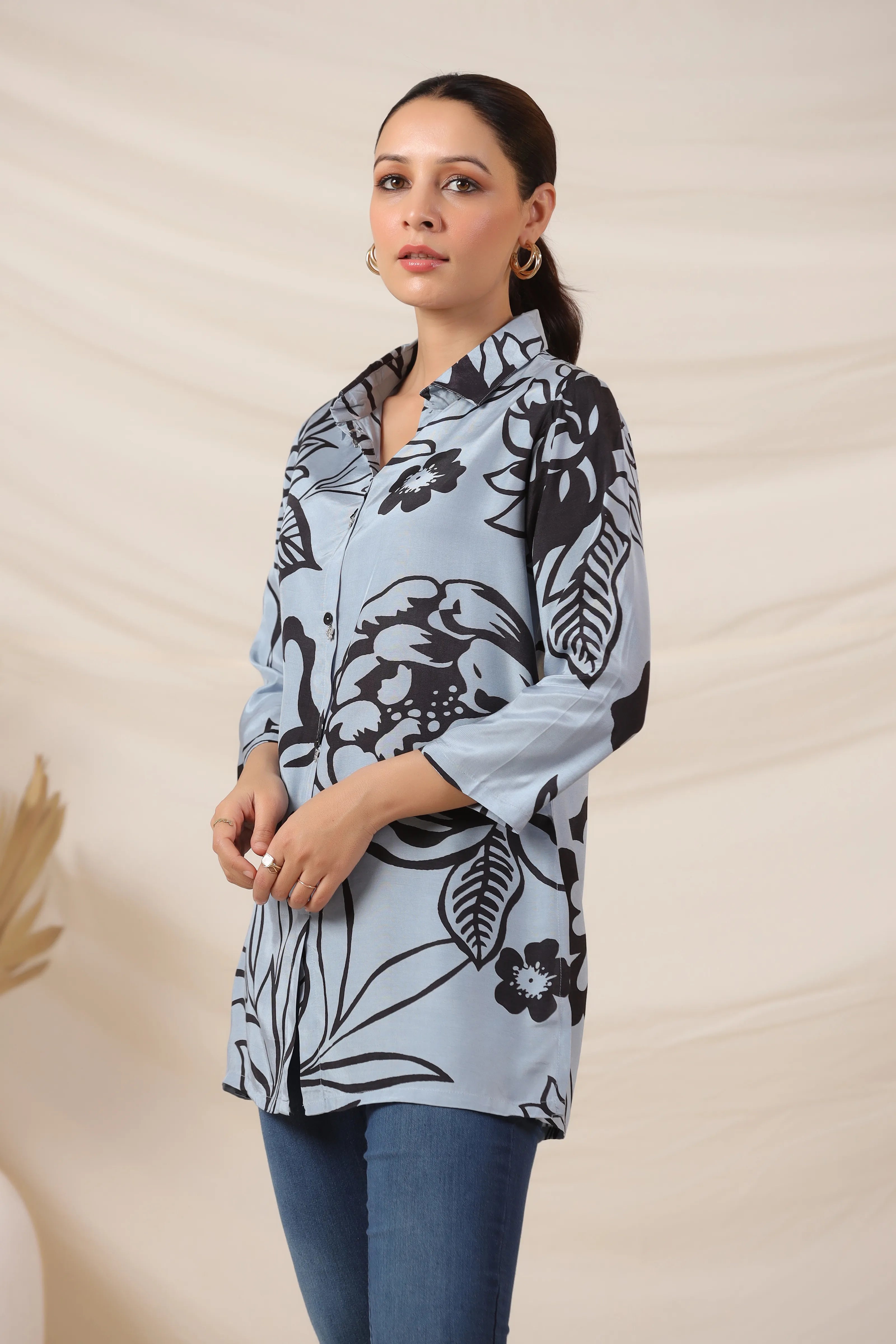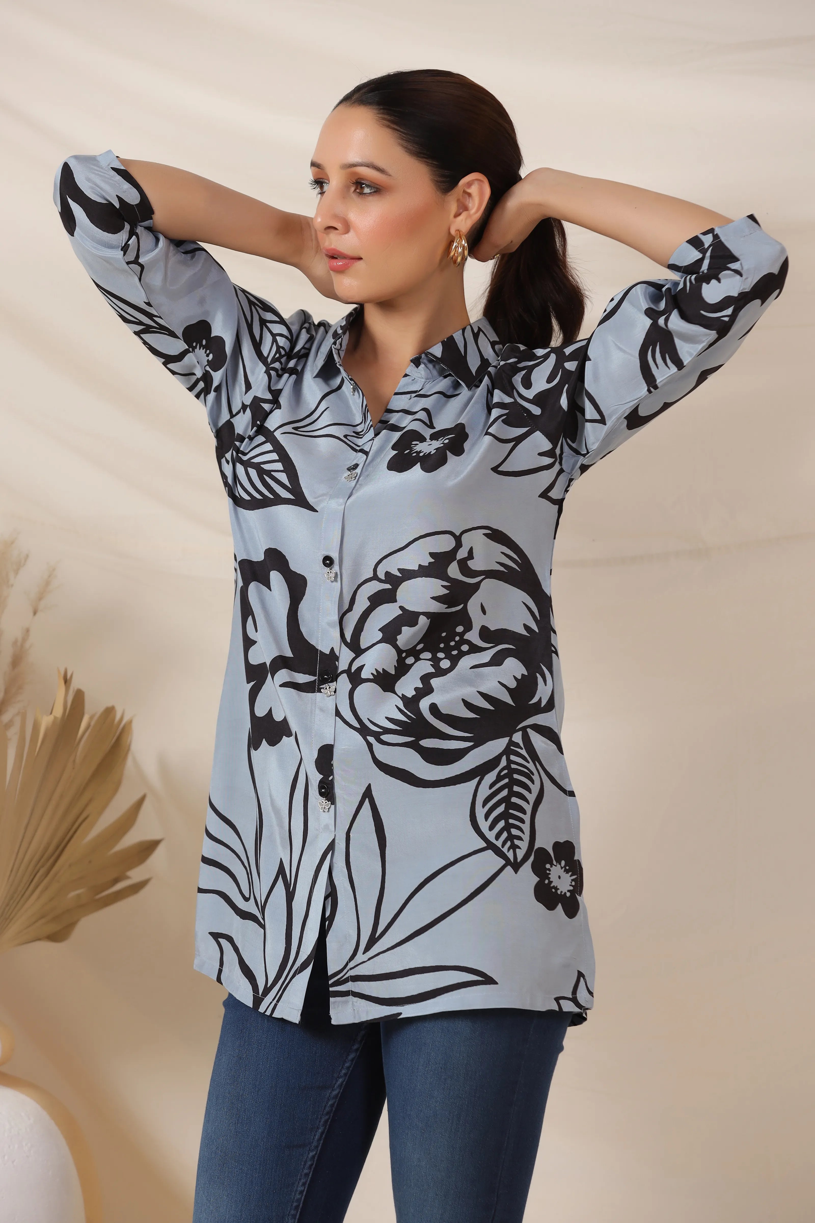 Chic, clean, and confident—this iceberg blue shirt top brings an artistic edge to everyday dressing. Featuring oversized black floral sketches on a cool-toned base, this design redefines power dressing with a soft, flowy twist. Crafted in luxurious Russian silk, the top offers a graceful fall with a light sheen, perfect for both desk and dinner.