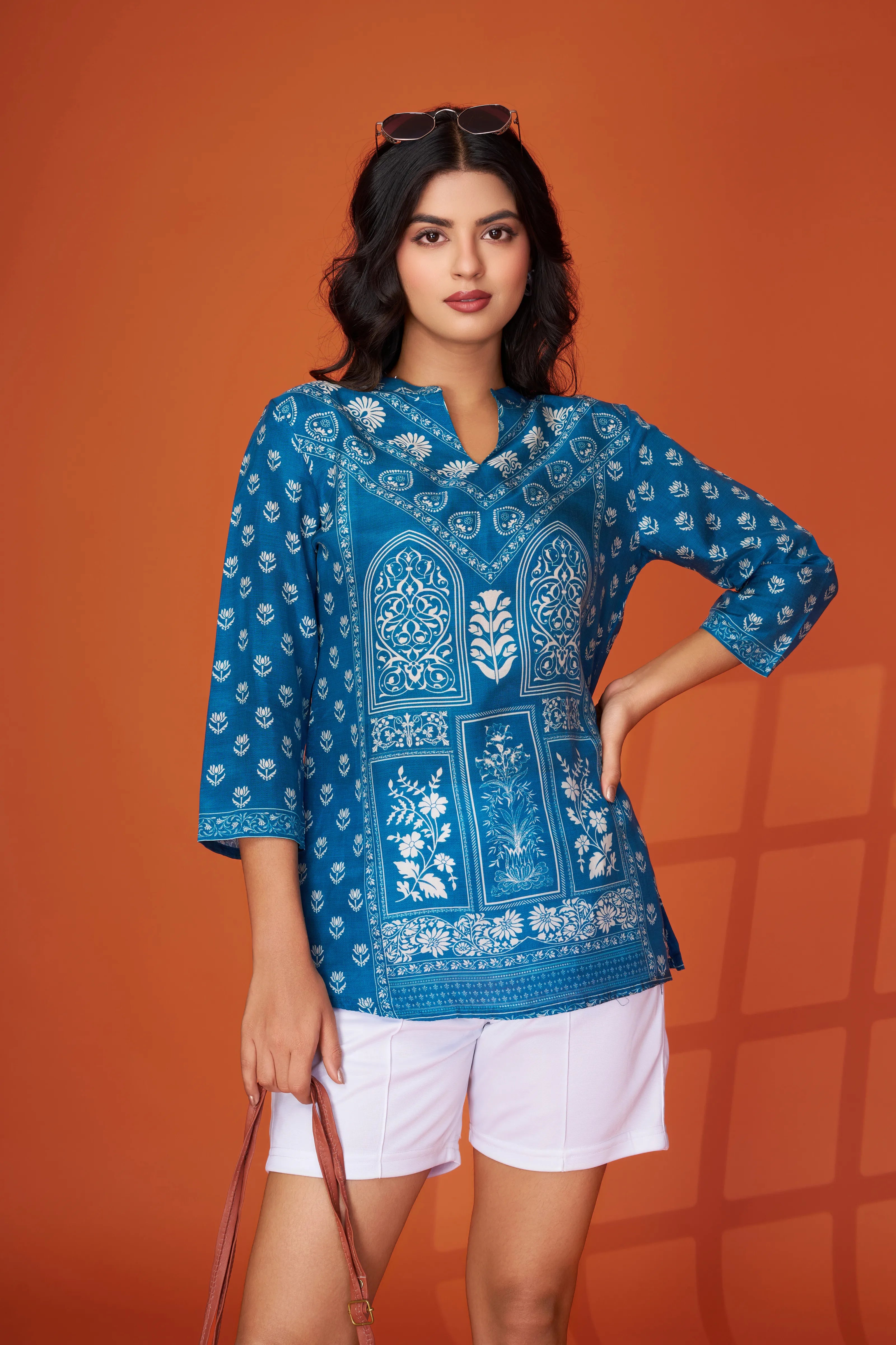 Channel the elegance of timeless block artistry with our Indigo Charm short kurti – a blend of heritage print and contemporary silhouette. The intricate off-white motifs – a mix of florals and geometrics – stand out beautifully against a rich indigo base, giving this piece a handcrafted appeal.