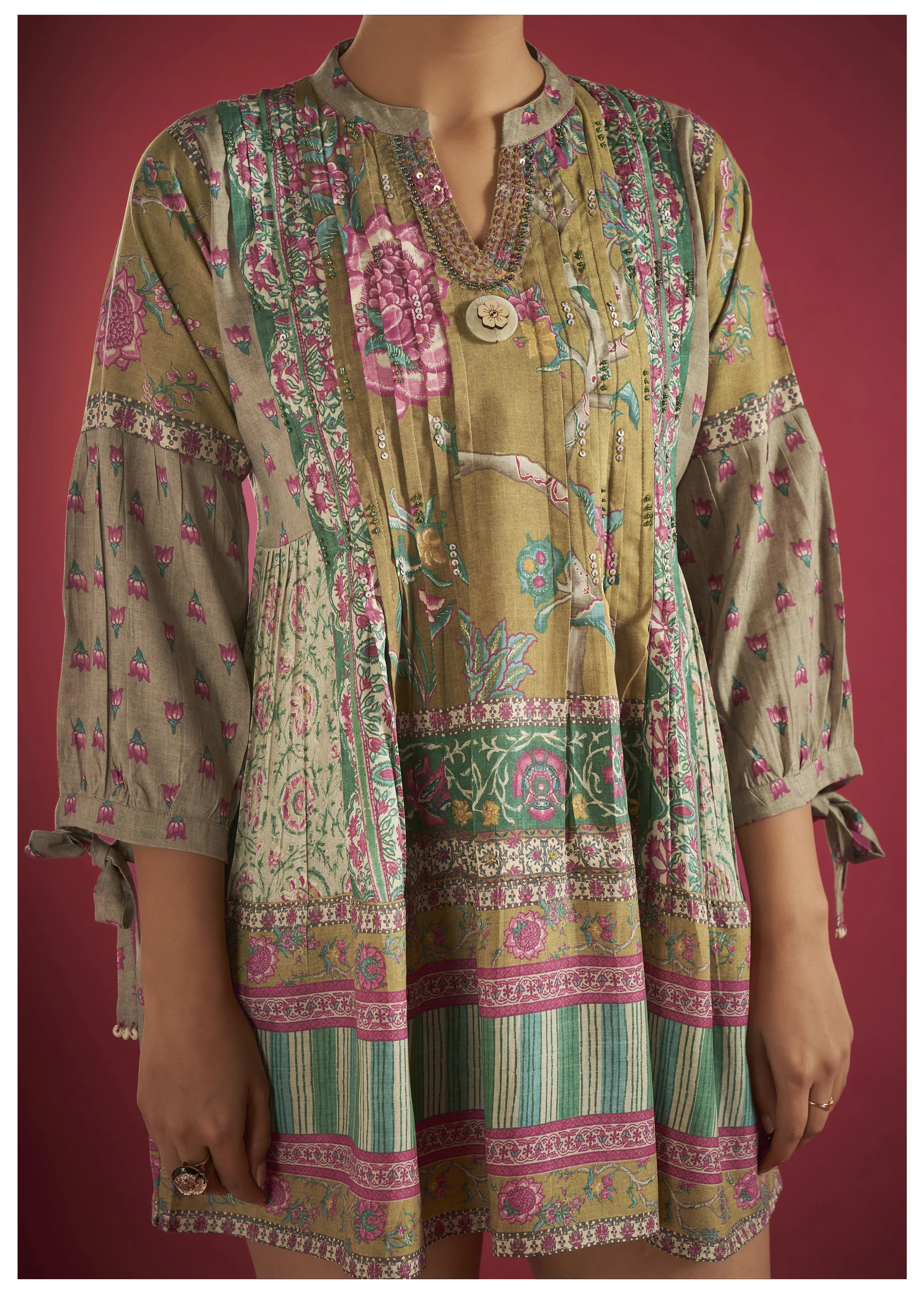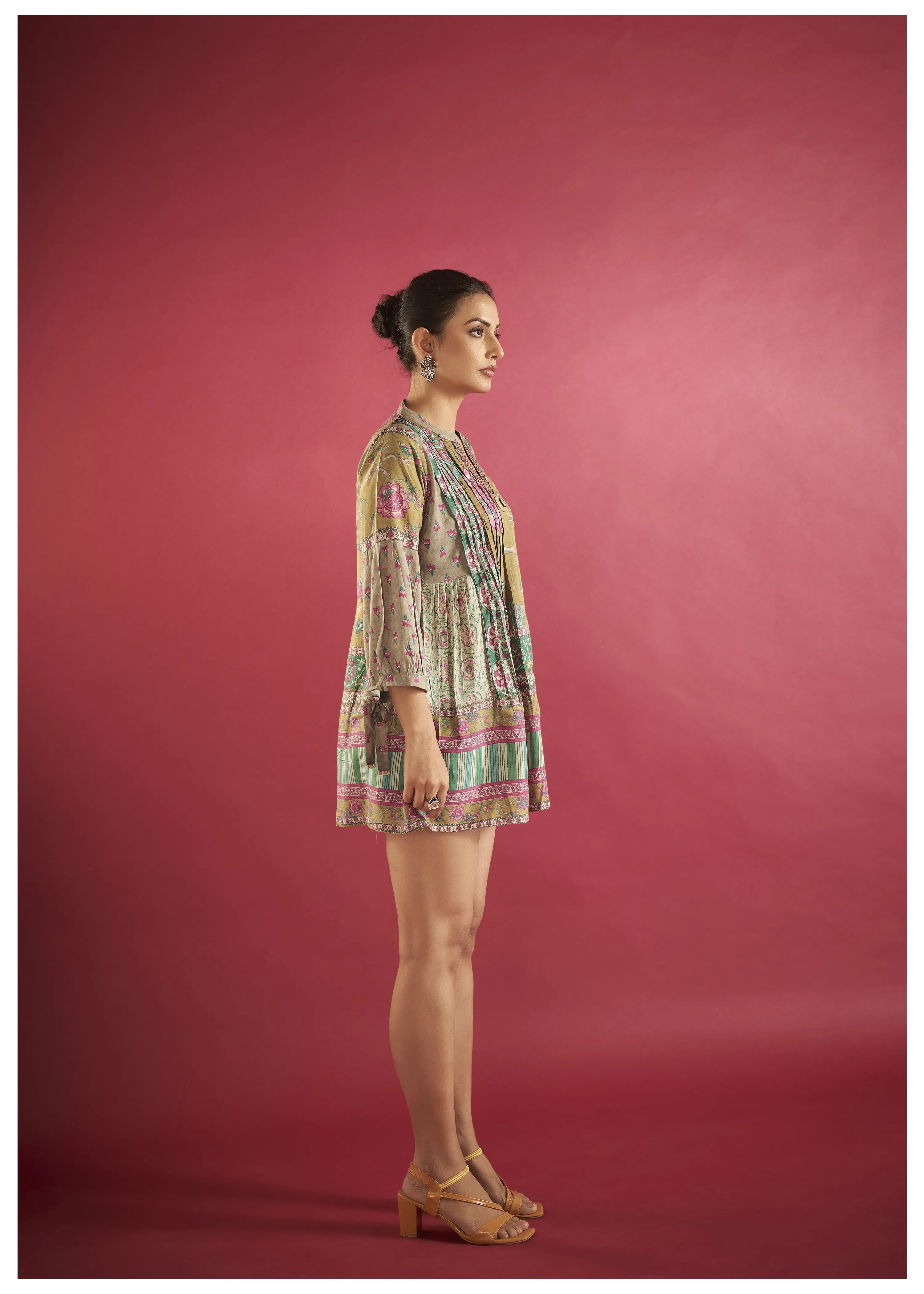 Elevate your wardrobe with this multi-print cotton viscose pleated tunic, combining style, comfort, and effortless charm.