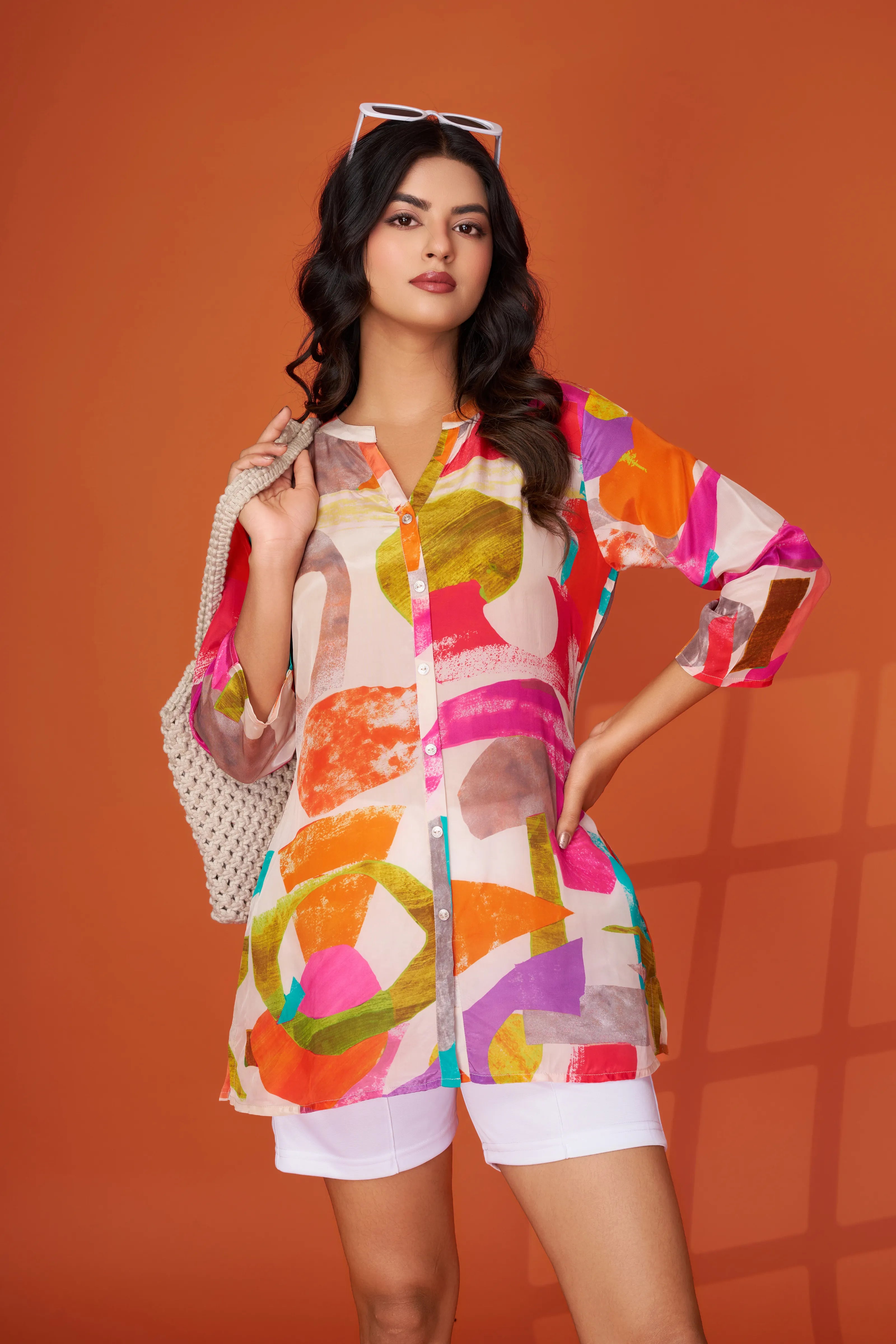 Crafted from fluid crepe fabric, the kurti features an energetic mix of vivid pinks, oranges, greens, and purples in brushstroke-style geometric patterns. Designed with a mandarin collar, V-neckline, button front, and a relaxed silhouette, this kurti is your go-to for fun, fuss-free dressing.