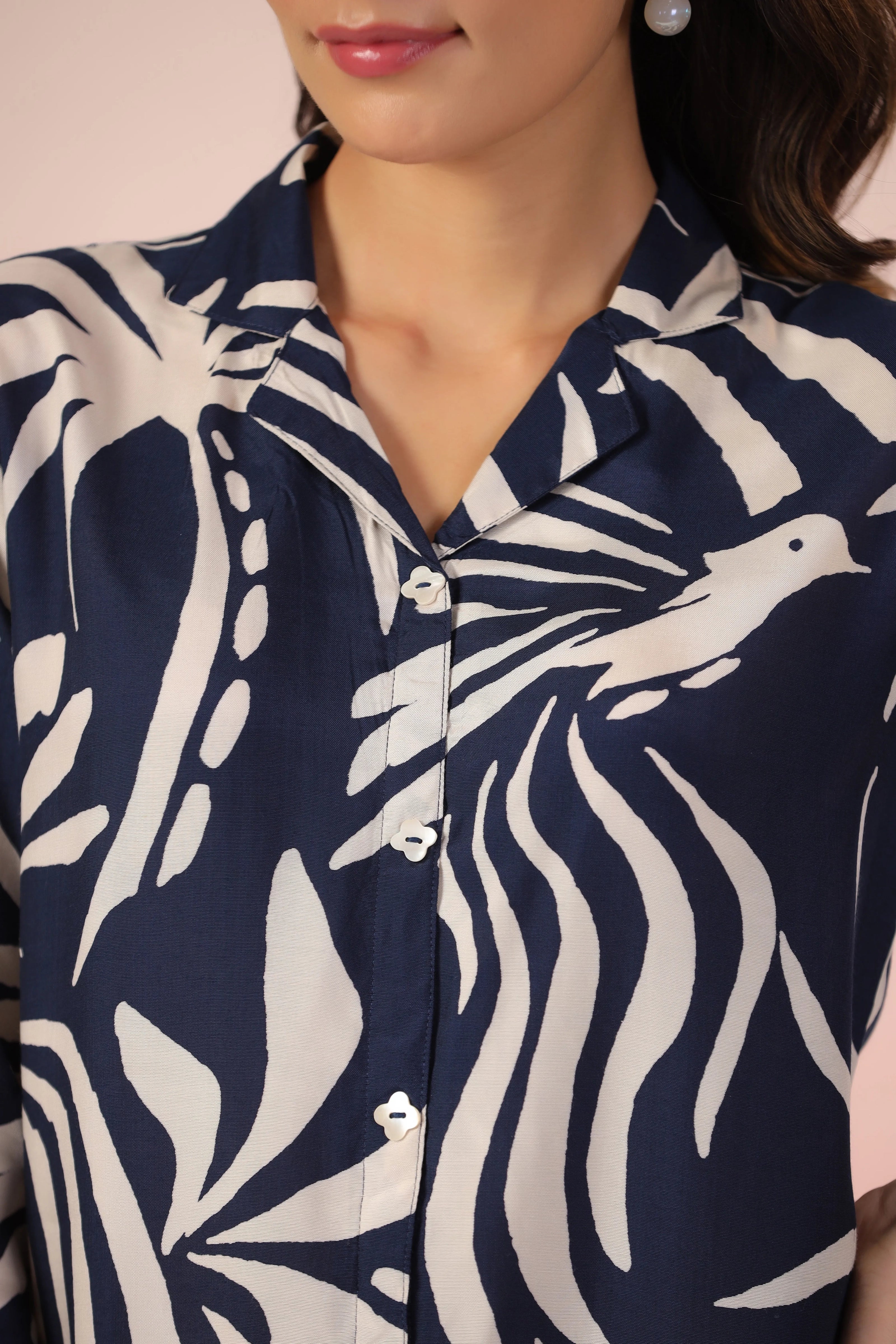 - Design Details: Abstract Print, Lapel Collar, Shell button on Front Placket