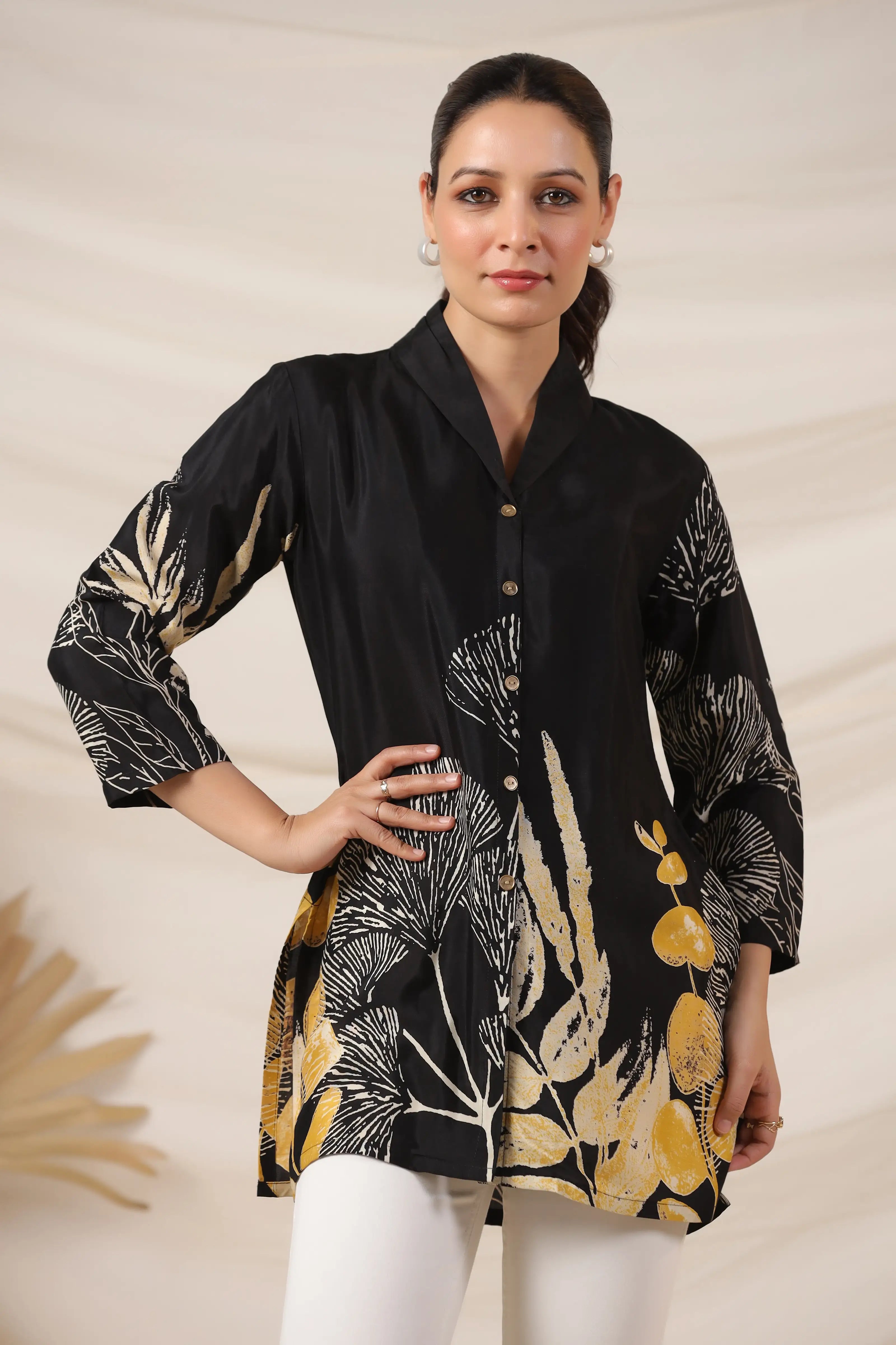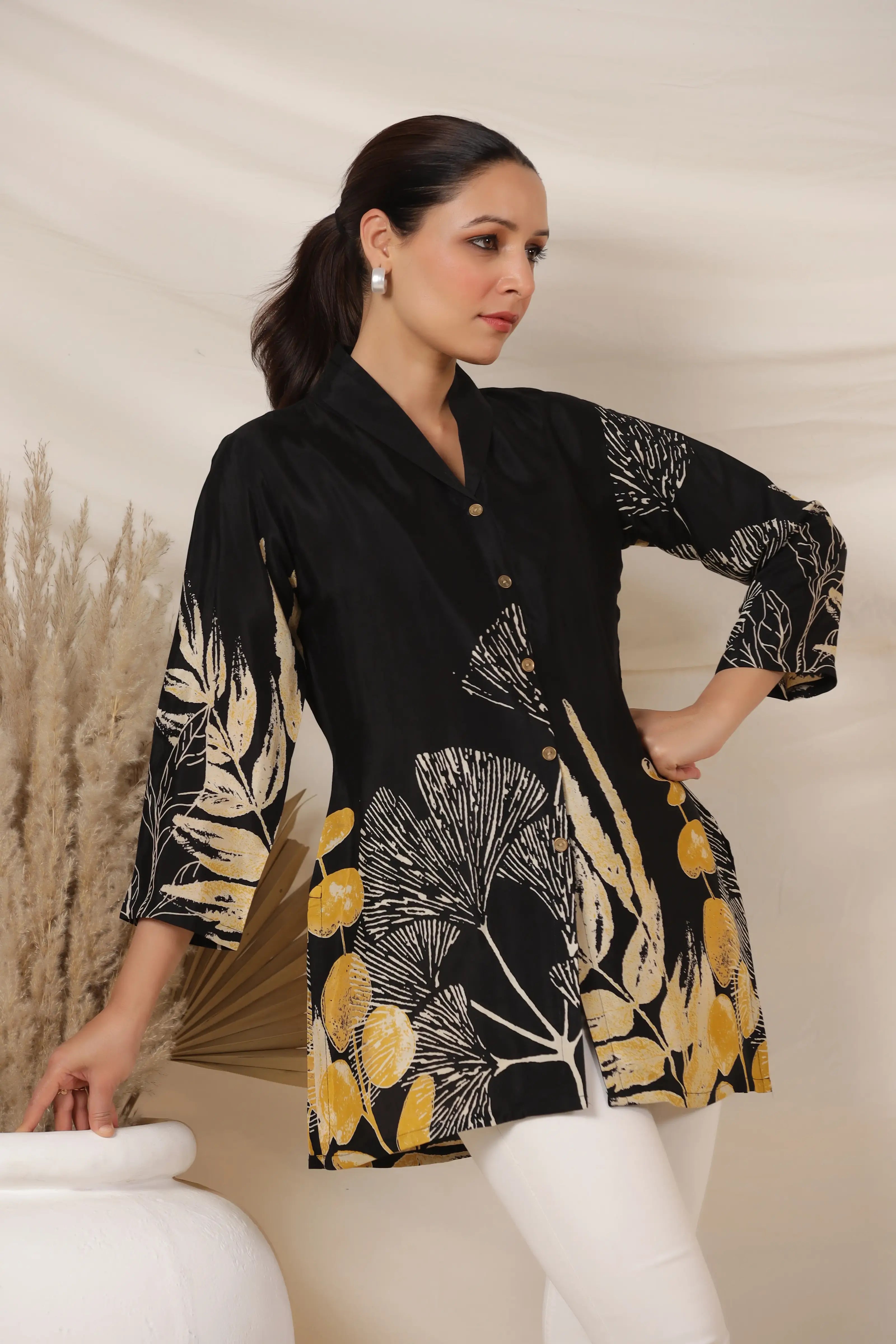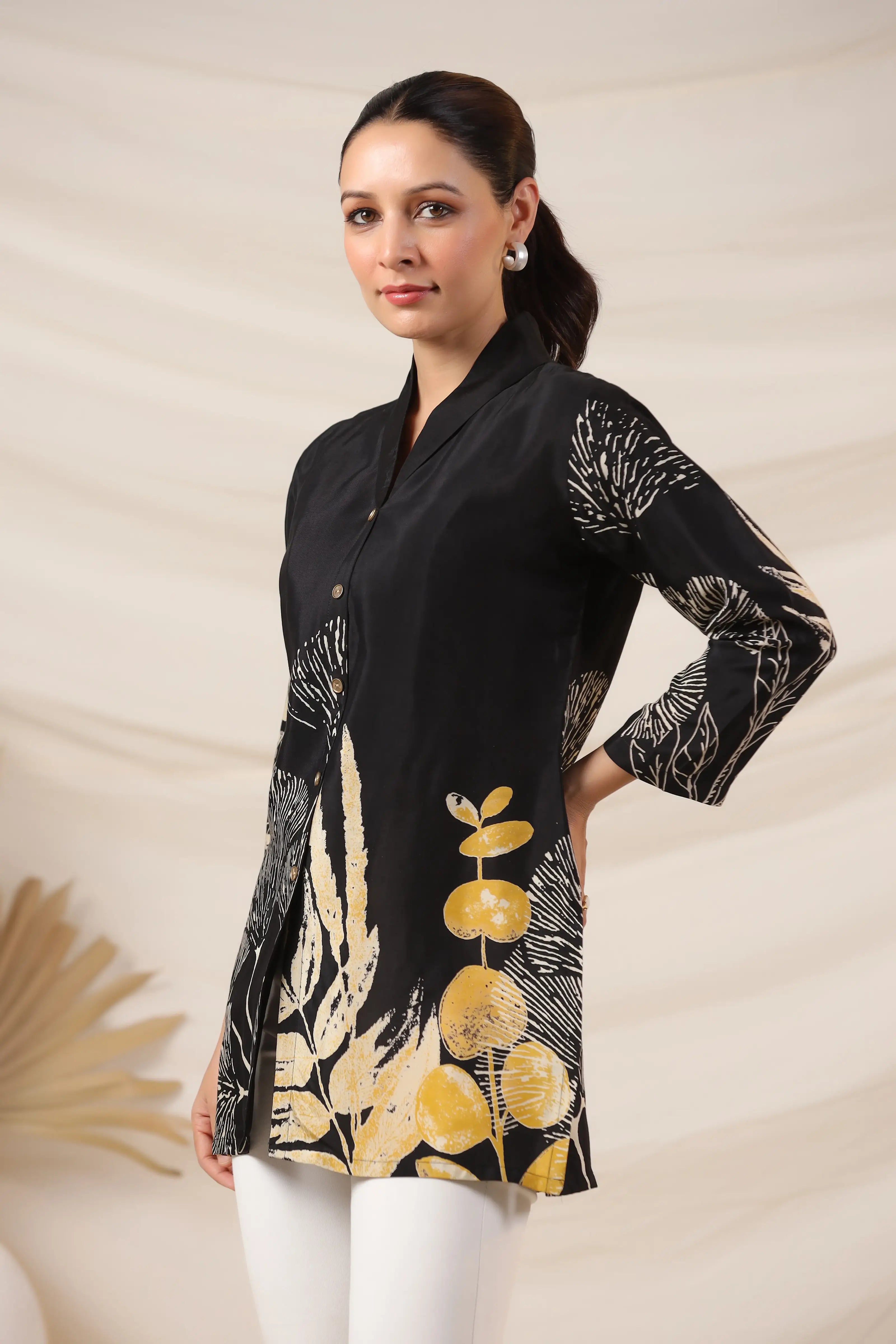 Make a striking impression with this Black Bold Floral Print Top, crafted in luxurious Russian silk for a smooth, lustrous finish. Featuring a lapel collar, 3/4th sleeves, and a statement golden button front closure, this top blends sophistication with contemporary charm. The bold floral placement print adds a dramatic yet refined aesthetic, making it a standout piece for both day and evening wear.