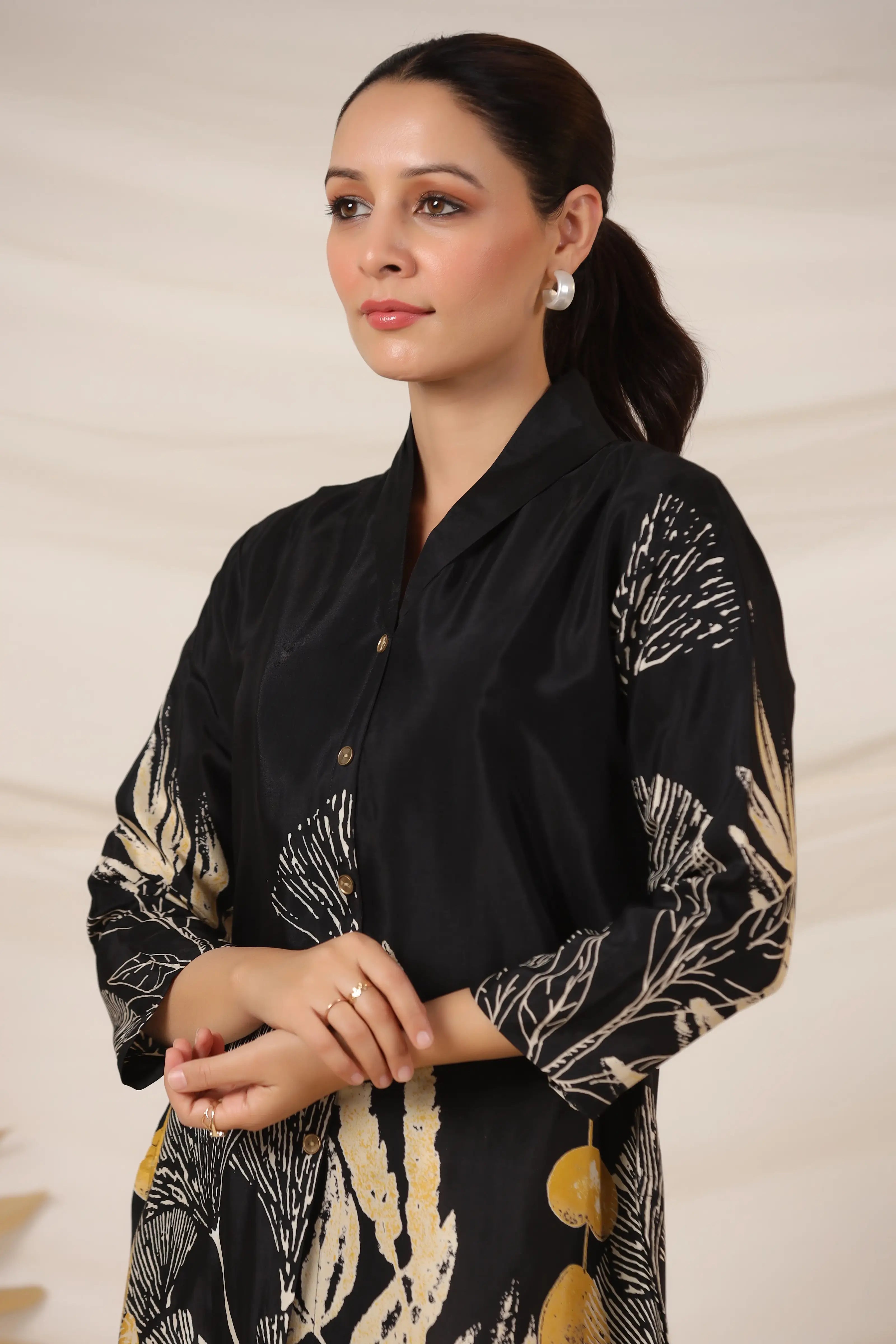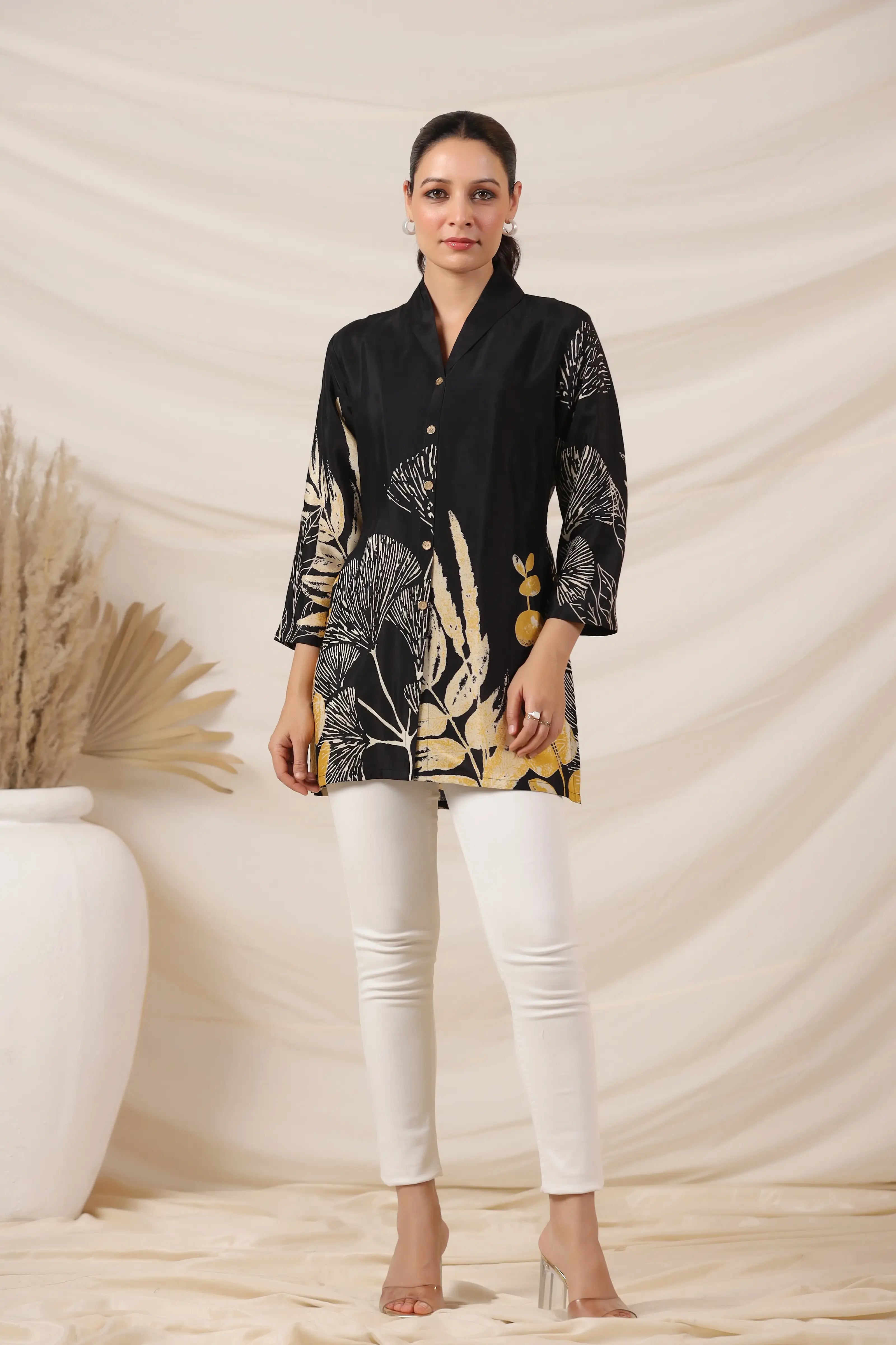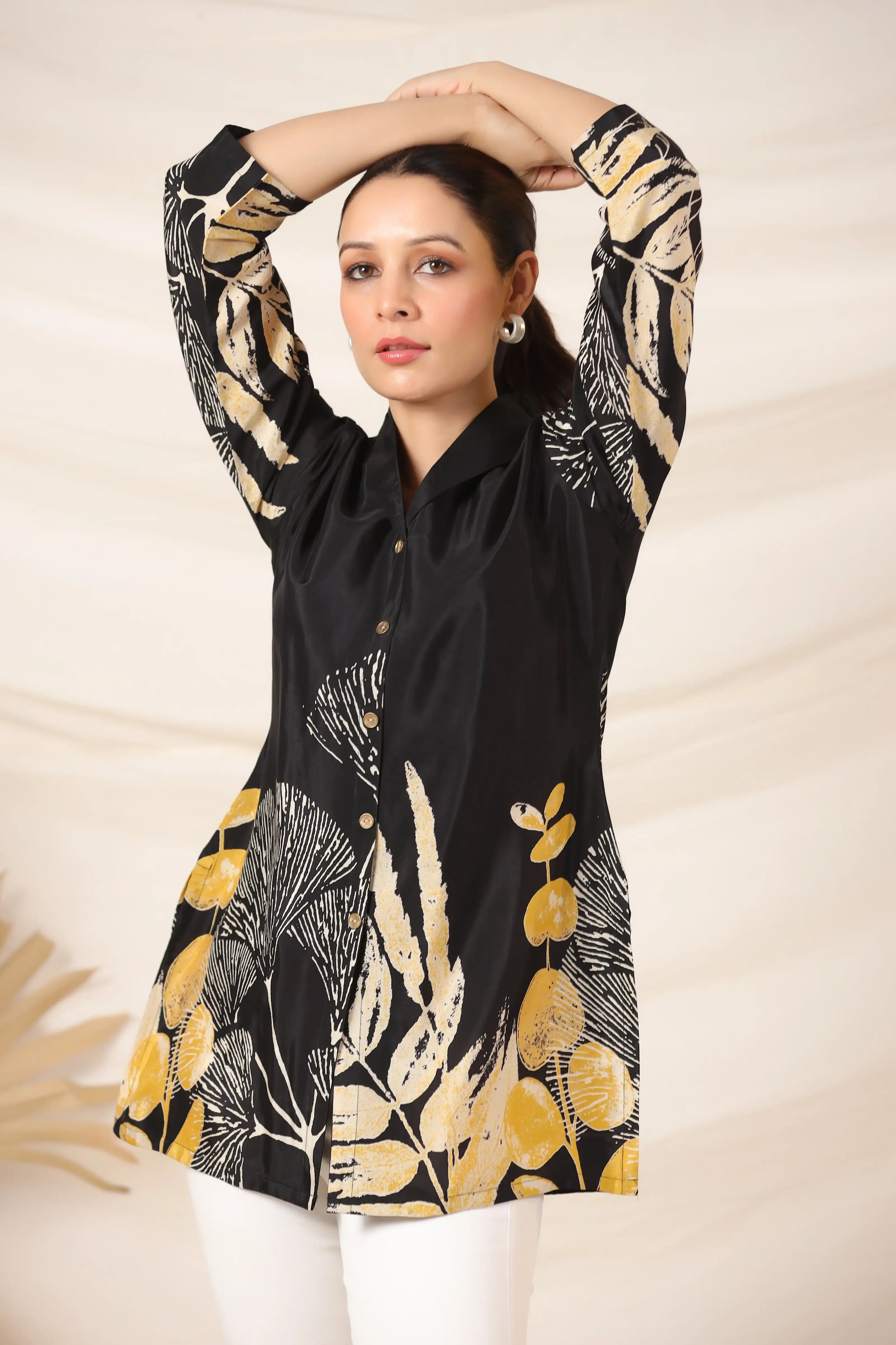 Make a striking impression with this Black Bold Floral Print Top, crafted in luxurious Russian silk for a smooth, lustrous finish. Featuring a lapel collar, 3/4th sleeves, and a statement golden button front closure, this top blends sophistication with contemporary charm. The bold floral placement print adds a dramatic yet refined aesthetic, making it a standout piece for both day and evening wear.