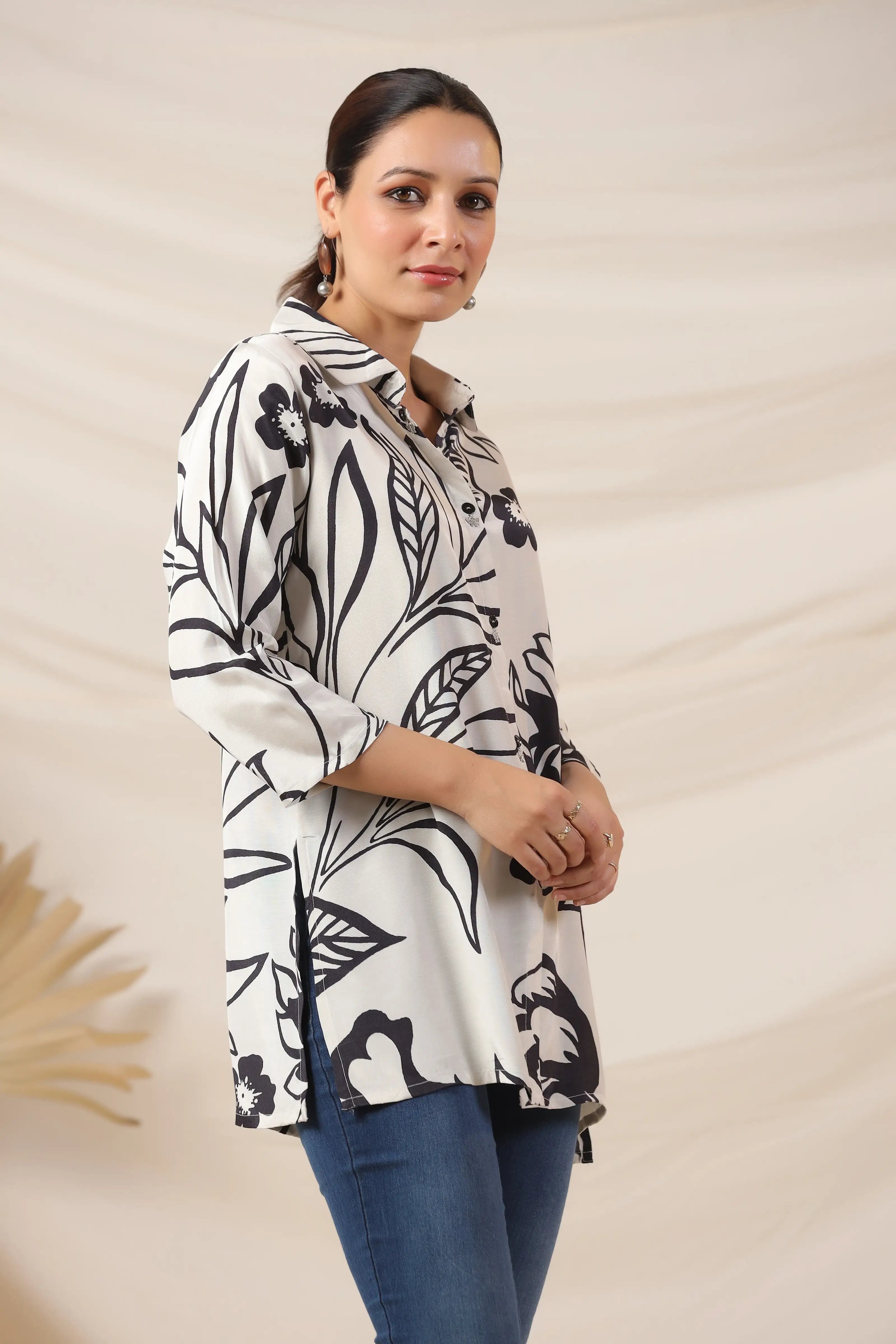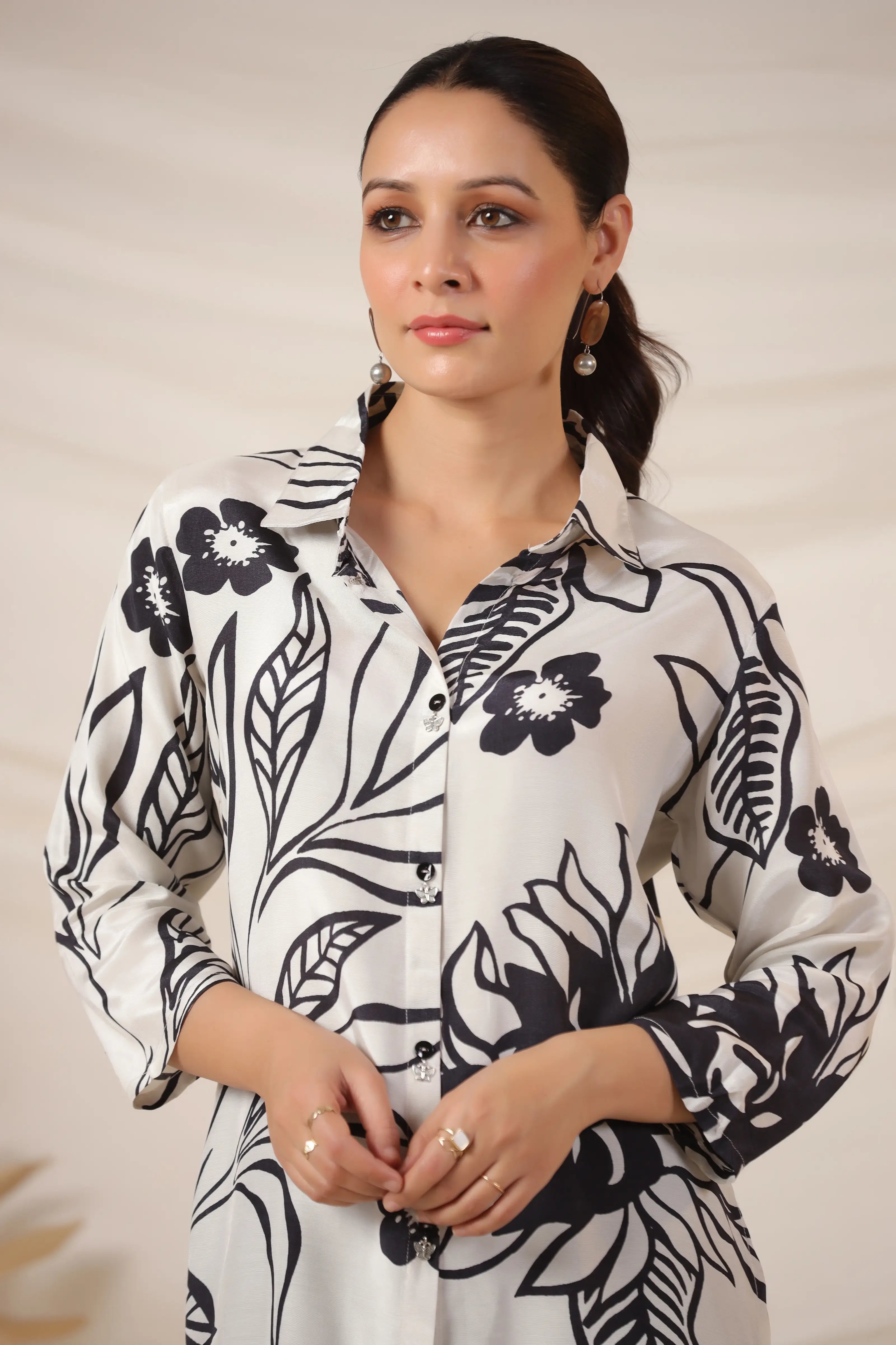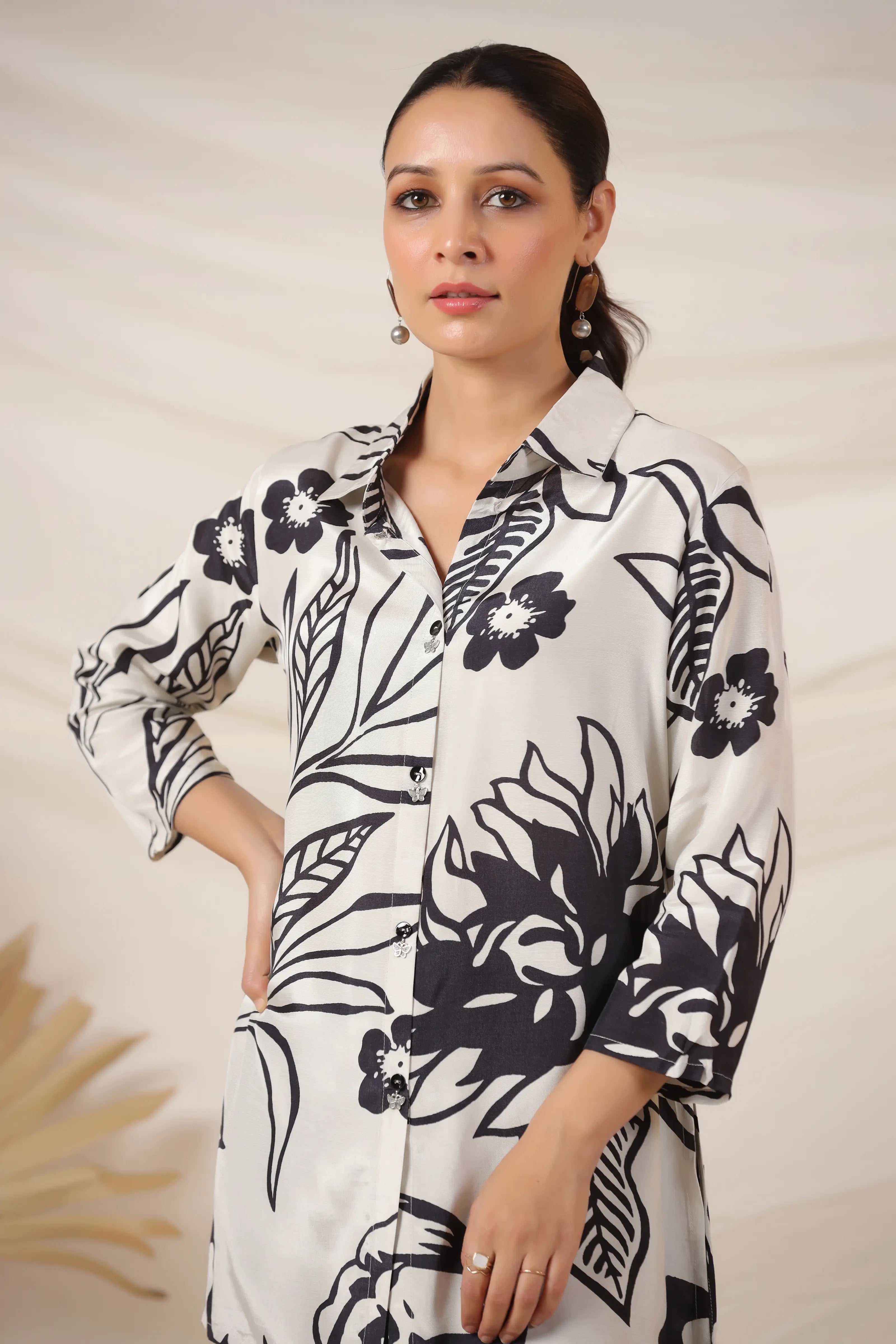 • Top: Shirt Collar, 3/4th Sleeves, Black Floral Print on Off-White Base