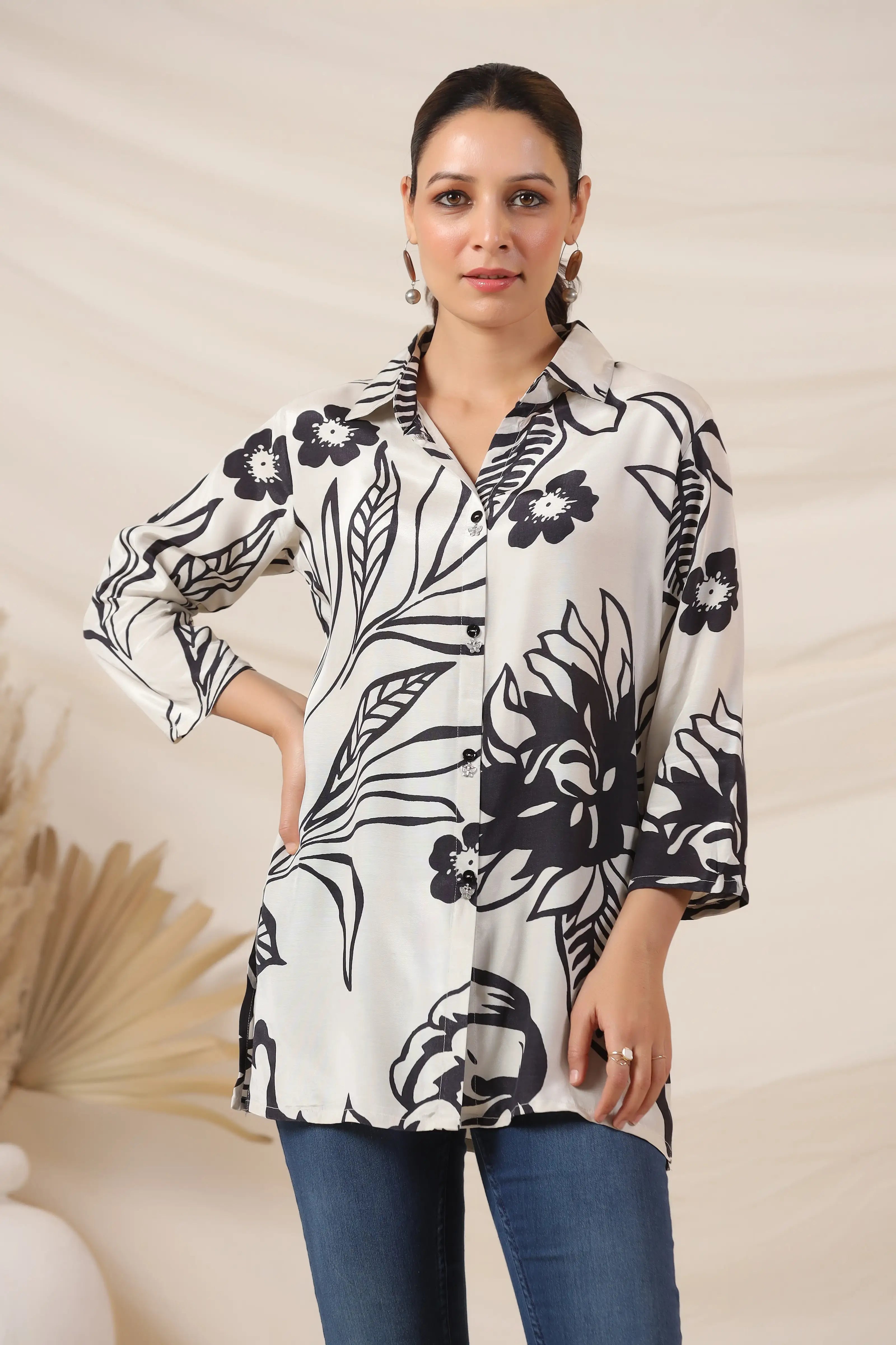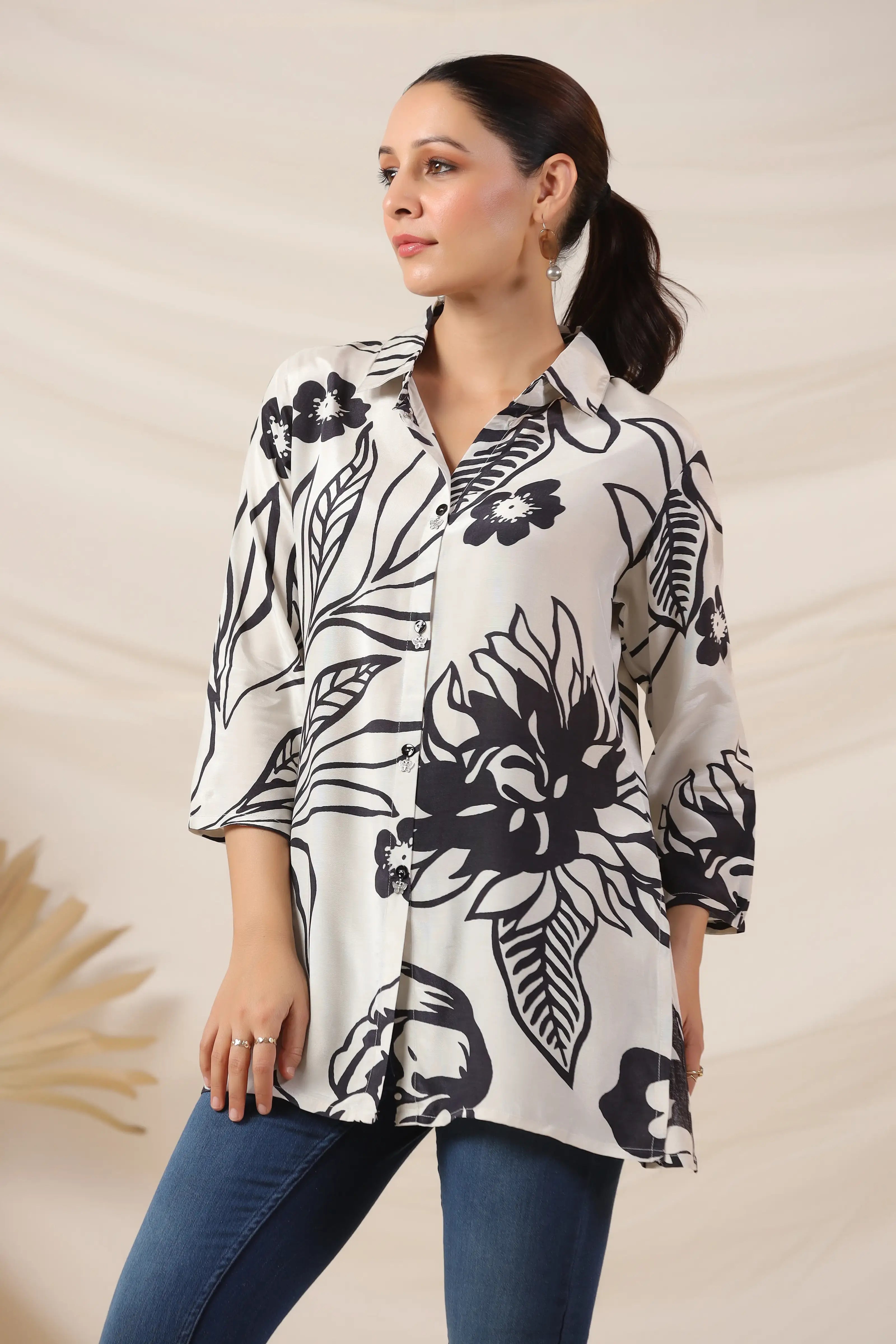 Refined and effortlessly stylish, the Off-White & Black Floral Printed Top is a wardrobe essential for those who love understated sophistication. Crafted from luxurious Russian silk, this top features a classic shirt collar and 3/4th sleeves, offering a polished yet comfortable fit. The off-white base with black floral prints adds a timeless contrast, making it perfect for both casual and semi-formal occasions.
