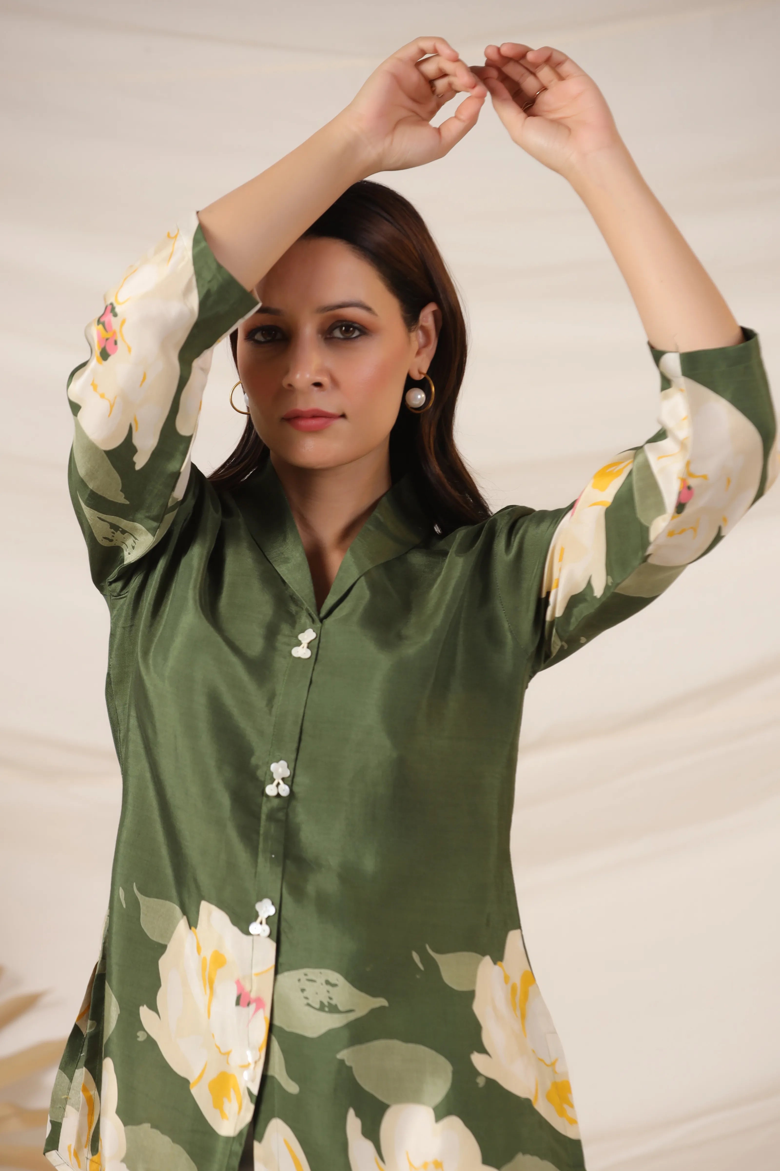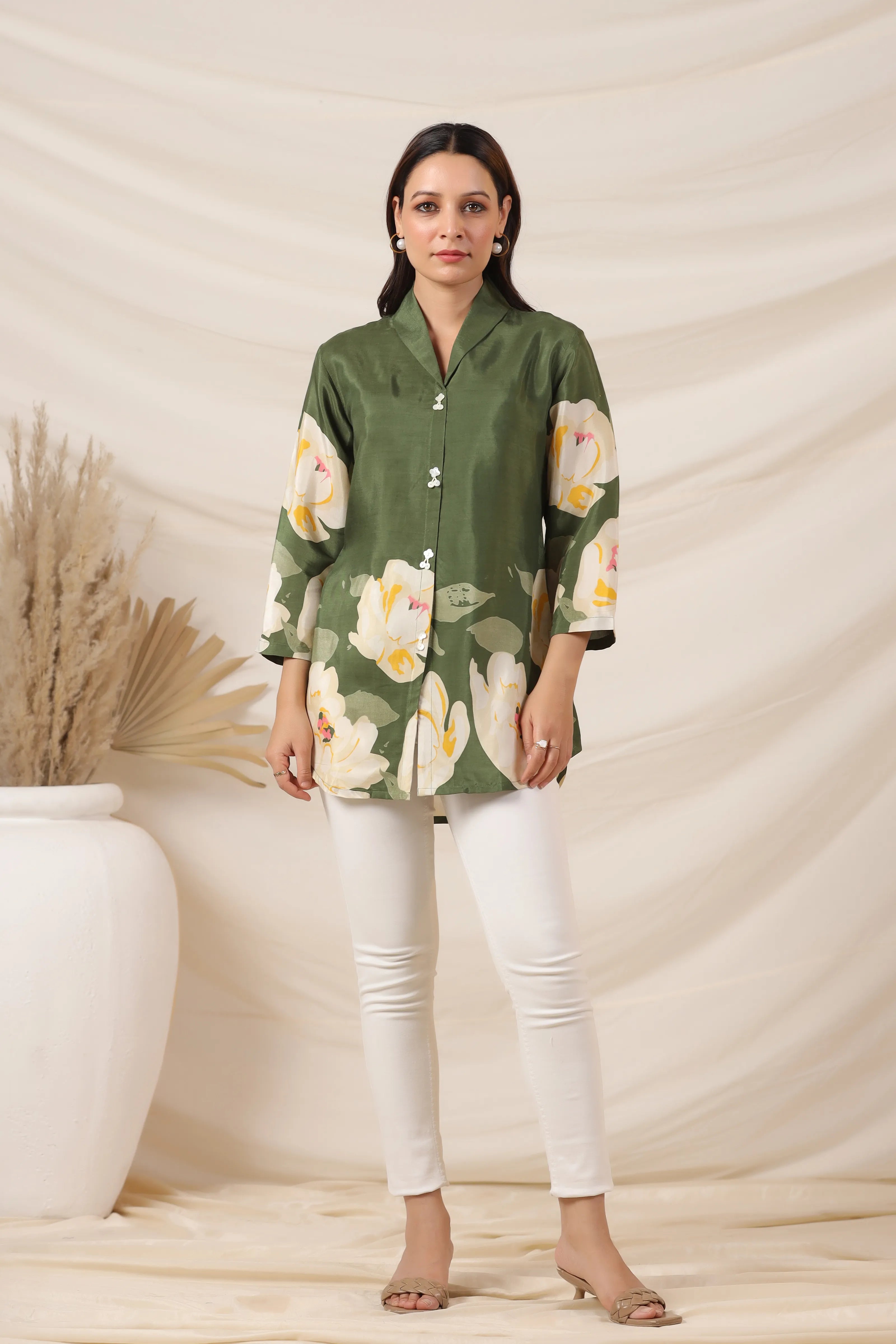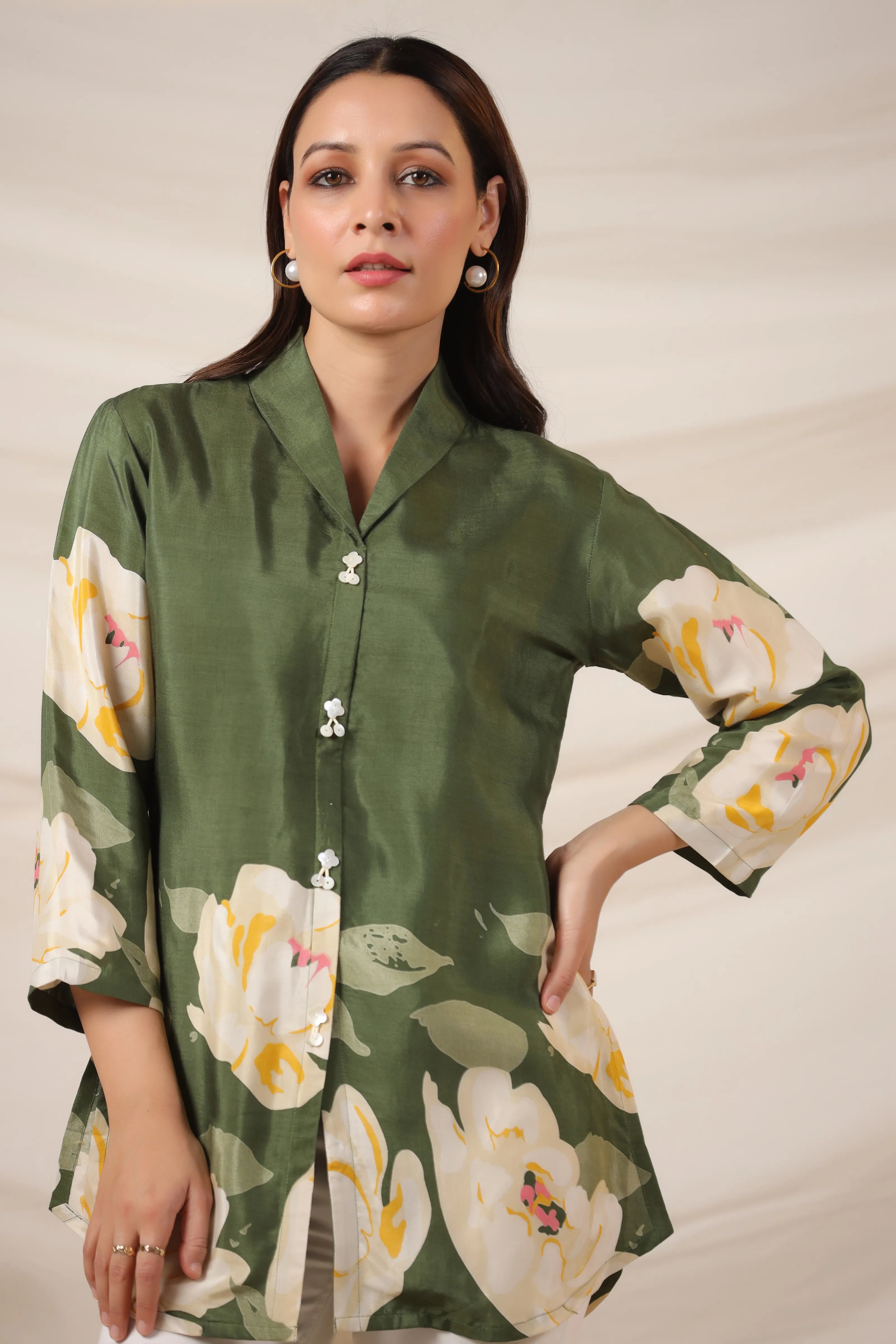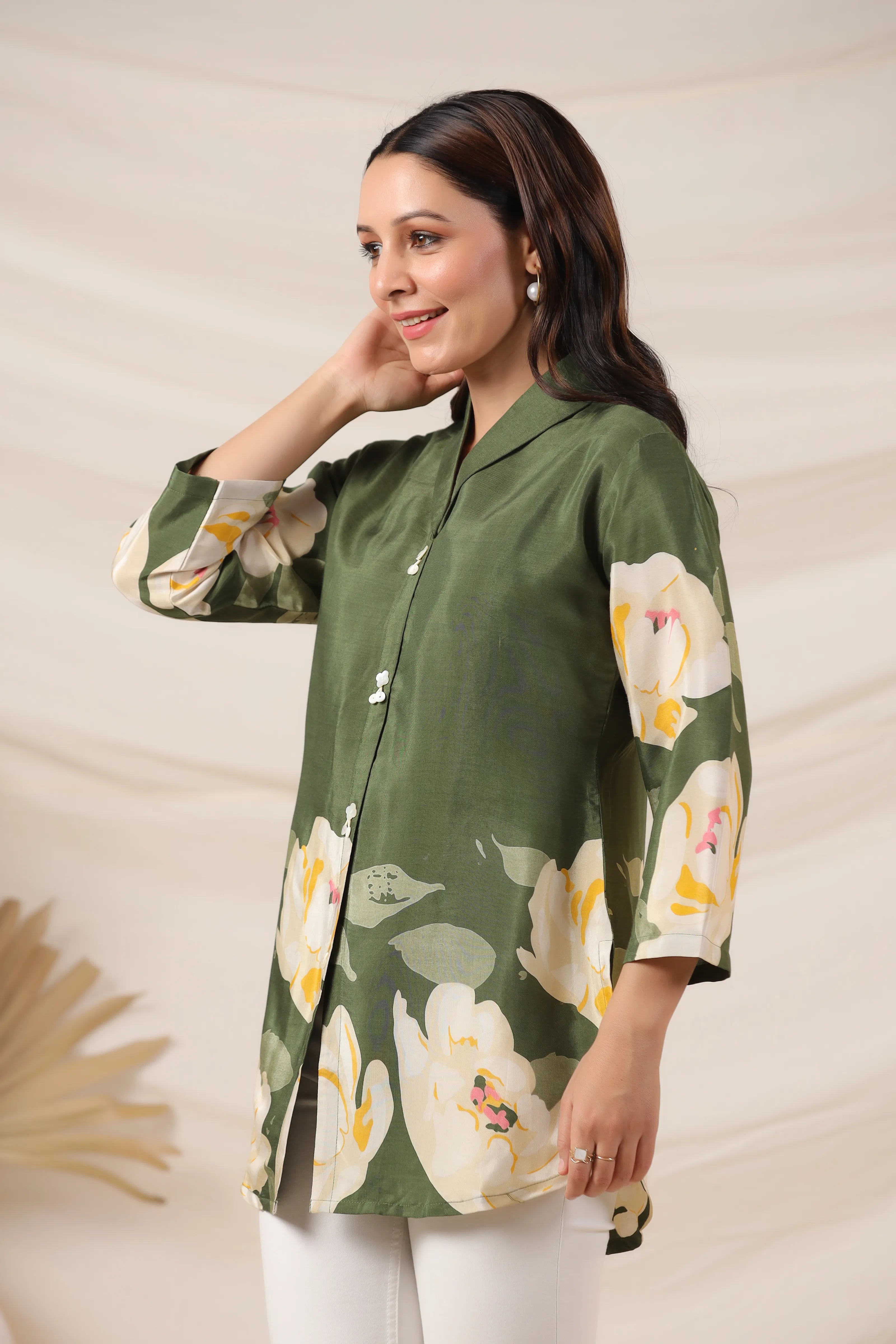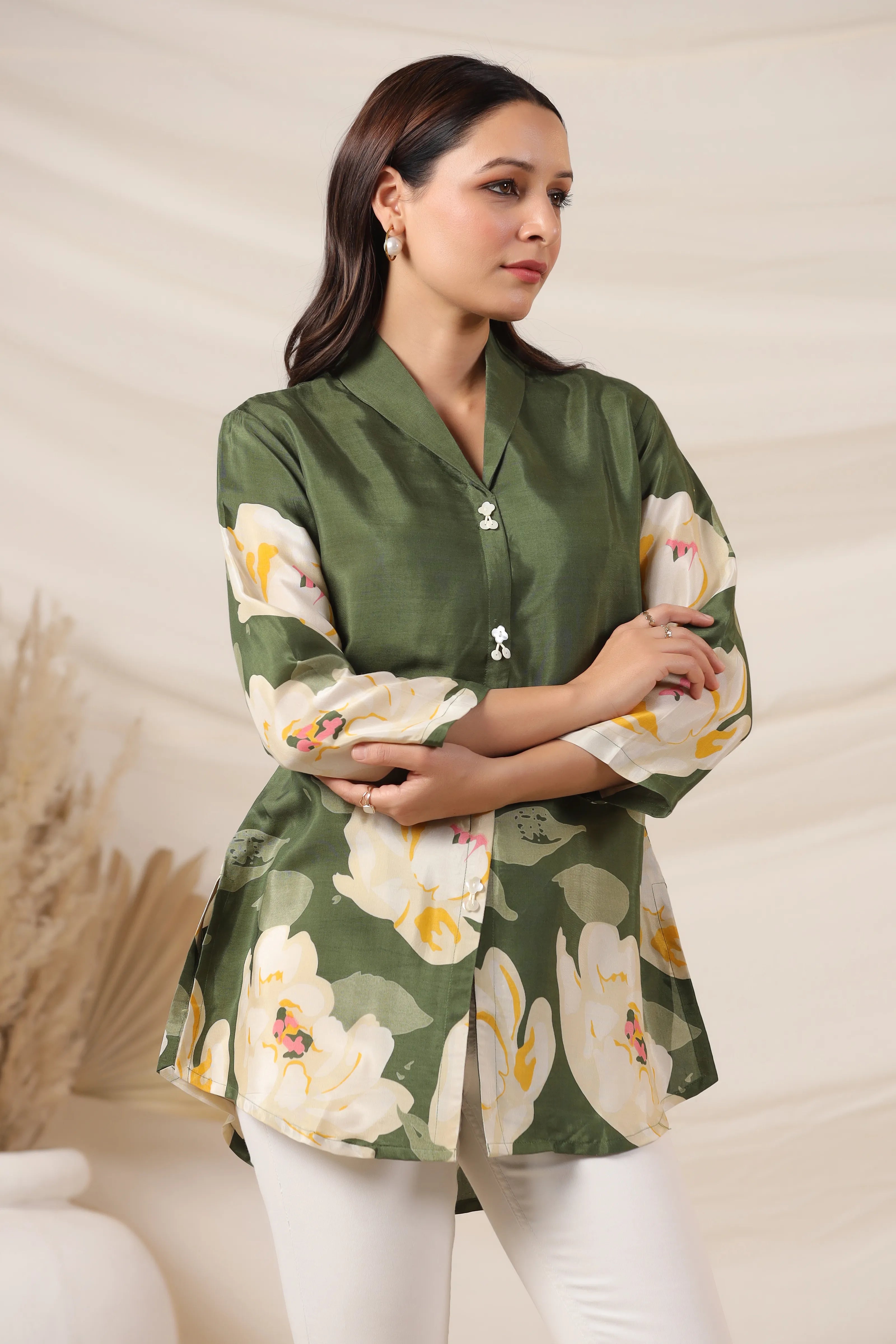 Elevate your everyday style with this elegant olive green top, featuring a vibrant bold floral print and a smart lapel collar. Crafted from smooth Russian silk, this piece is finished with classic shell button detailing and 3/4th sleeves for a timeless touch.