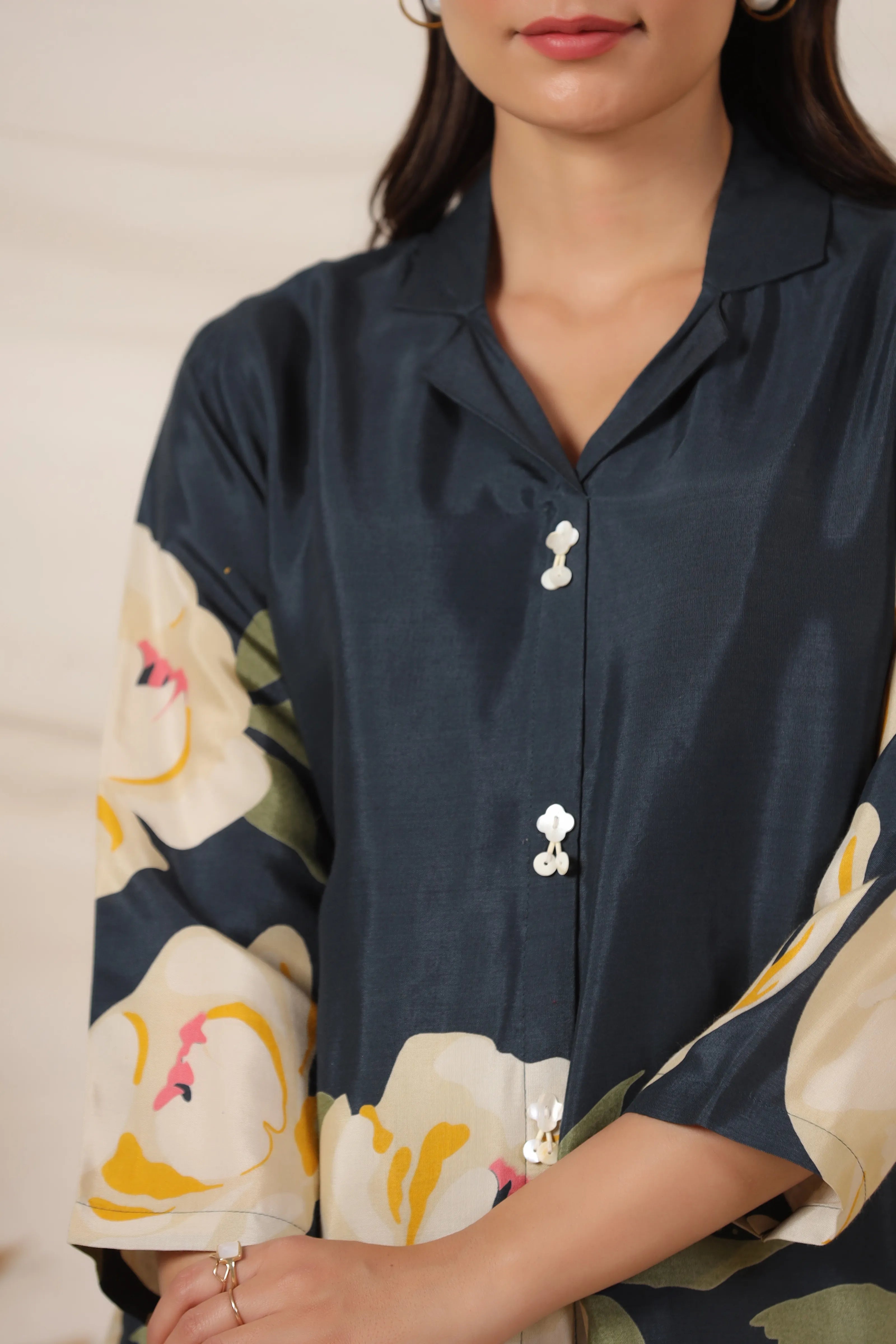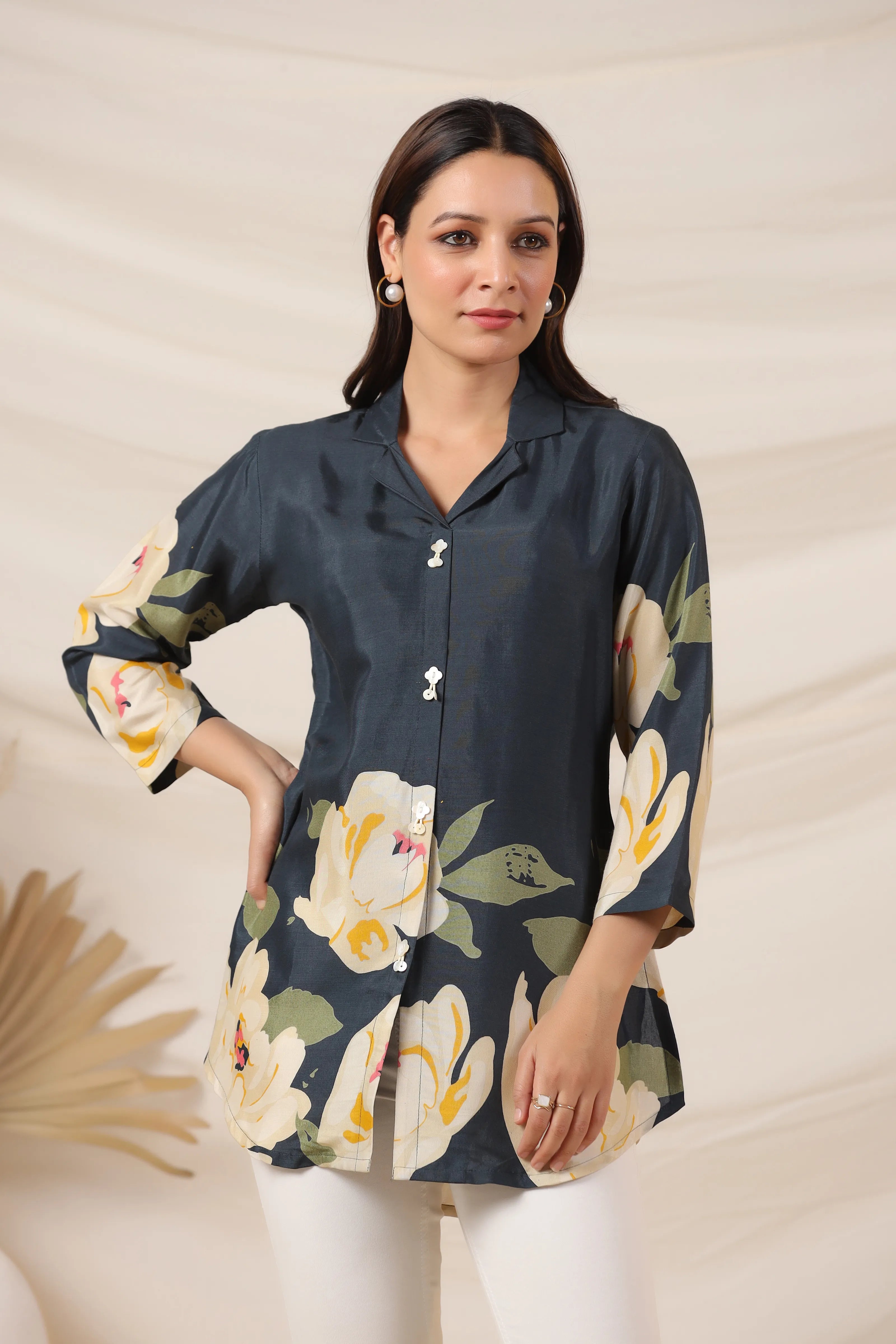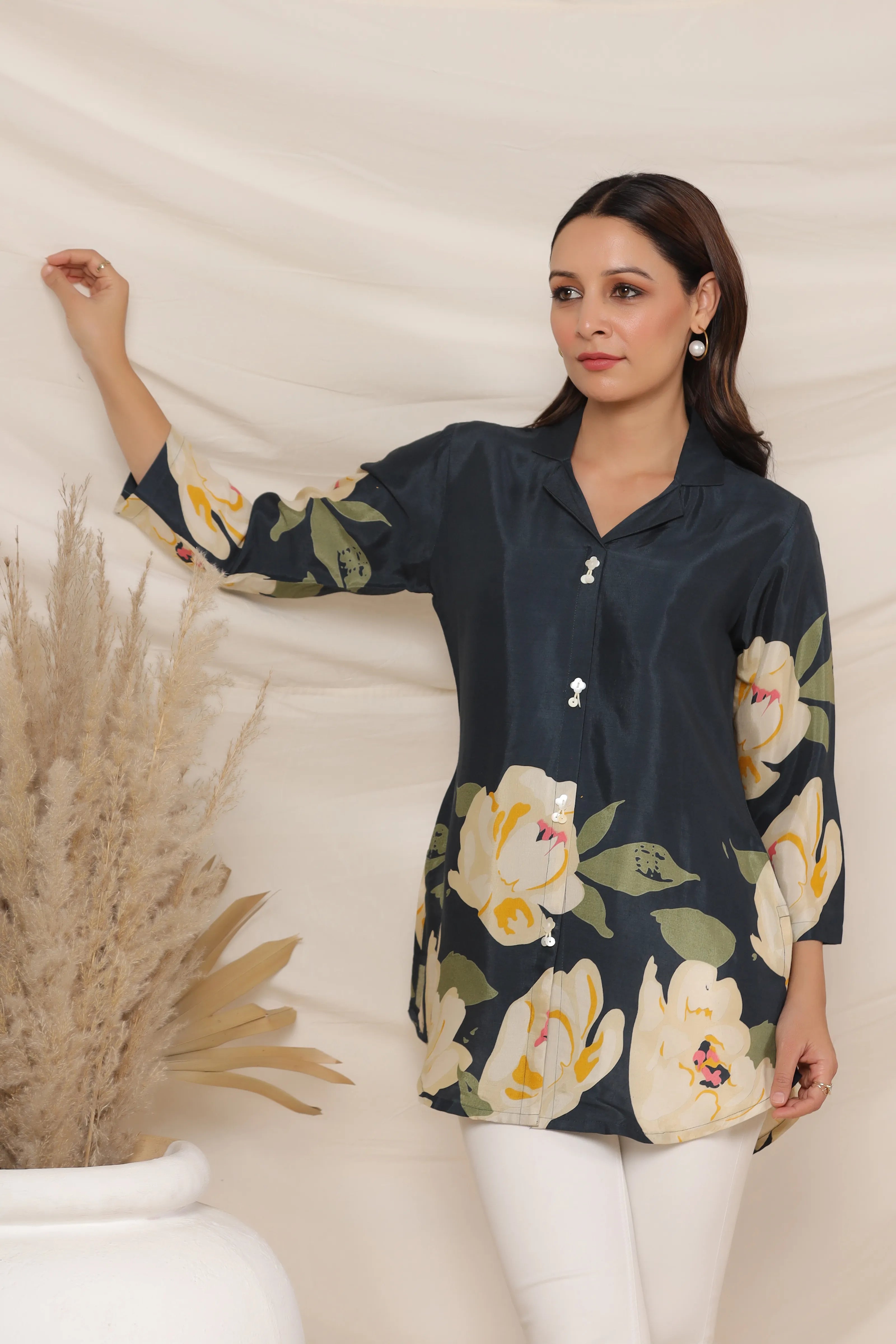 Key Features: • Fabric: Russian silk—smooth, lightweight with a subtle sheen • Color: Rich peacock blue base with oversized floral prints in ivory, yellow, and green • Design: Lapel collar, shell button front, 3/4th sleeves, relaxed fit • Details: Glossy natural shell buttons, placement floral print for bold visual impact