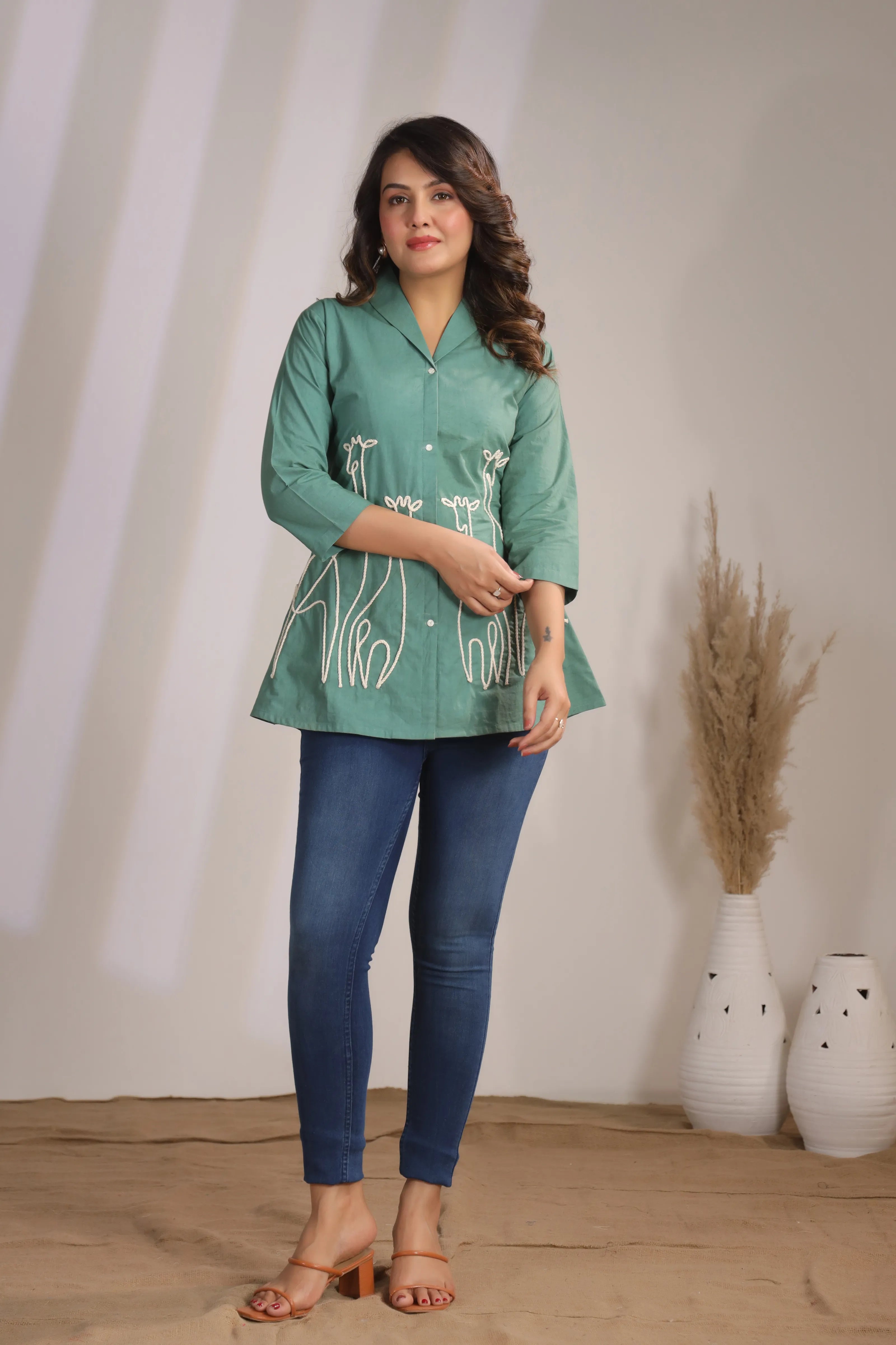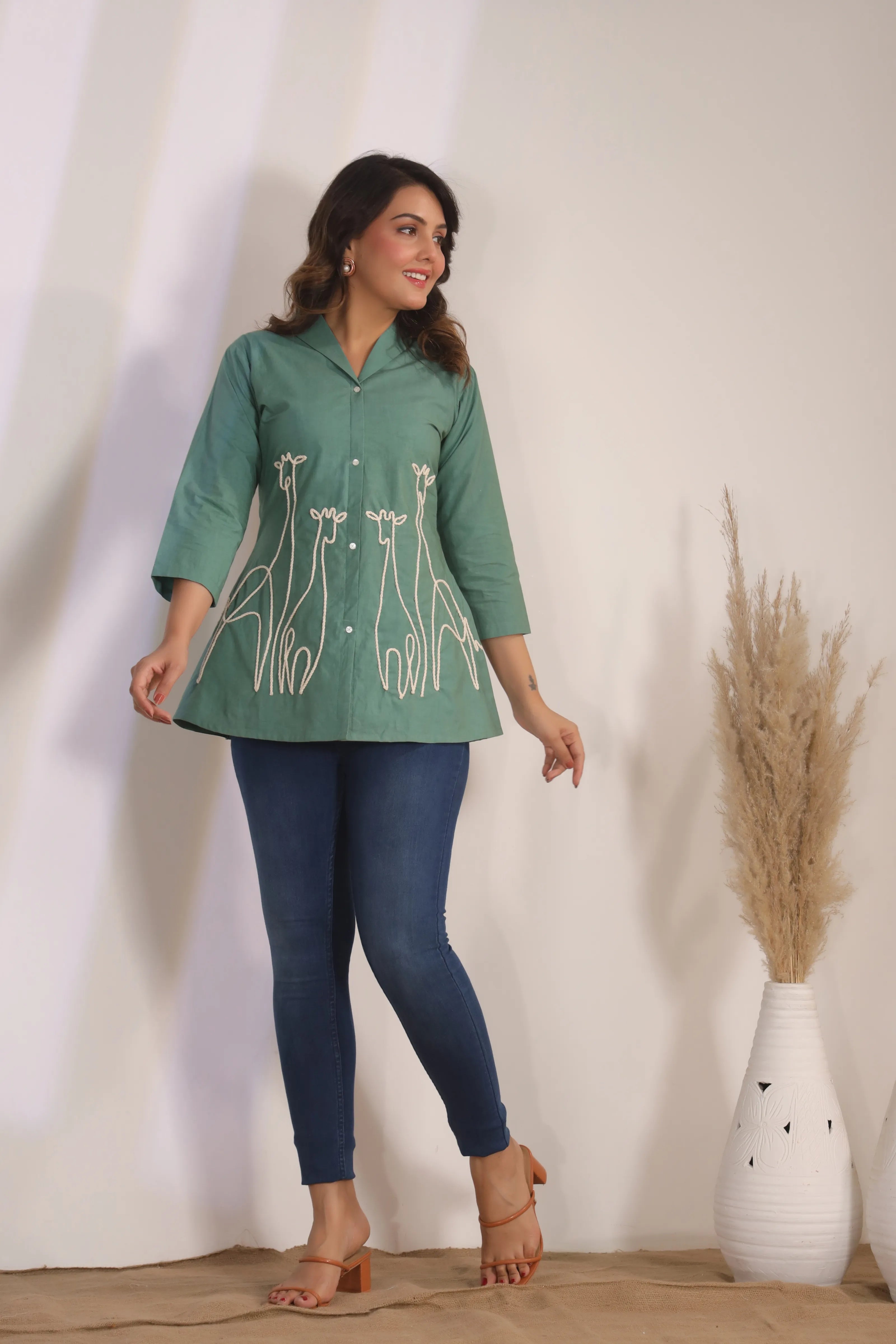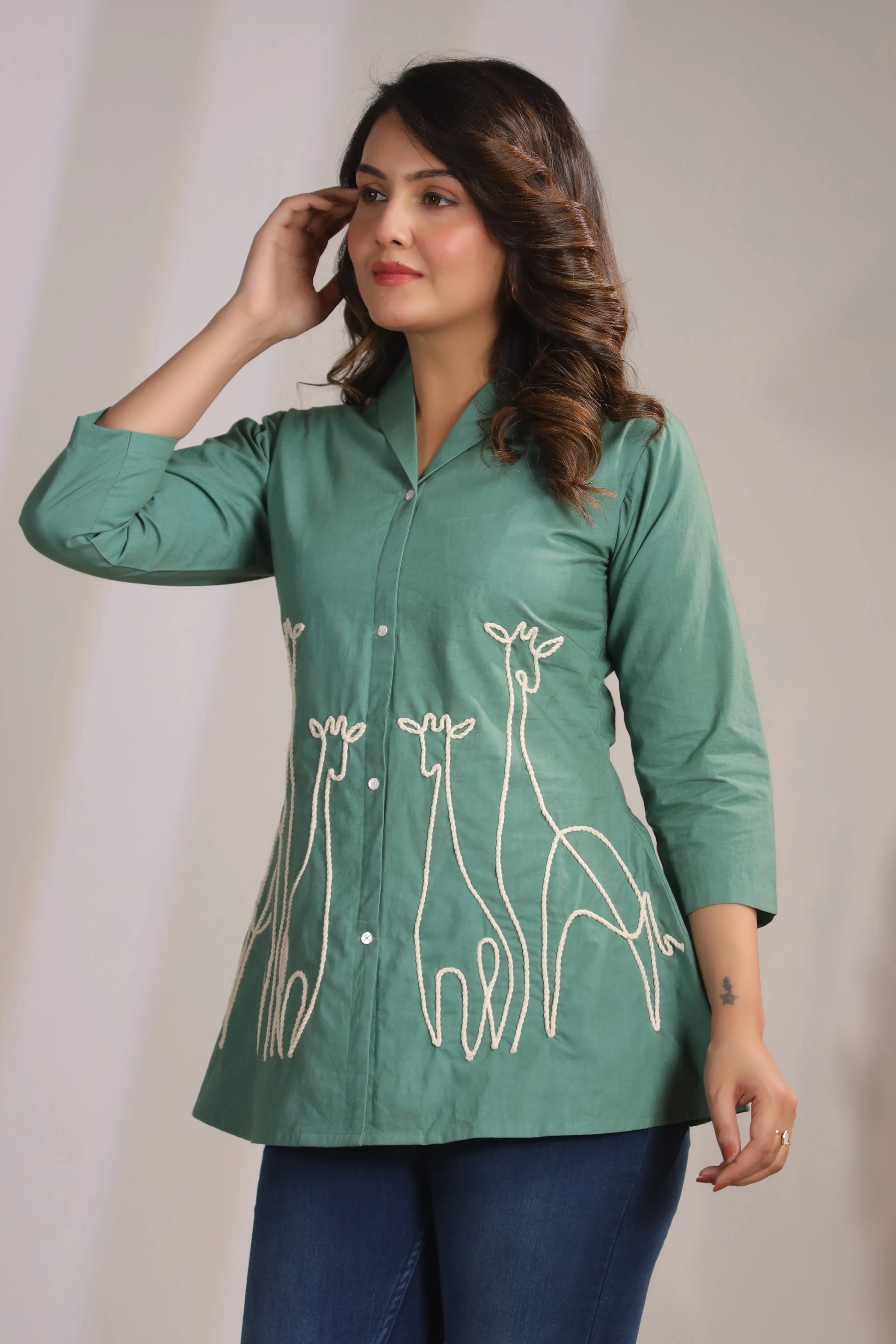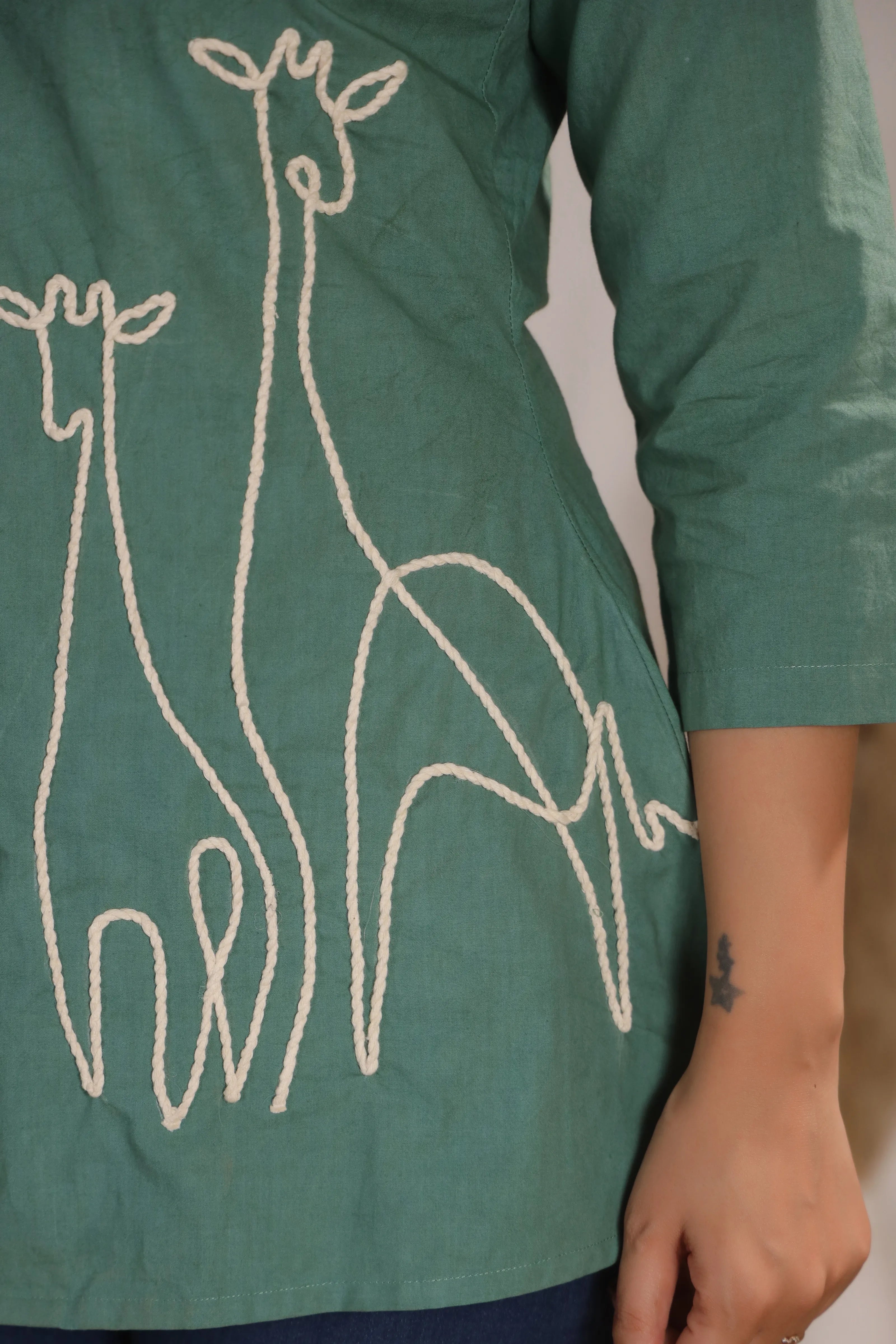 Channel playful elegance in our Wild Whimsy tunic – where artful detailing meets effortless comfort. This sage green cotton cambric tunic stands out with its whimsical white cord-embroidered giraffe motif, adding a bold and artistic touch to your wardrobe.