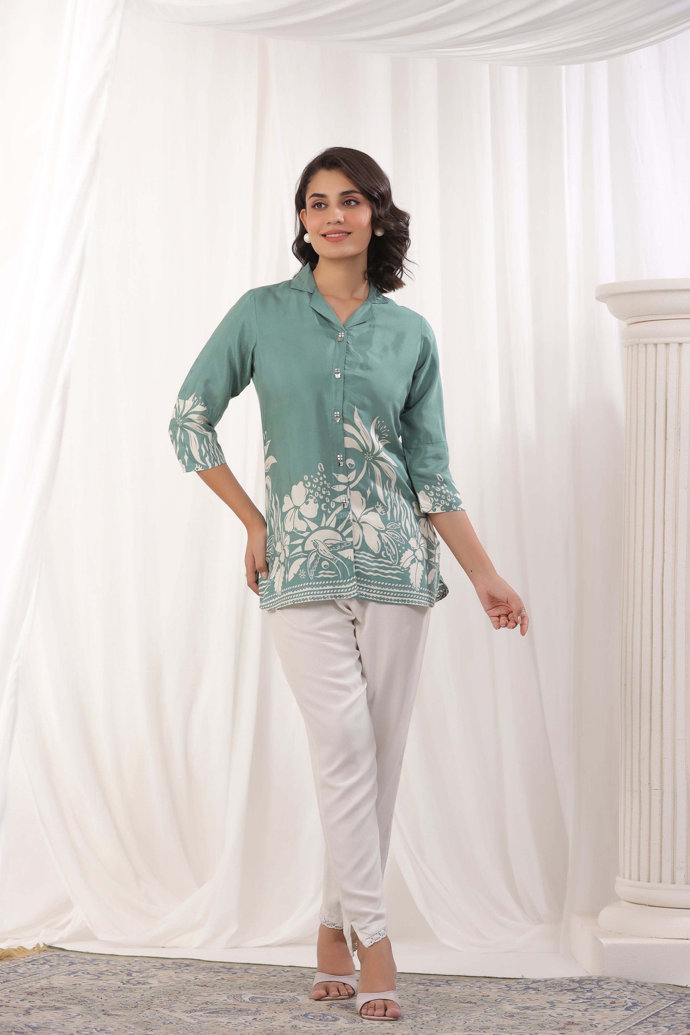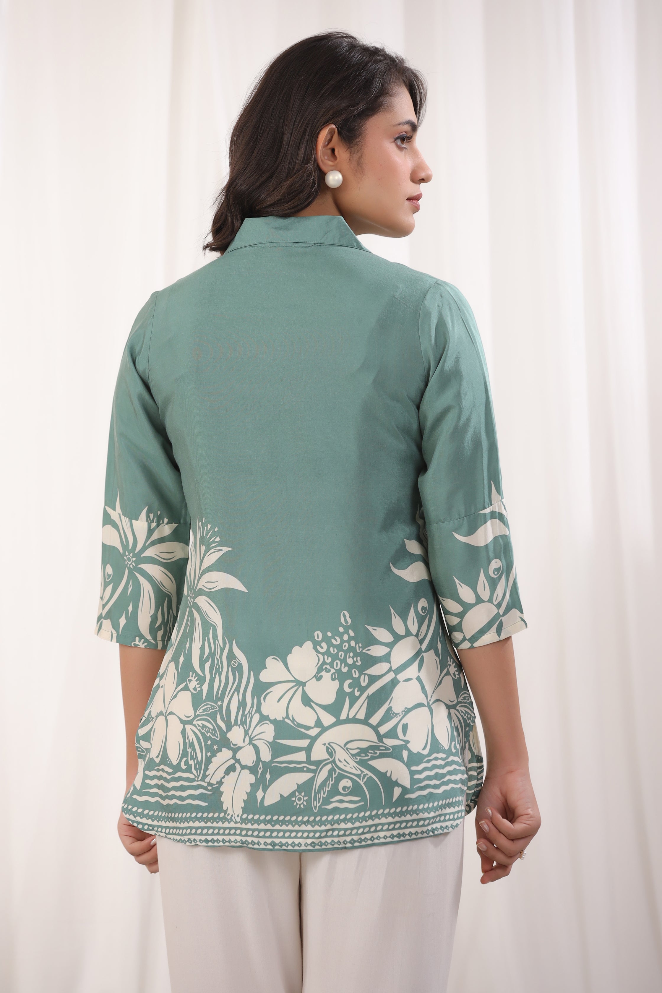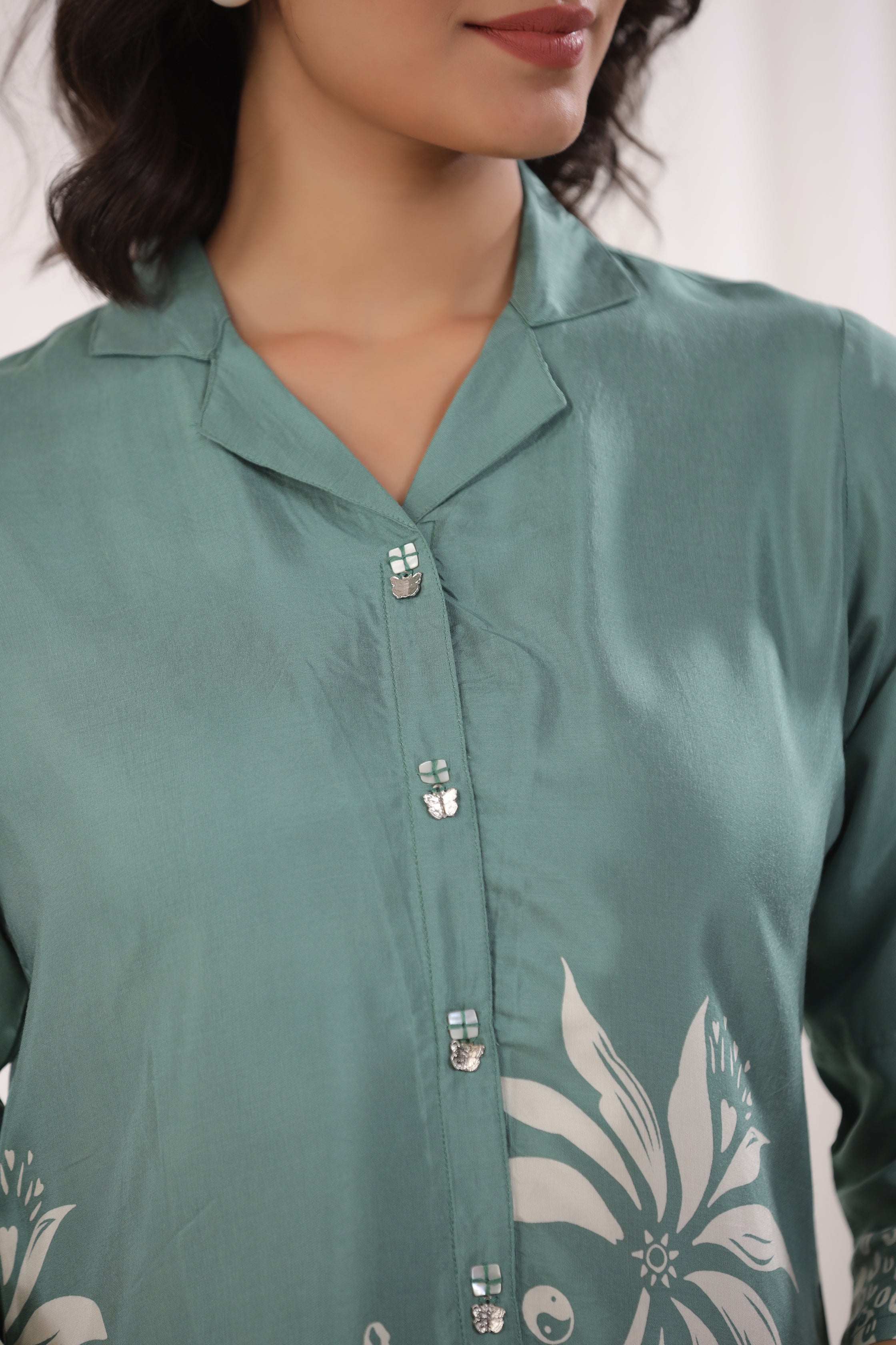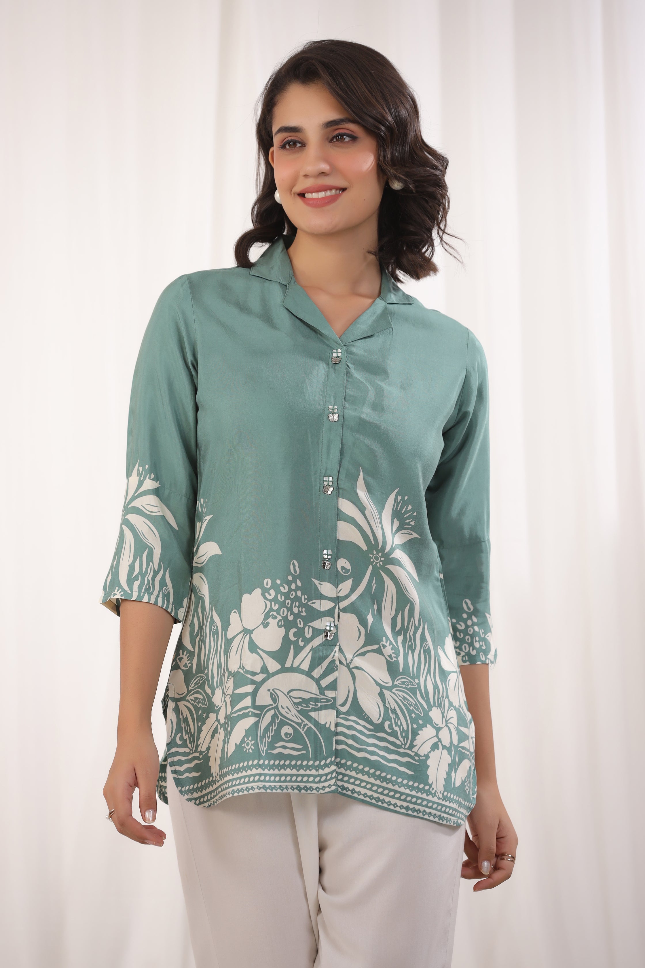 Elevate your everyday style with this elegant sage green floral top, crafted from luxurious Russian silk for a soft and sophisticated feel. Featuring a chic notch collar, shell buttons, and 3/4th sleeves, this top offers the perfect blend of comfort and elegance. Its timeless floral print and tailored fit make it a versatile choice for casual outings or relaxed gatherings.