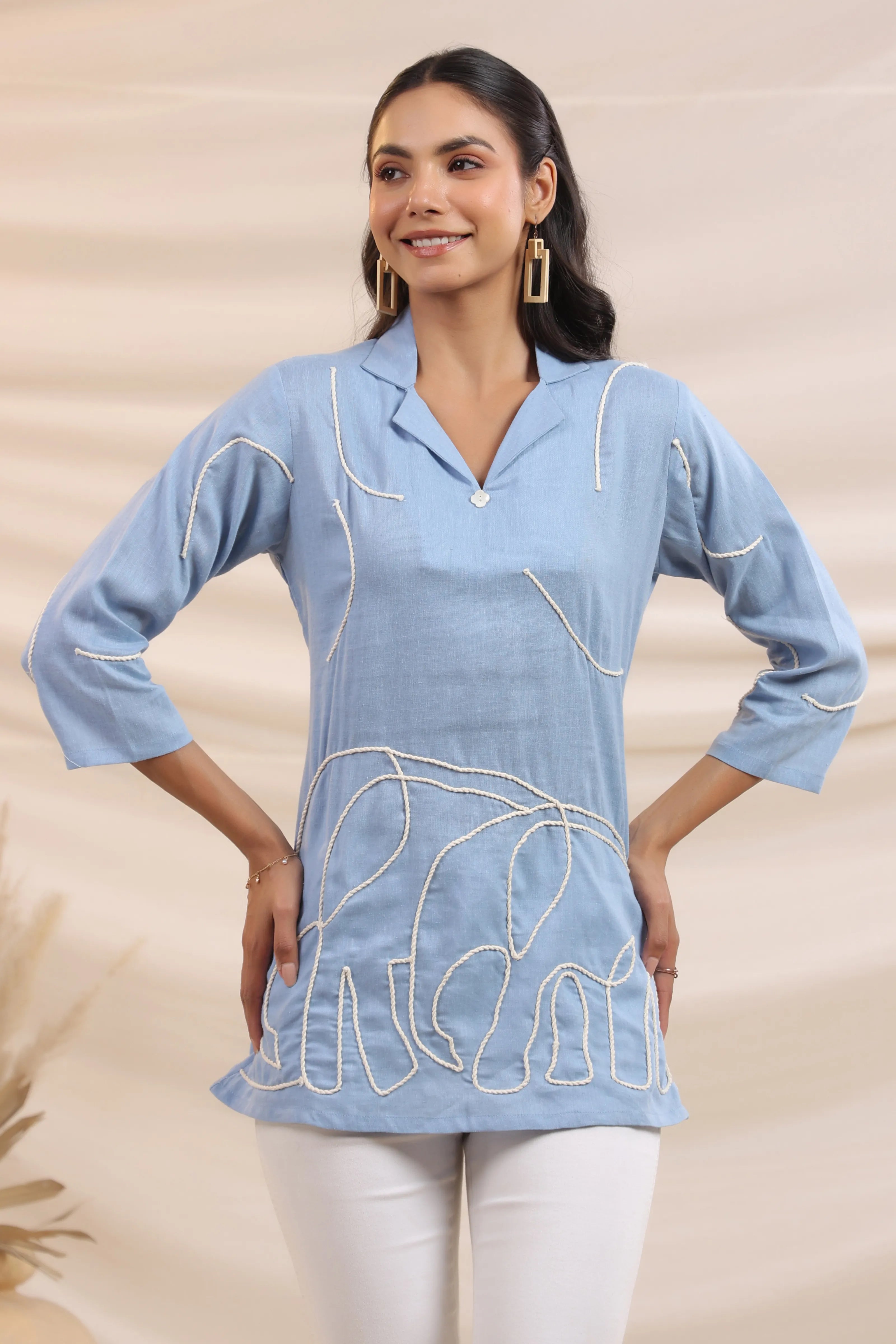 Bring a touch of playfulness to your everyday wardrobe with Elephant Trails, a breezy cotton-linen tunic designed to charm. This sky-blue stunner is elevated with delicate cord work tracing out abstract elephant motifs, blending whimsy with artful craftsmanship.