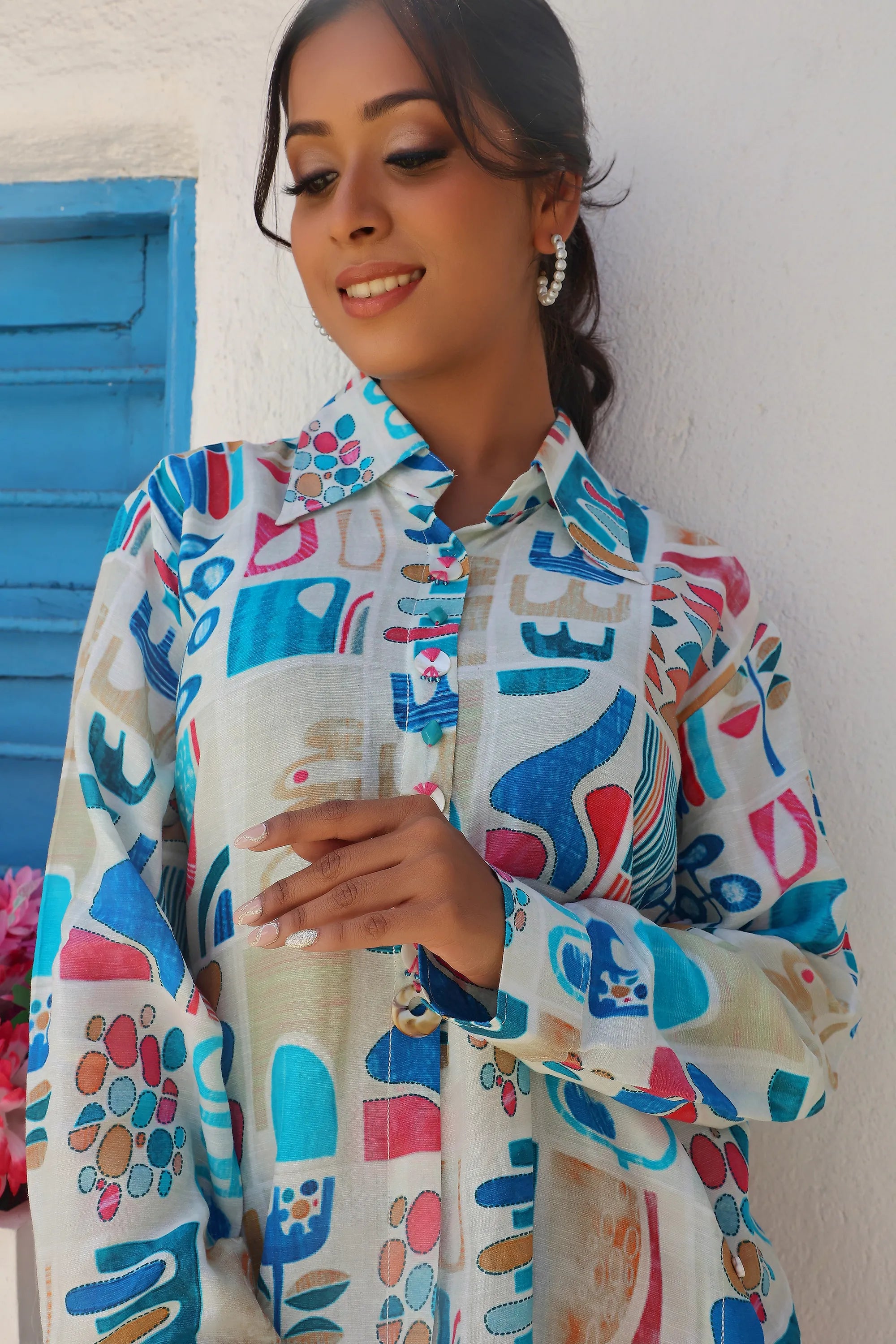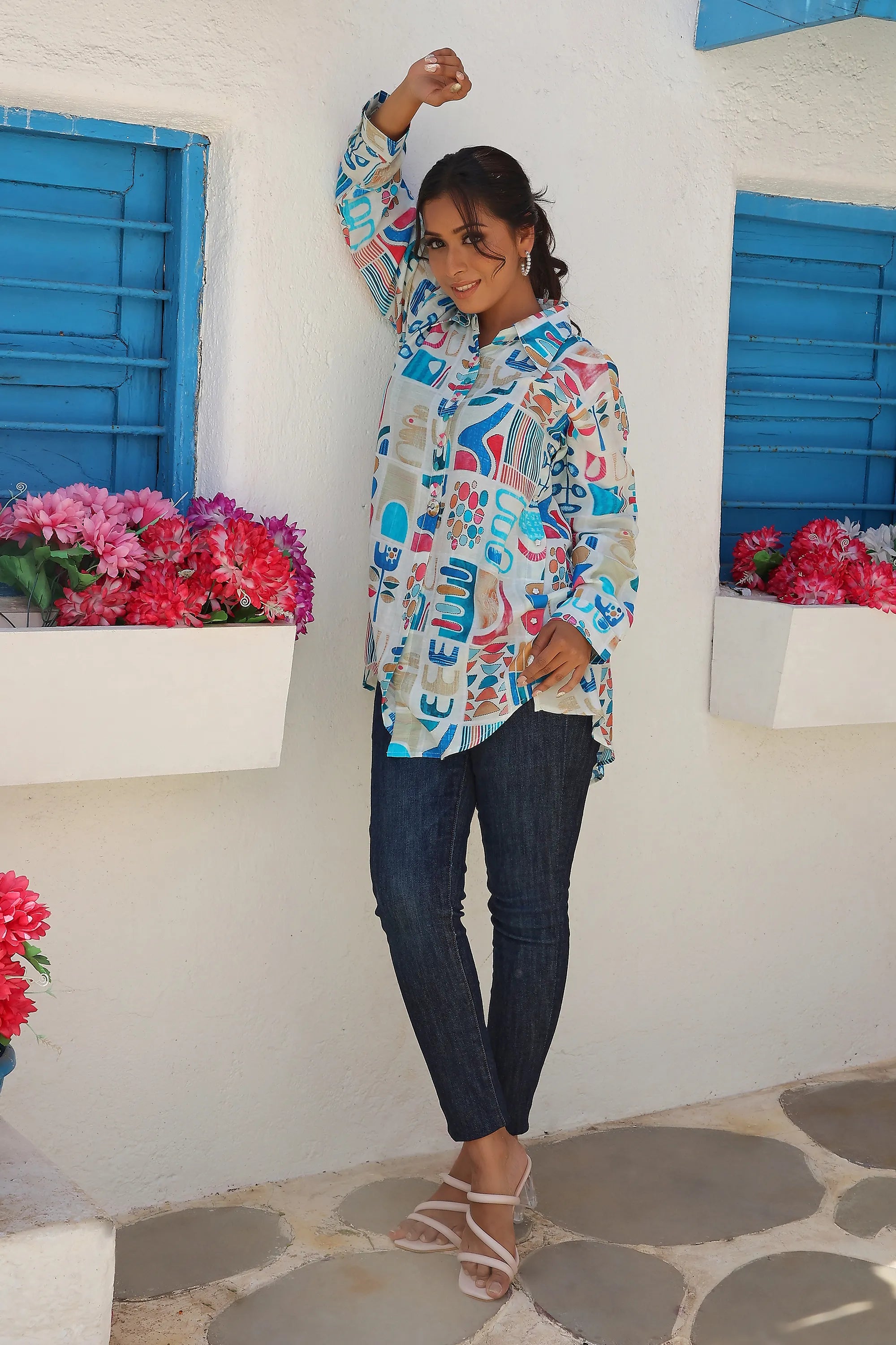 Elevate your casual wear with this elegant White Longline Printed Shirt Style Tunic, featuring delicate bead embellishments for a touch of sophistication.