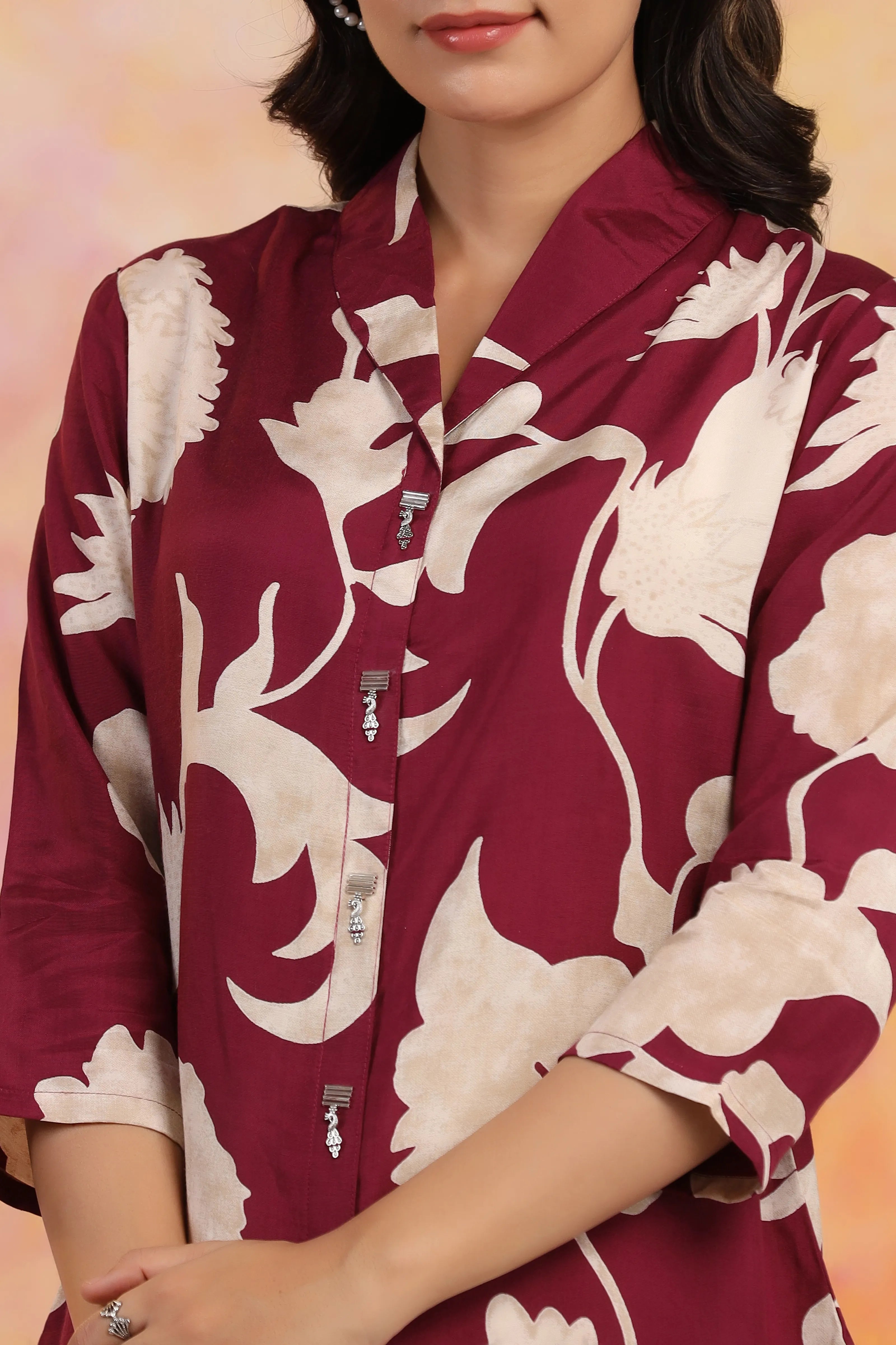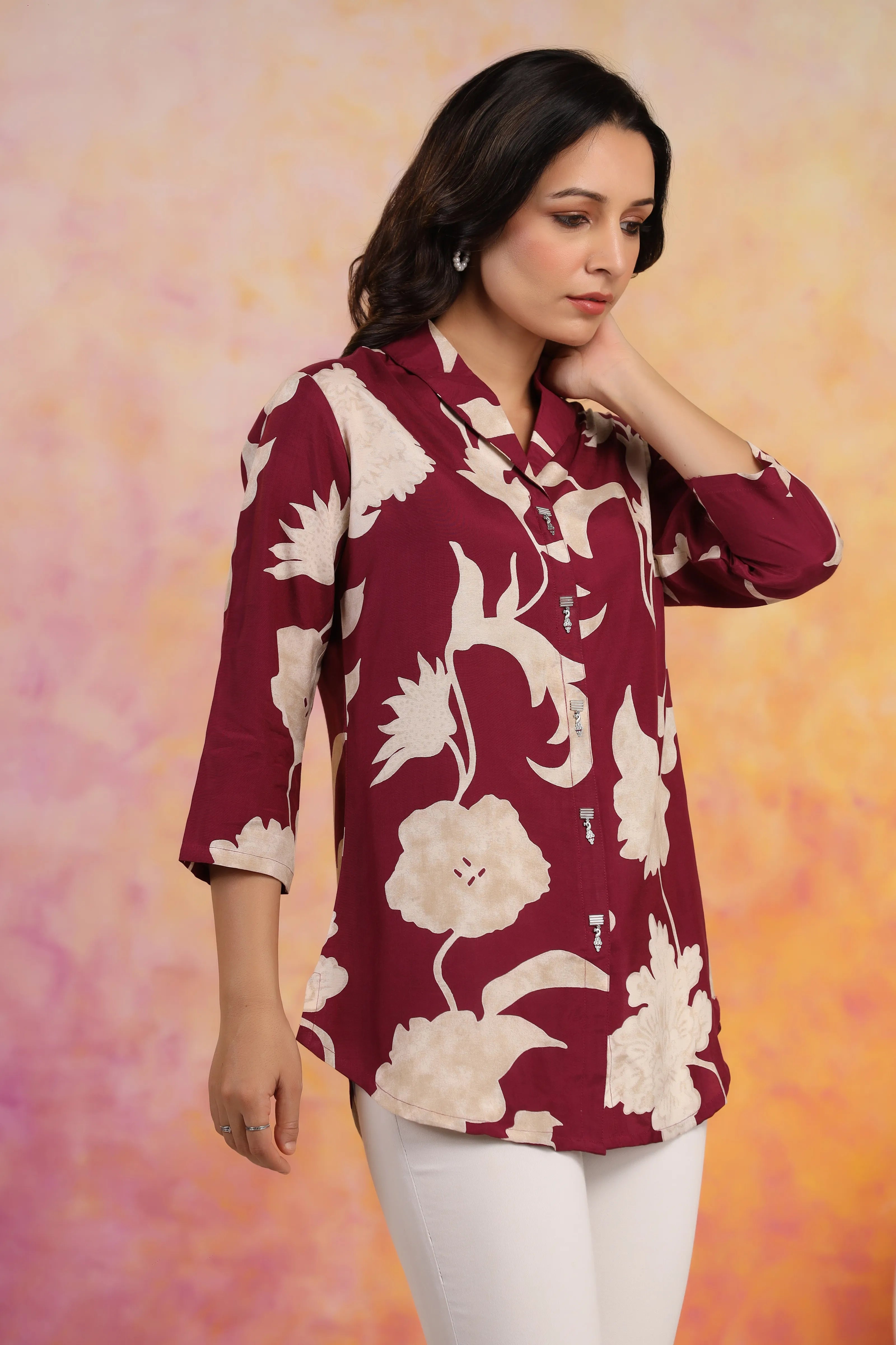 Elevate your wardrobe with an artful blend of tradition and contemporary elegance in this wine-hued shirt-style top. Crafted in luxurious Russian silk, the silhouette flows with fluid grace while maintaining an effortless charm. The standout feature? A bold cream abstract floral print that cascades with organic finesse—offering a modern interpretation of botanical elegance.