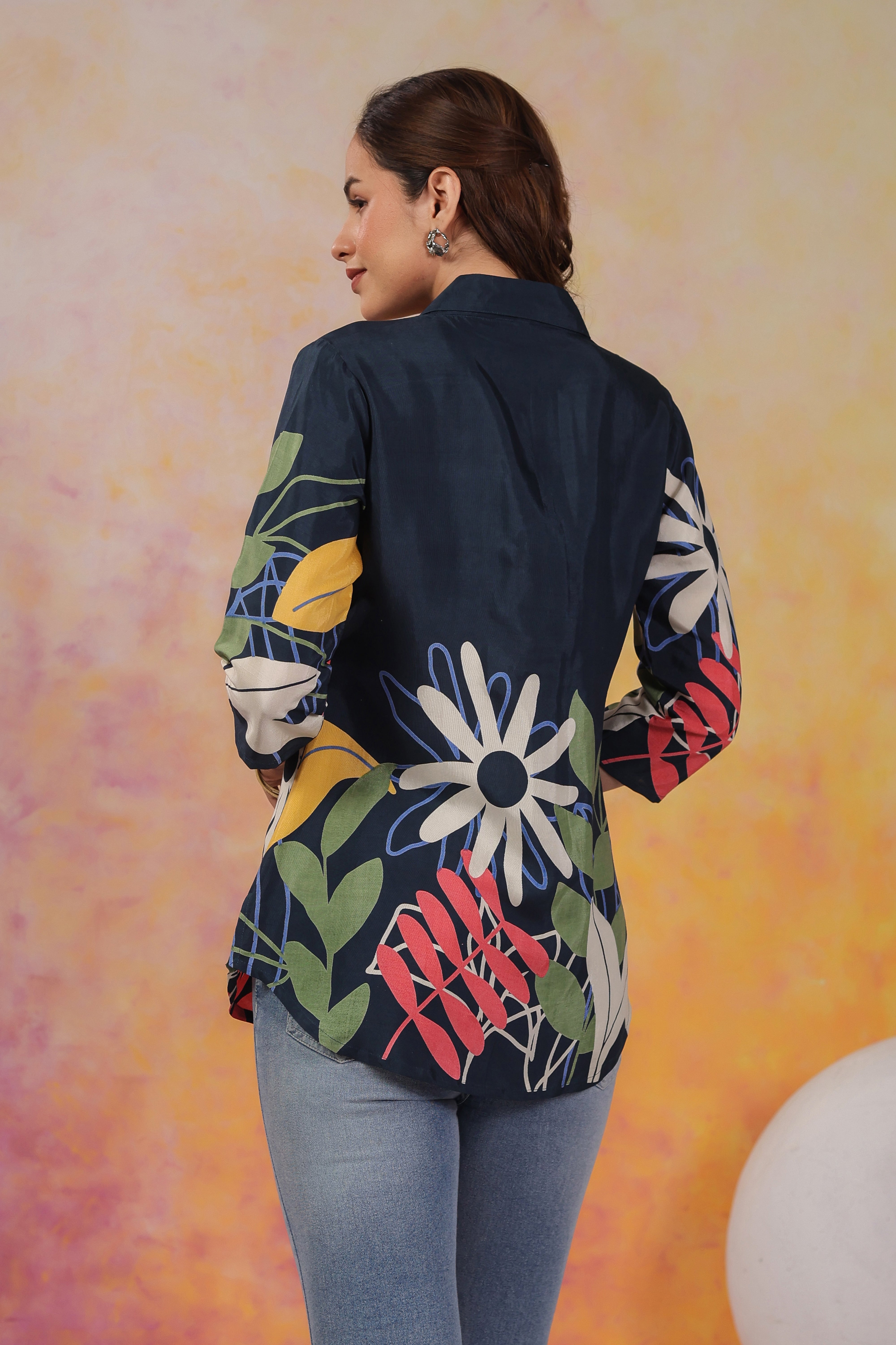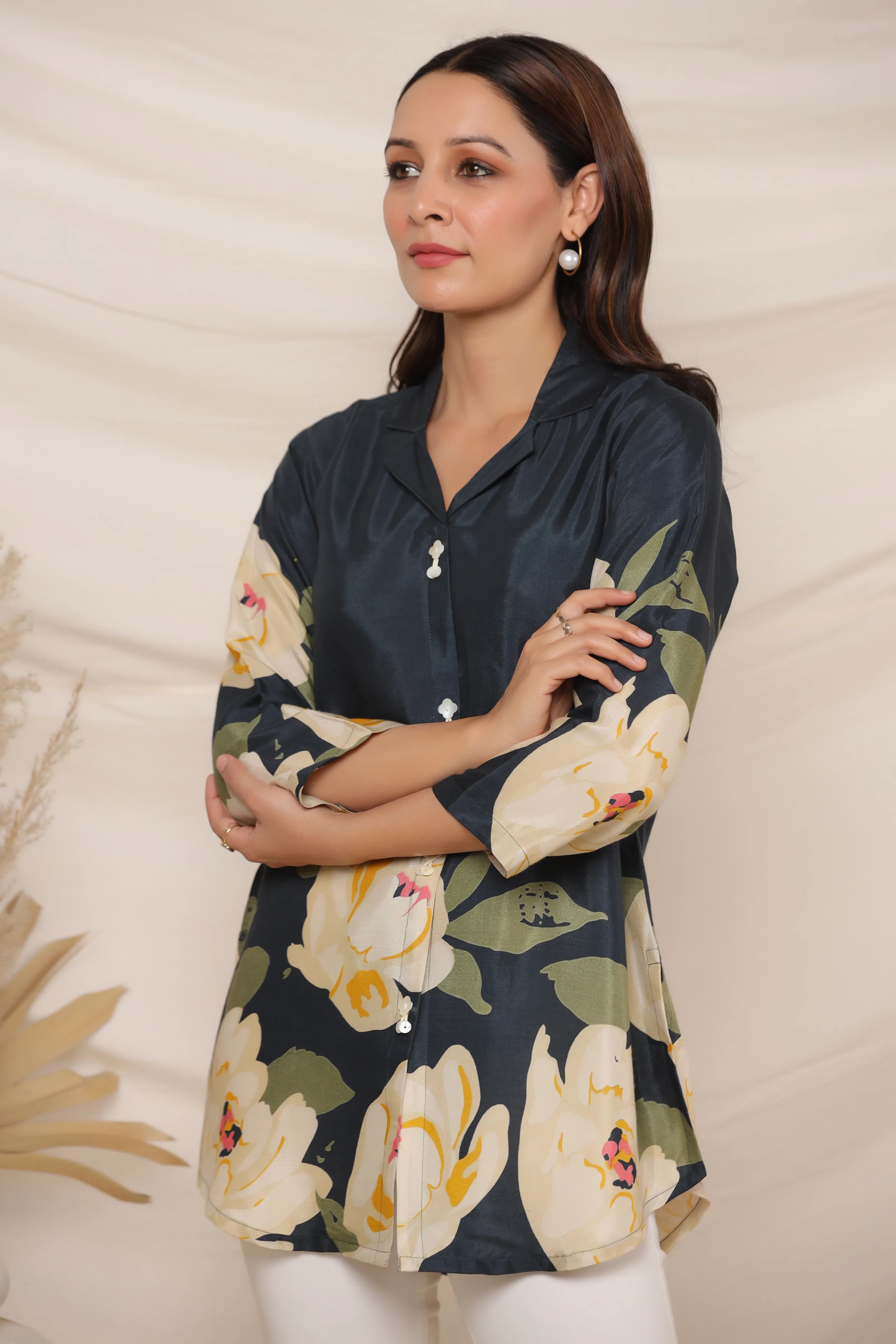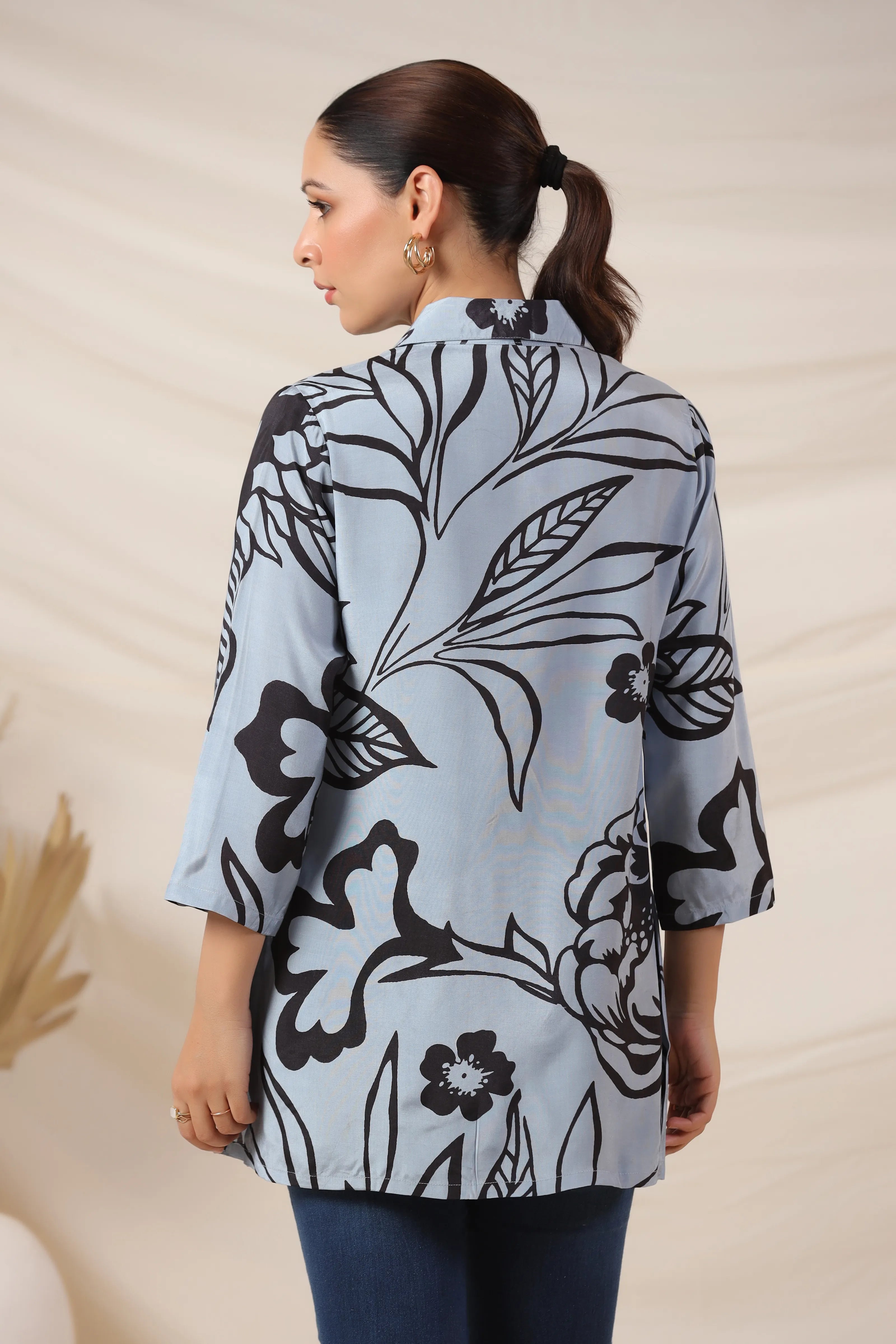 Botanical Print Mandarin Collar Top