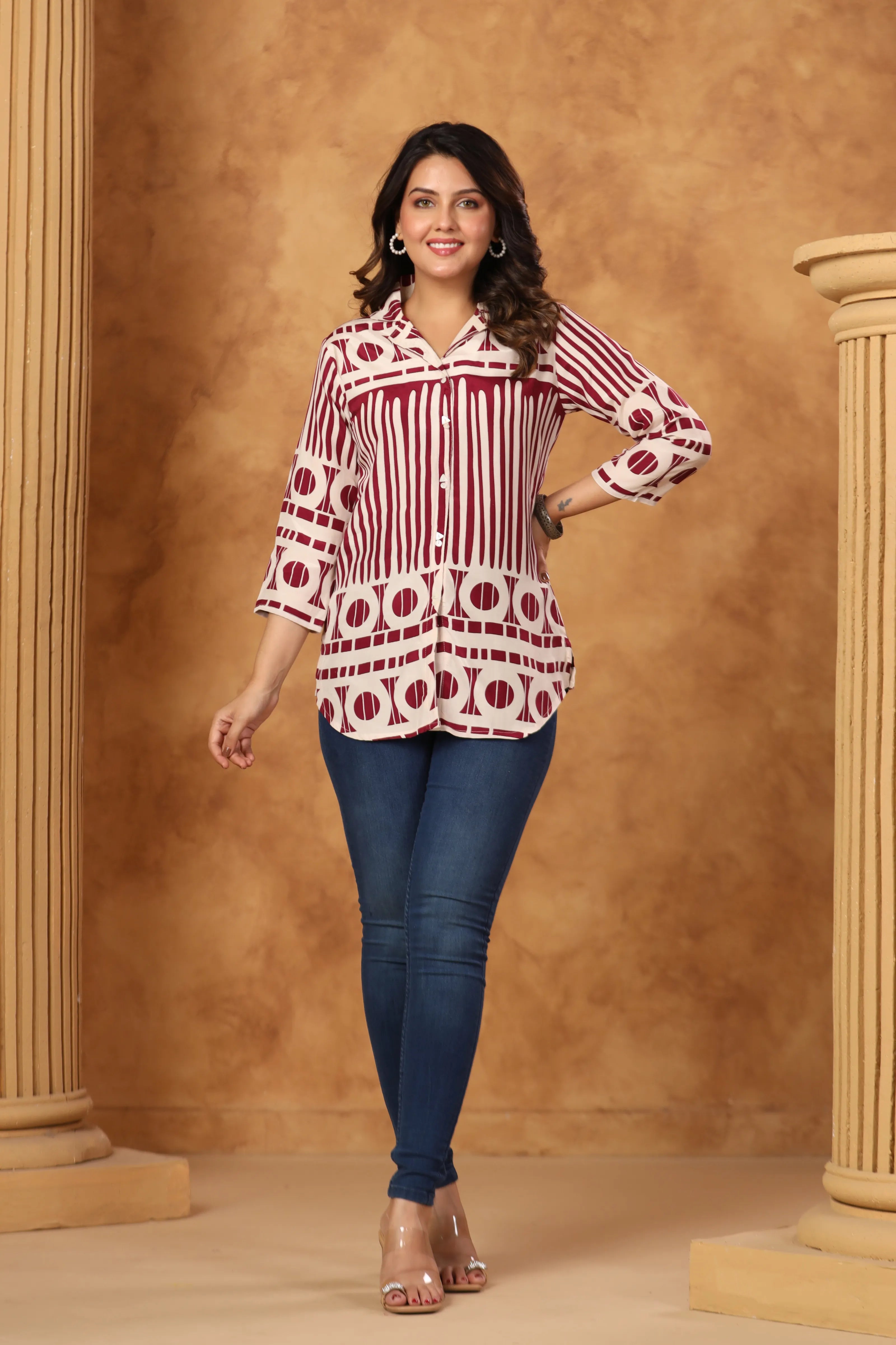 Maroon Floral Printed Russian Silk Tunic with Notch Collar