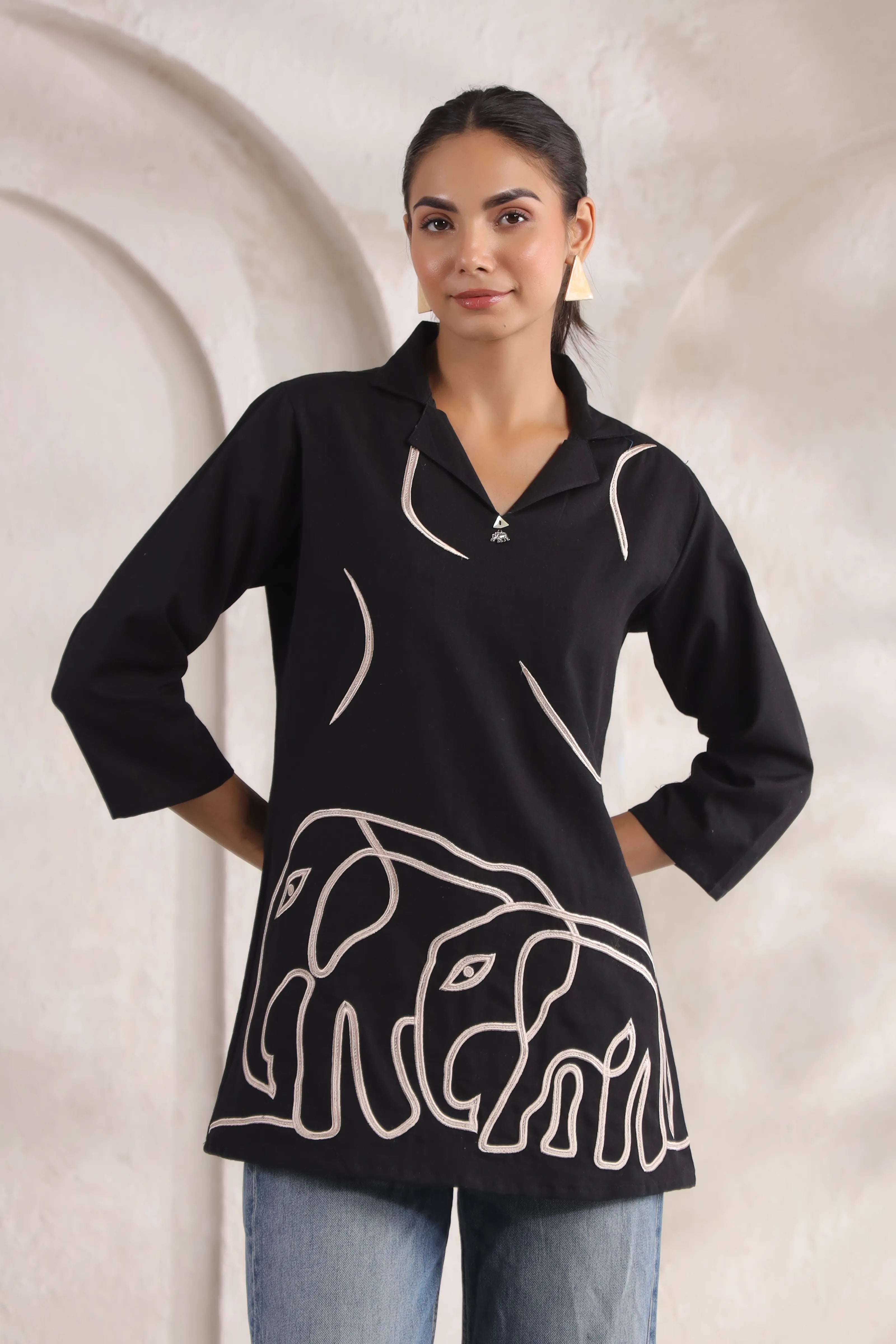 Black Elephant Motif Tunic in Cotton Flex