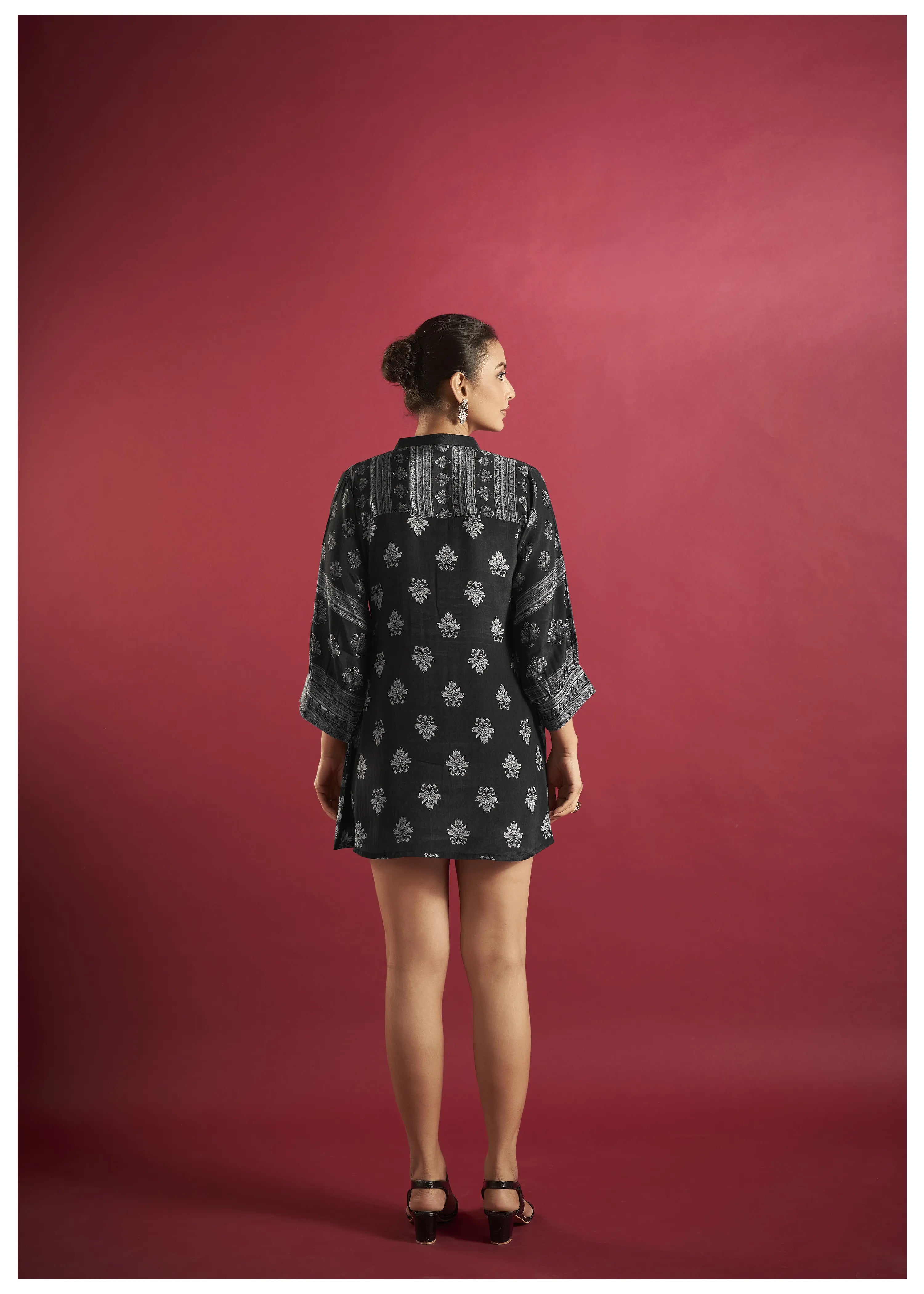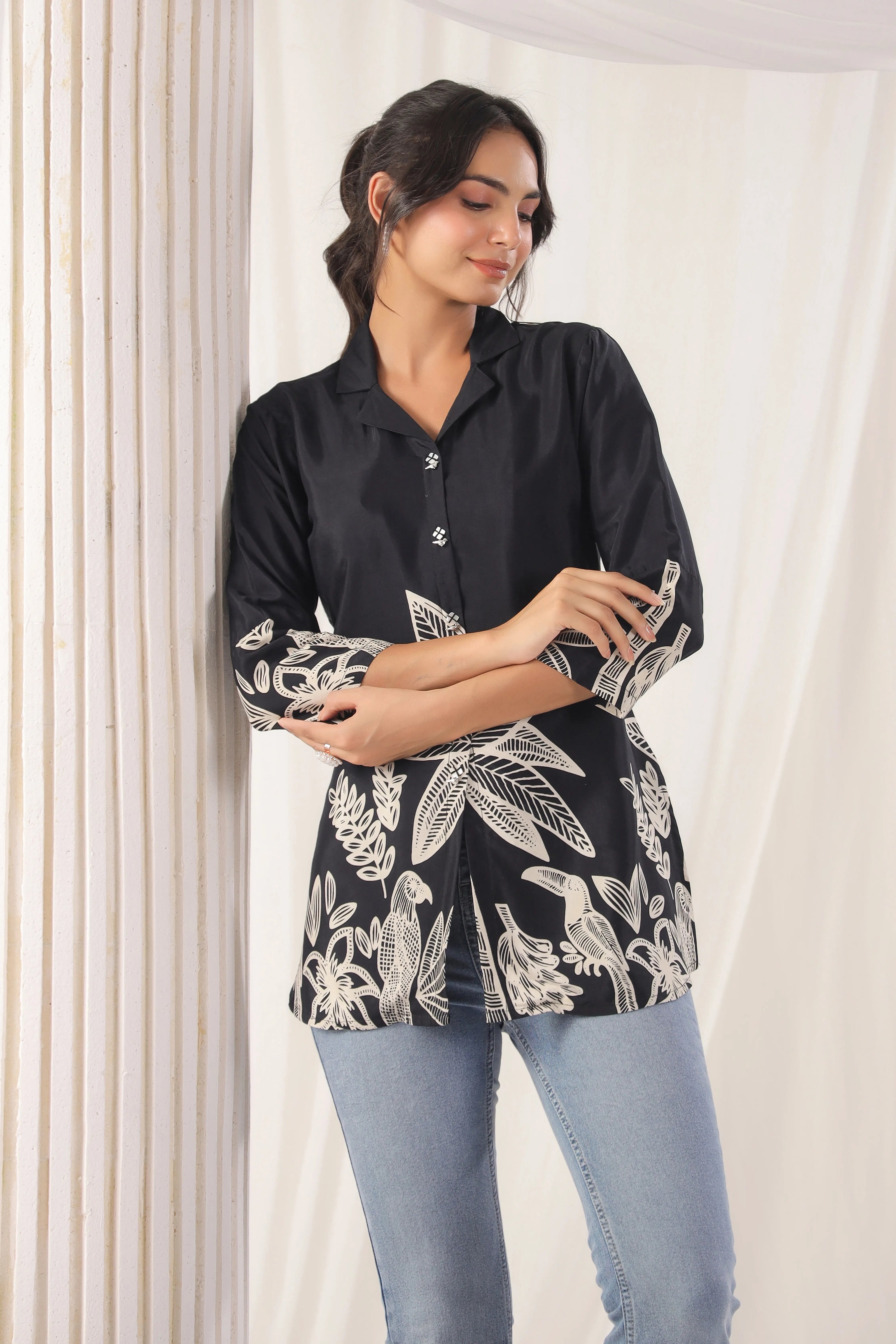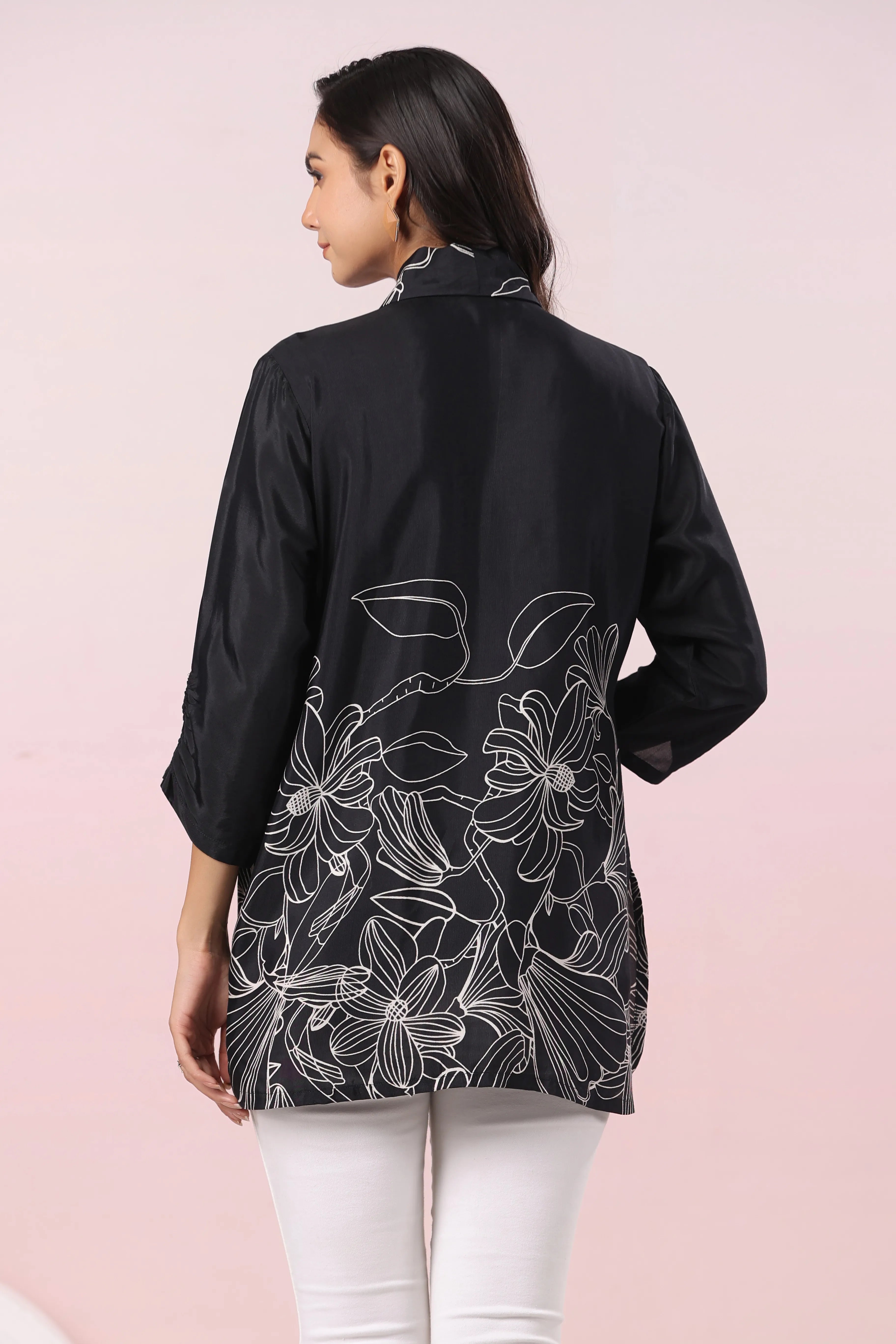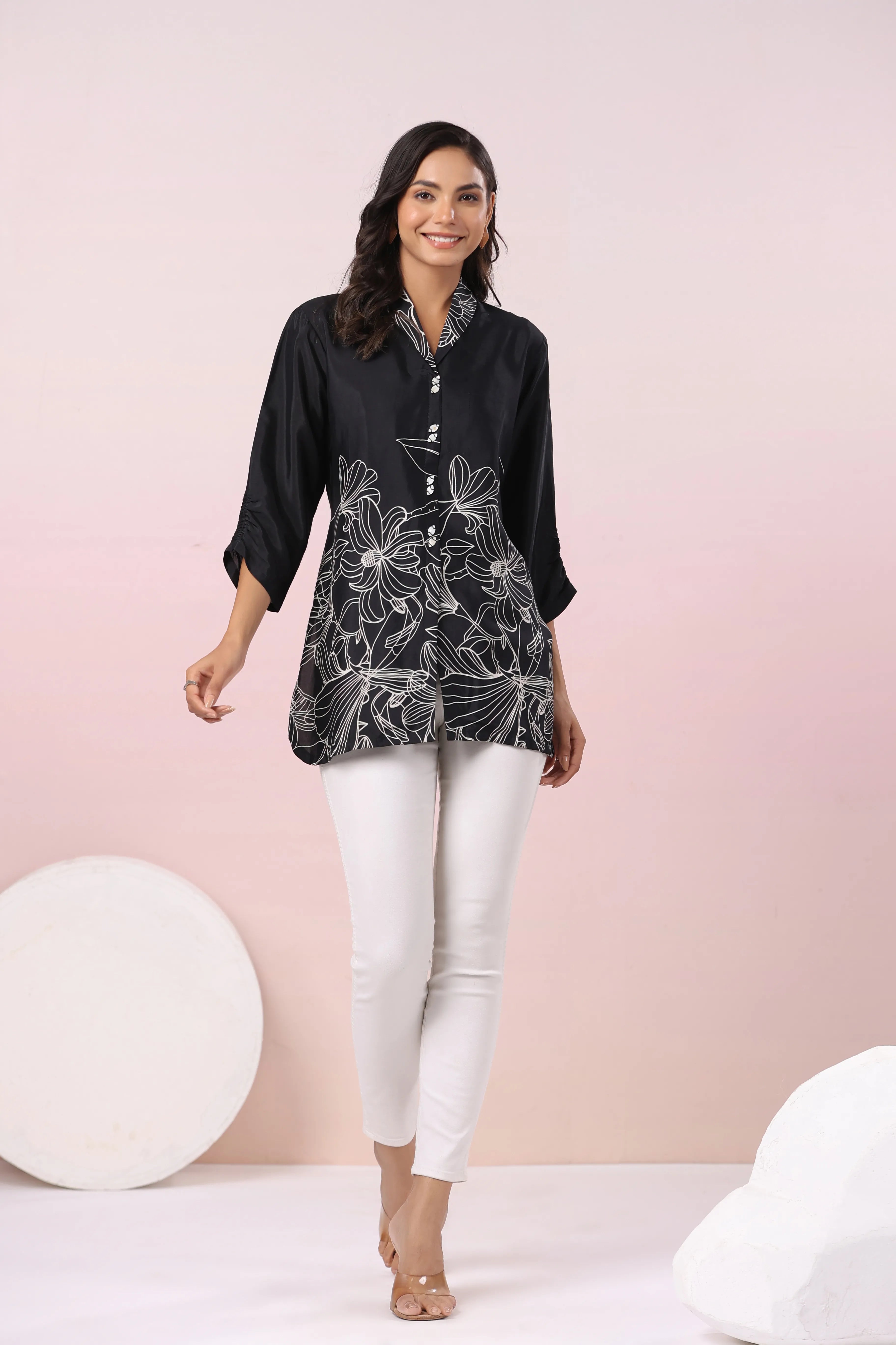 Black Crepe Floral Printed 3/4 Sleeve Tunic