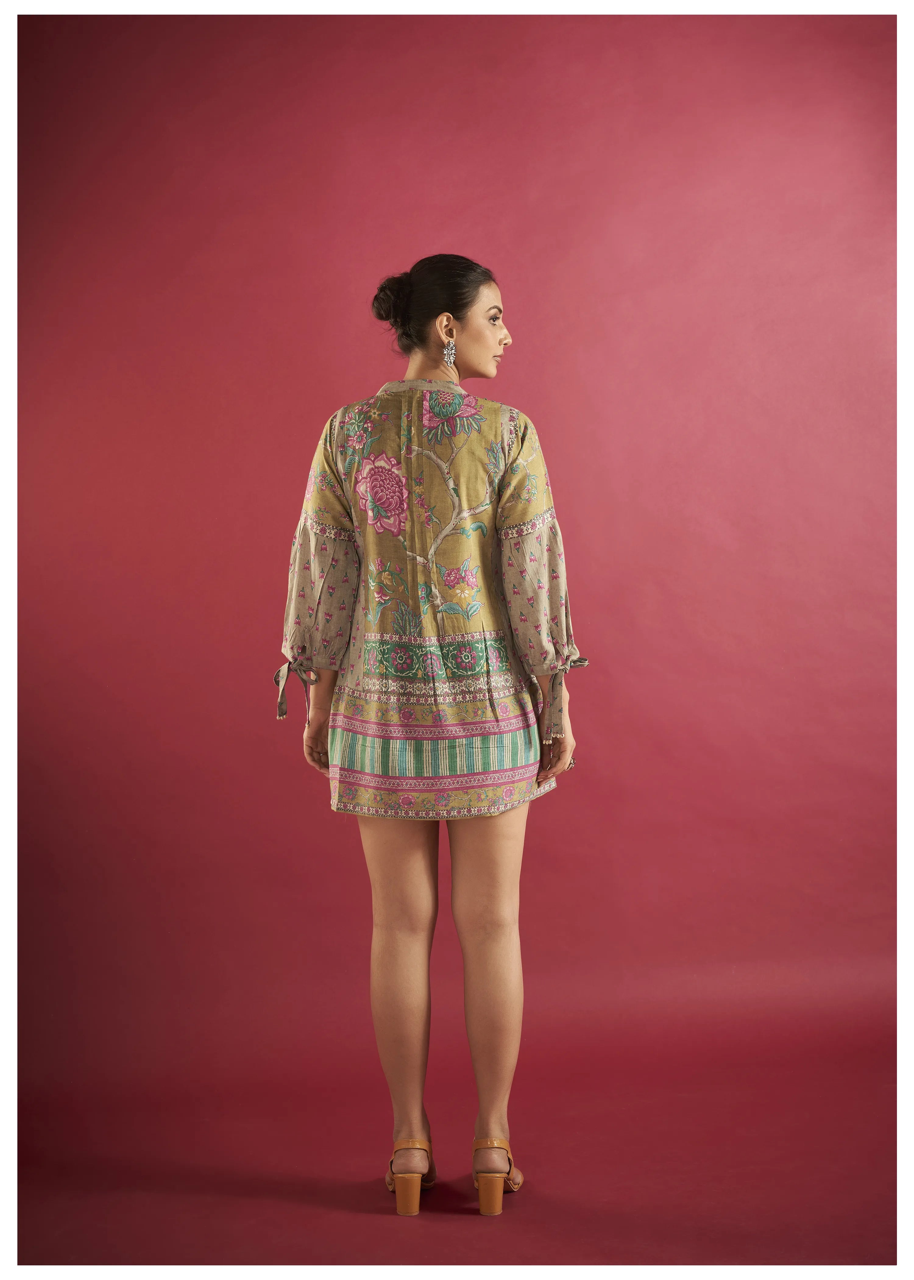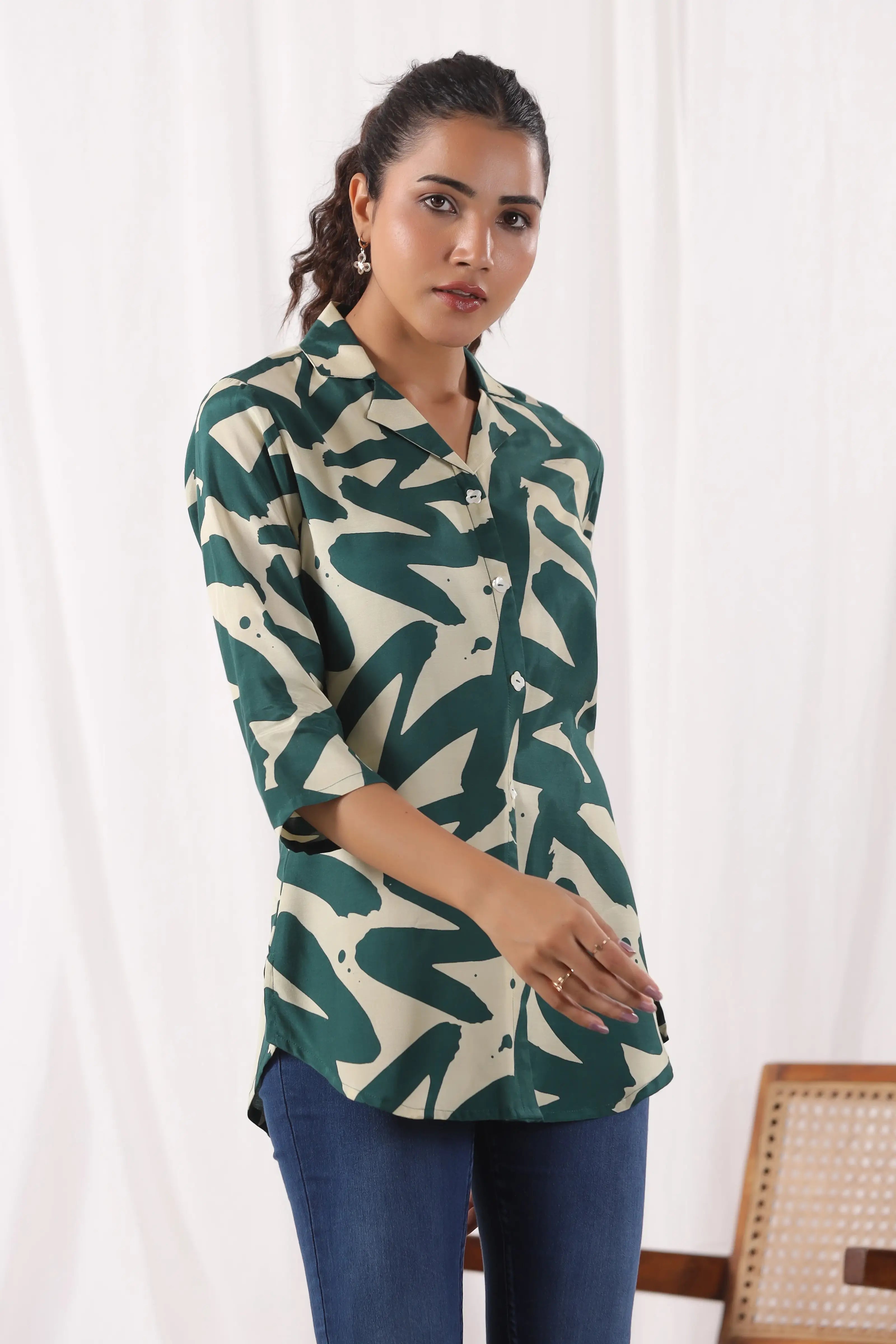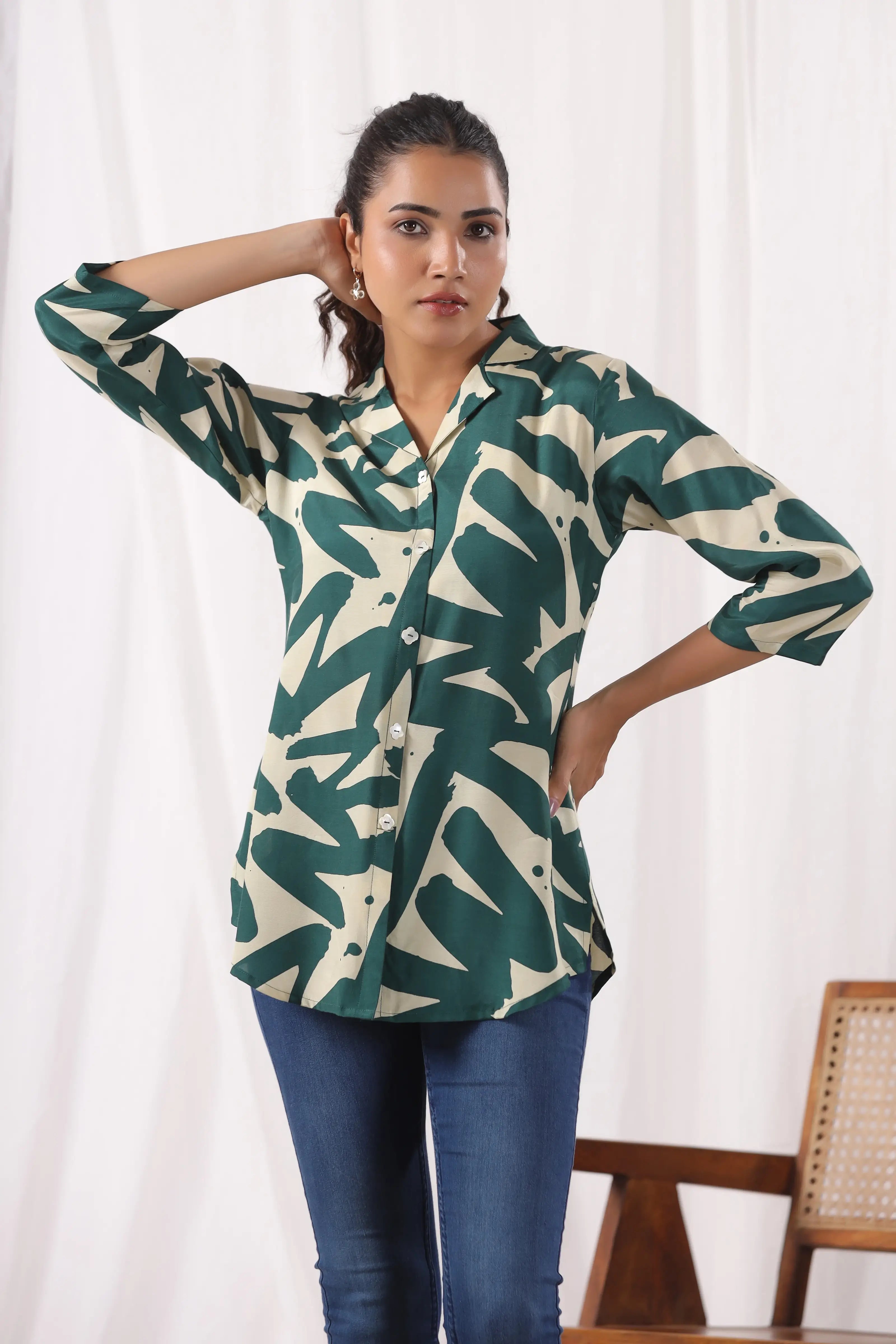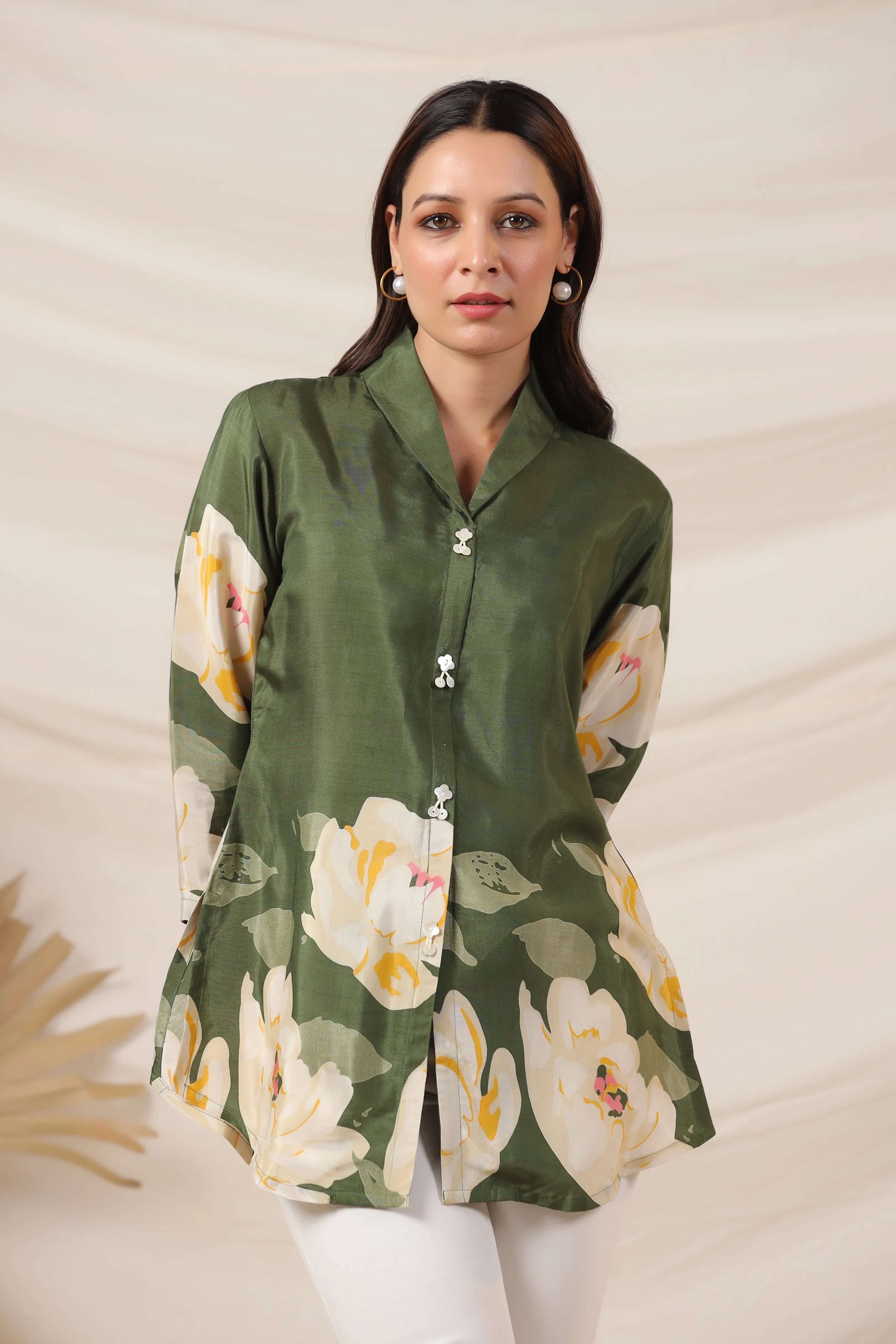 Dark Green Abstract Floral Notch Collar Russian Silk Tunic