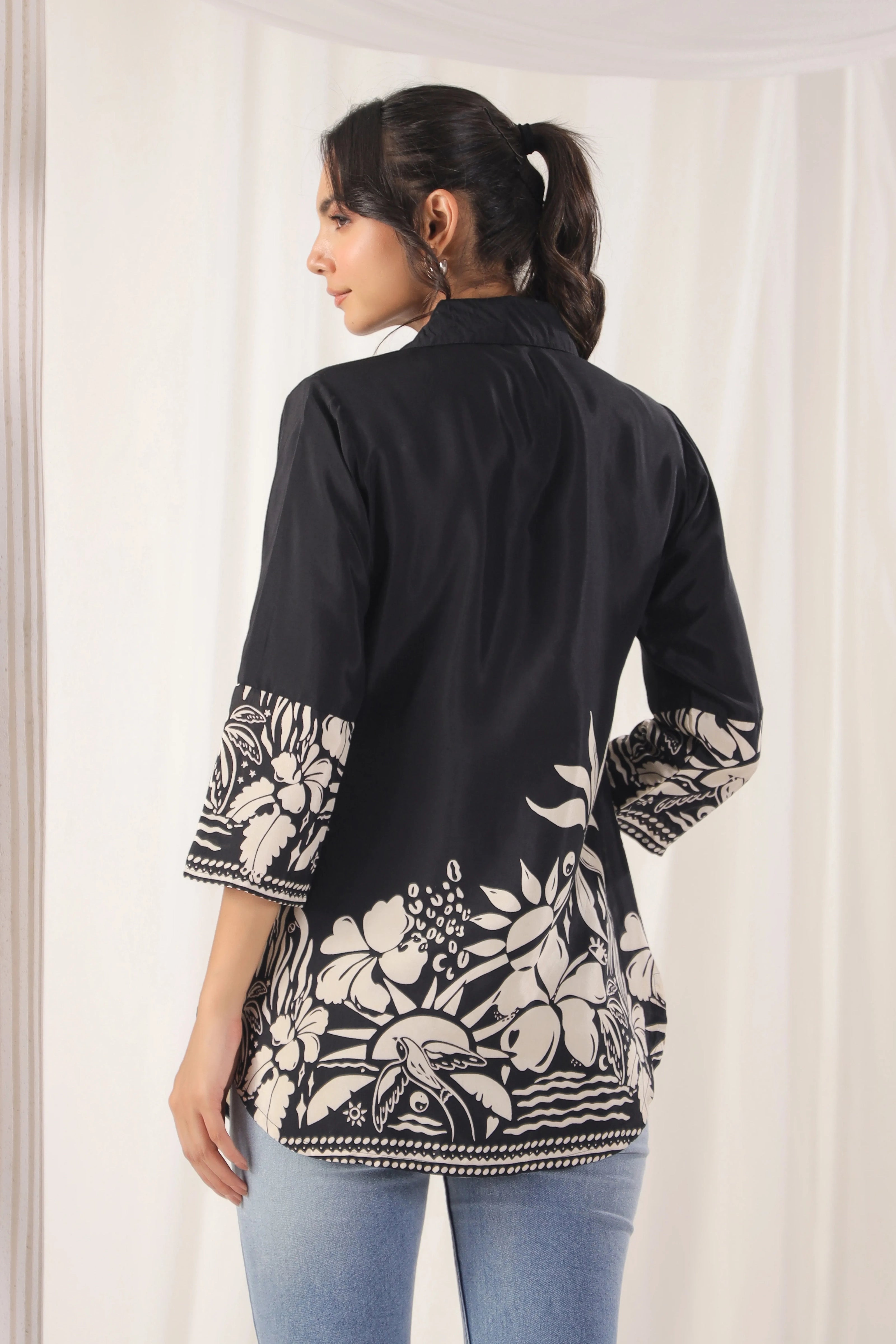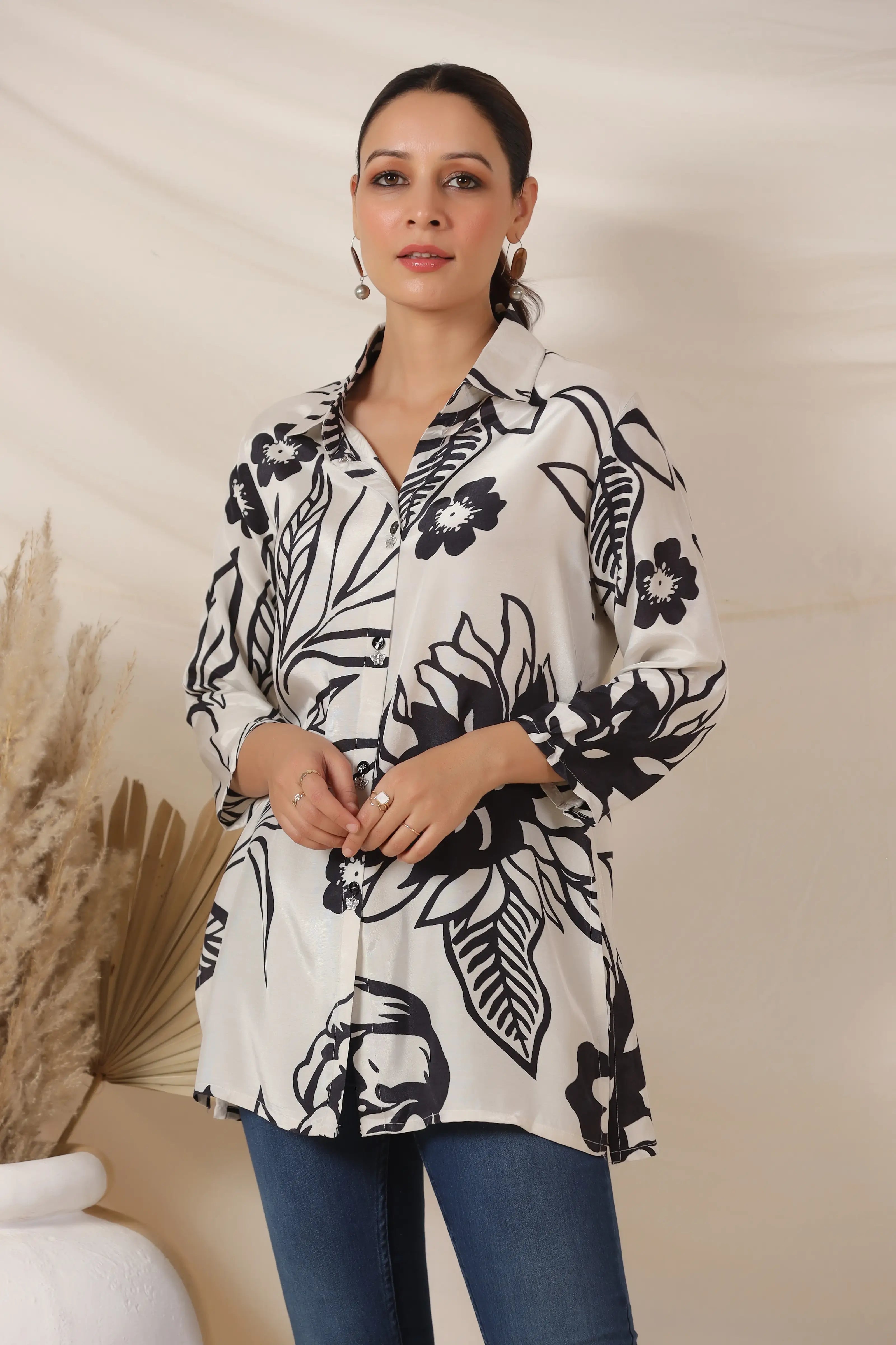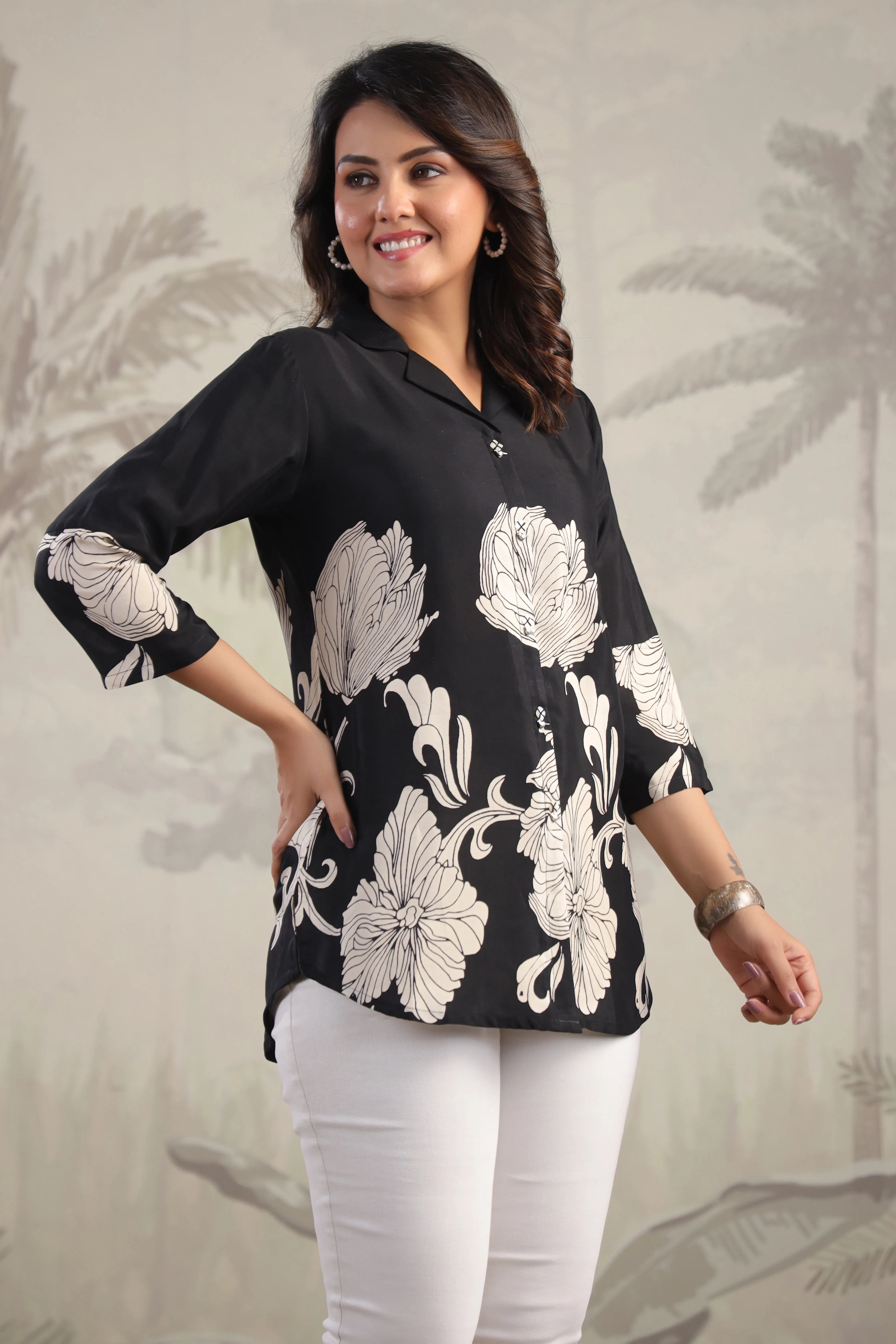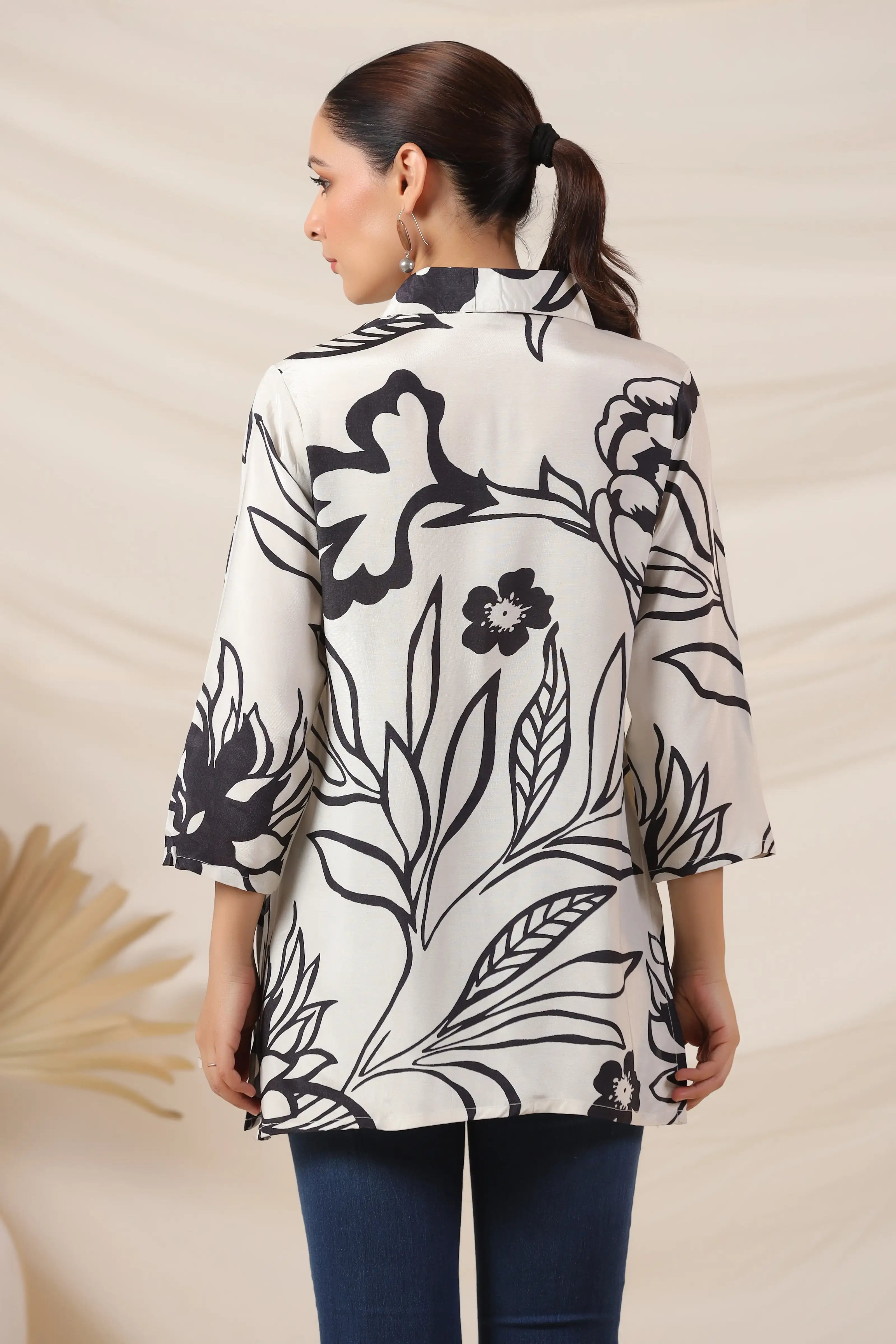 Off White & Black Bold Floral Print Russian Silk Top with Golden Buttons
