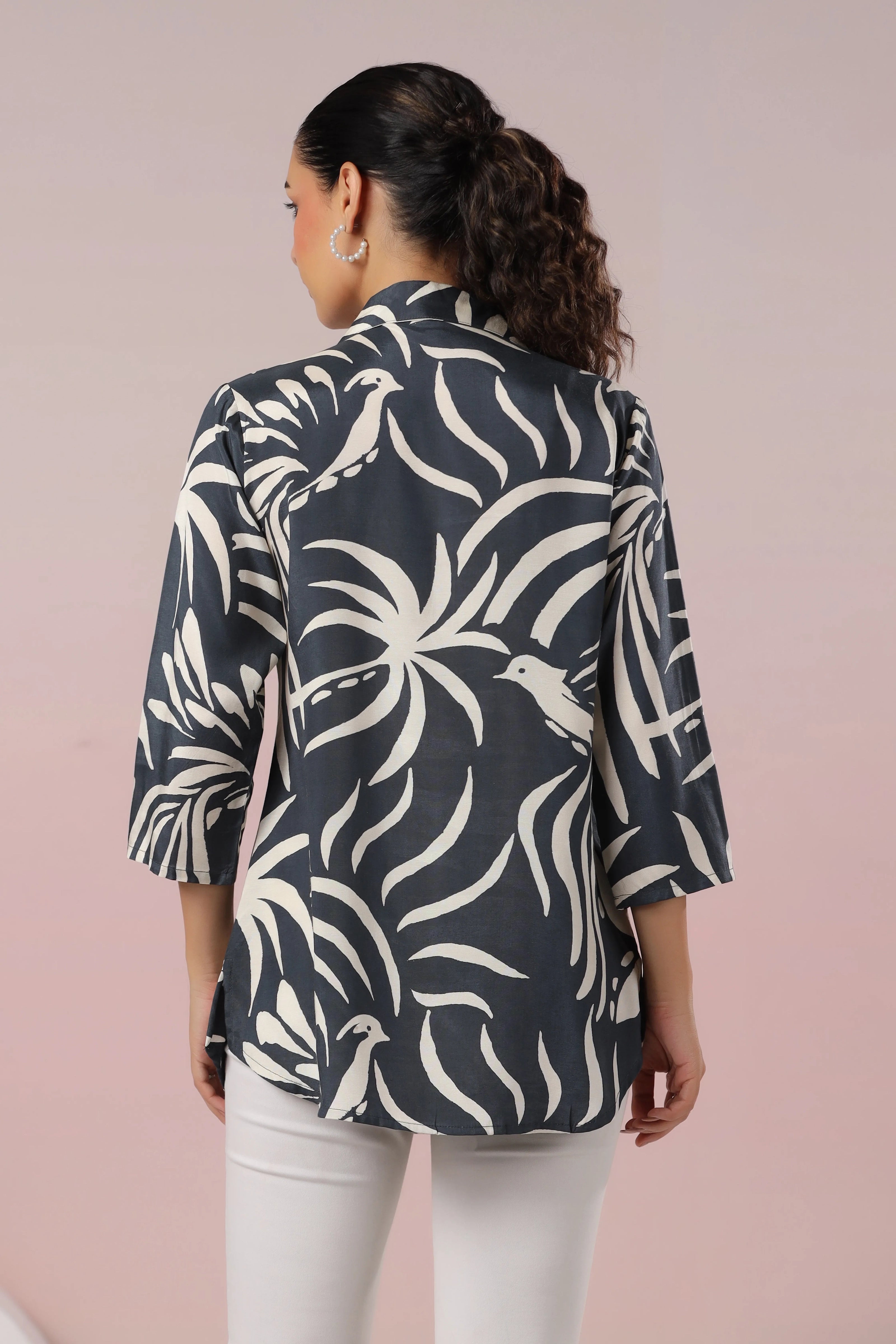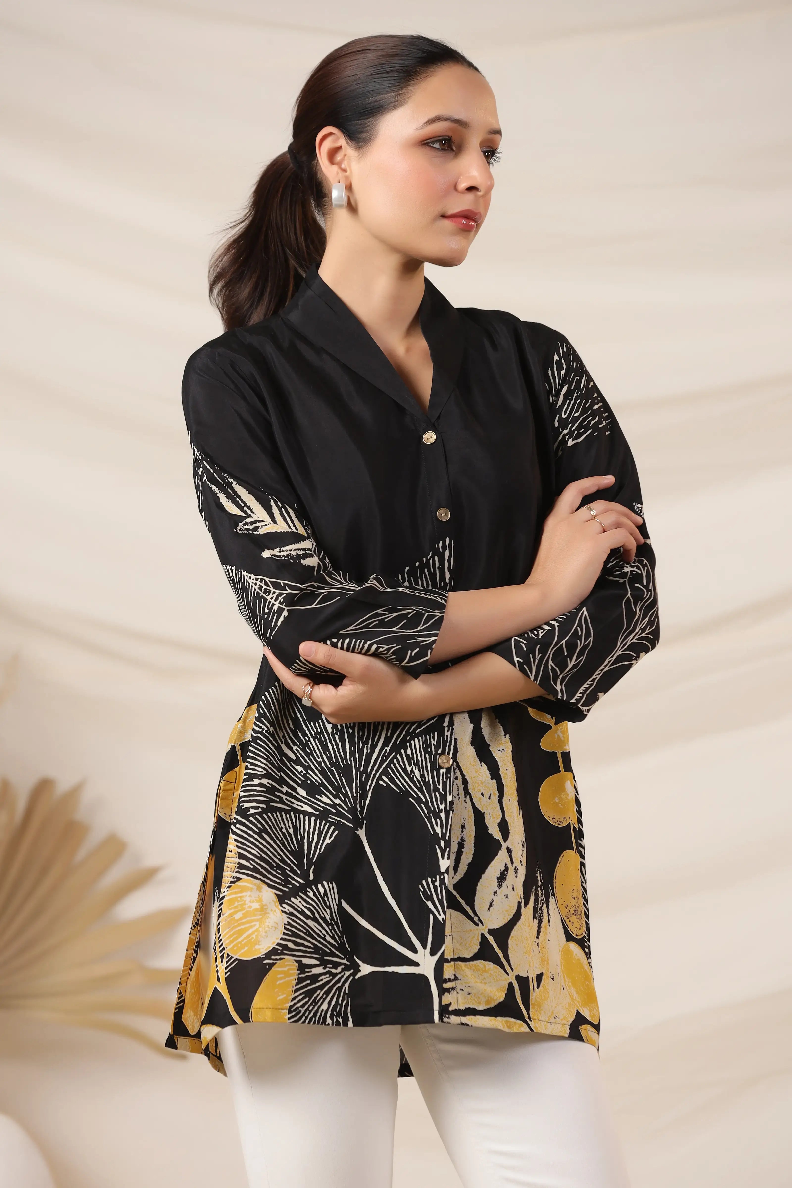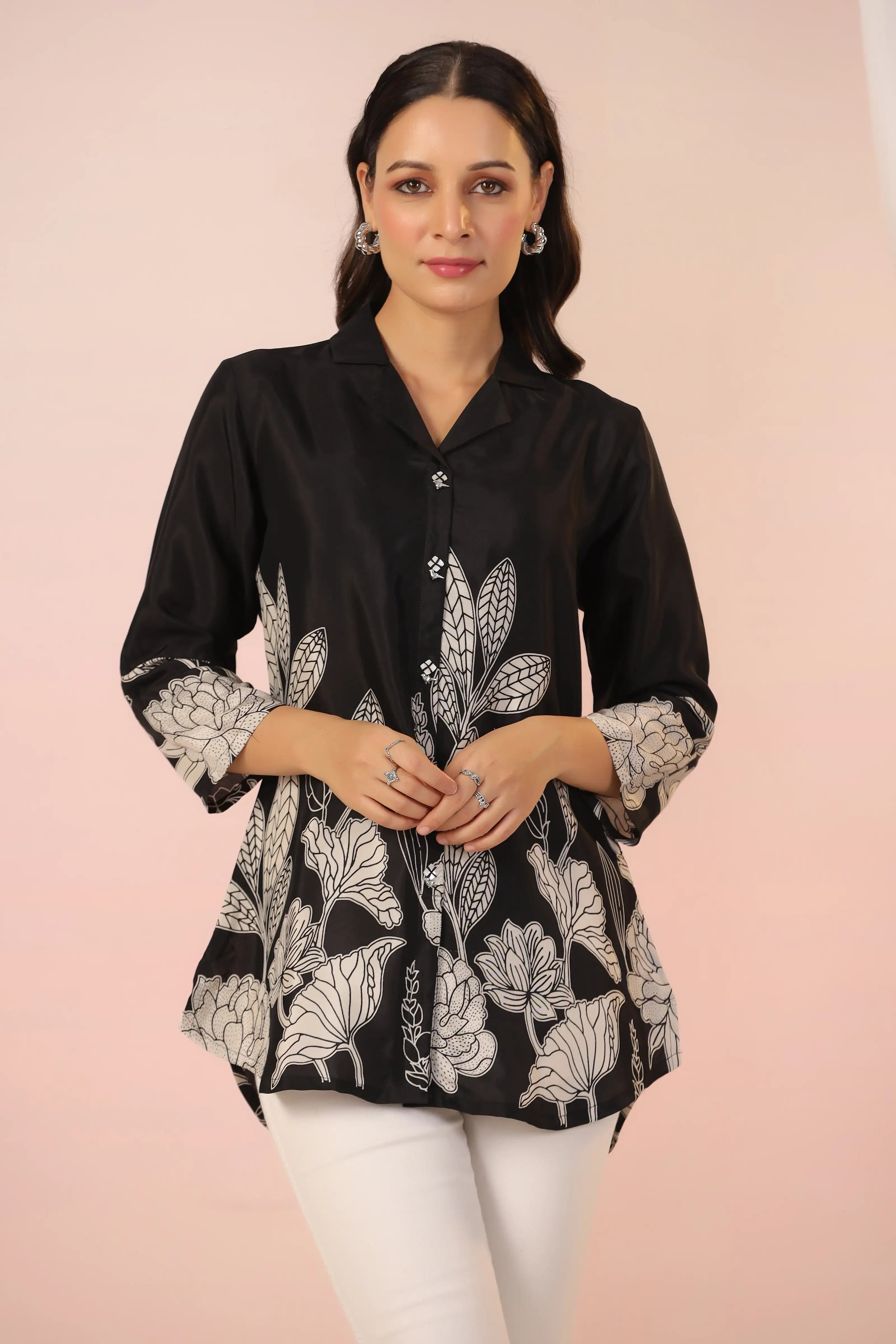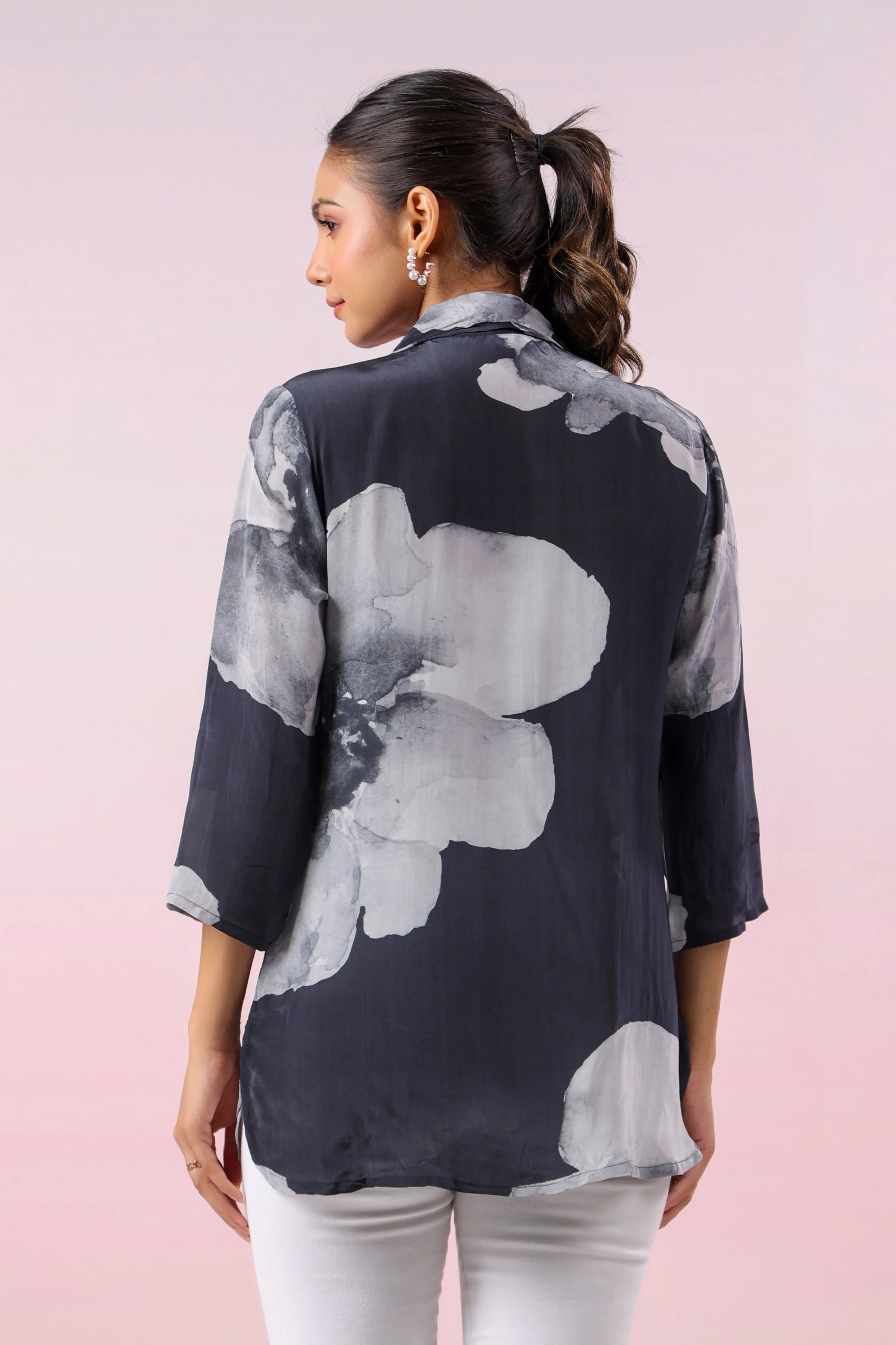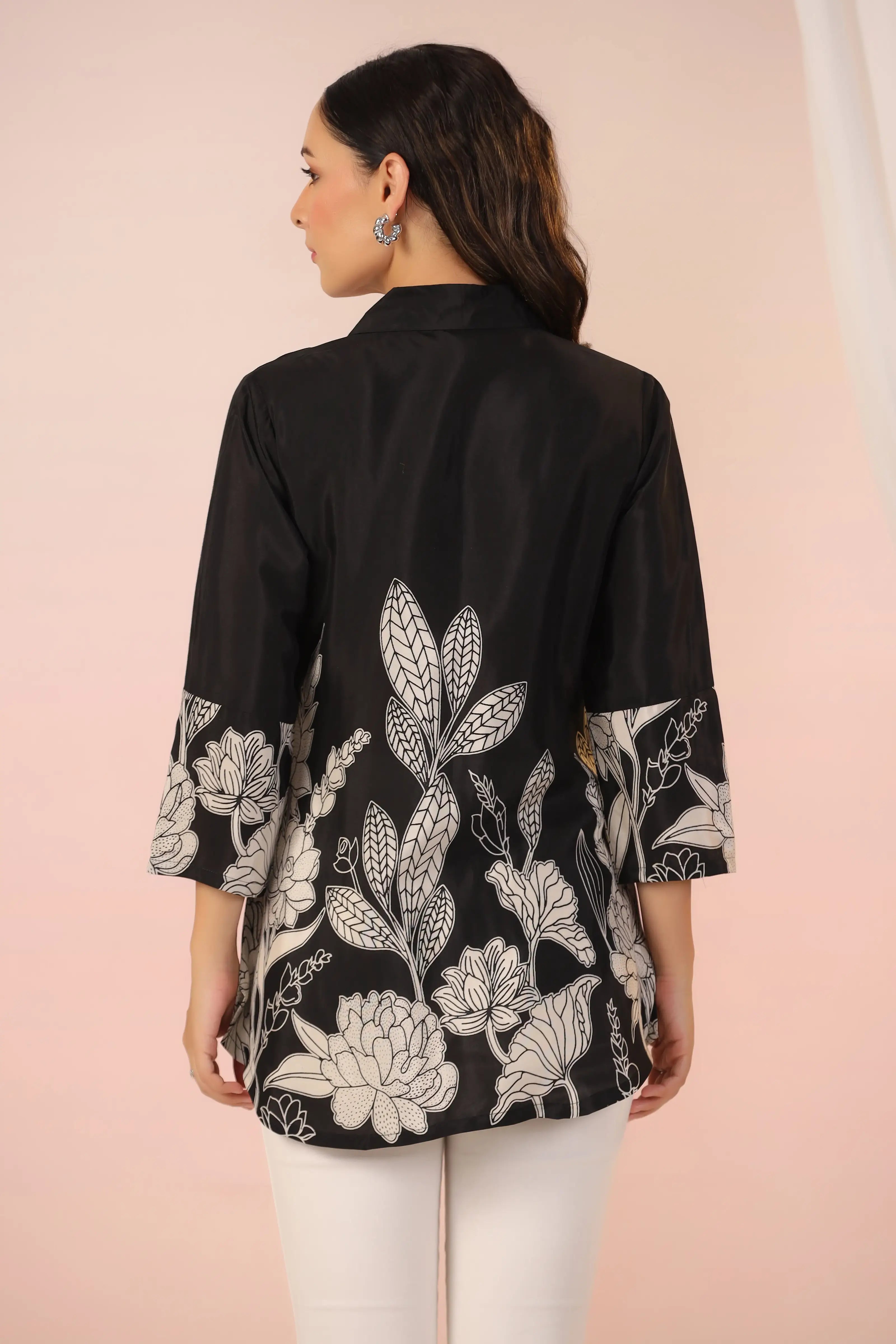 Off White & Black Bold Floral Print Russian Silk Top with Golden Buttons