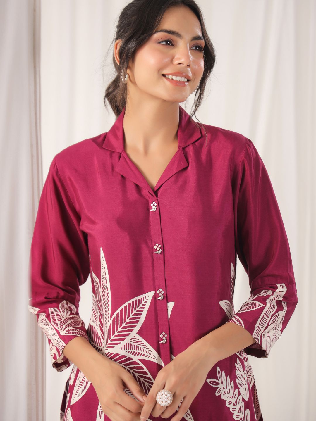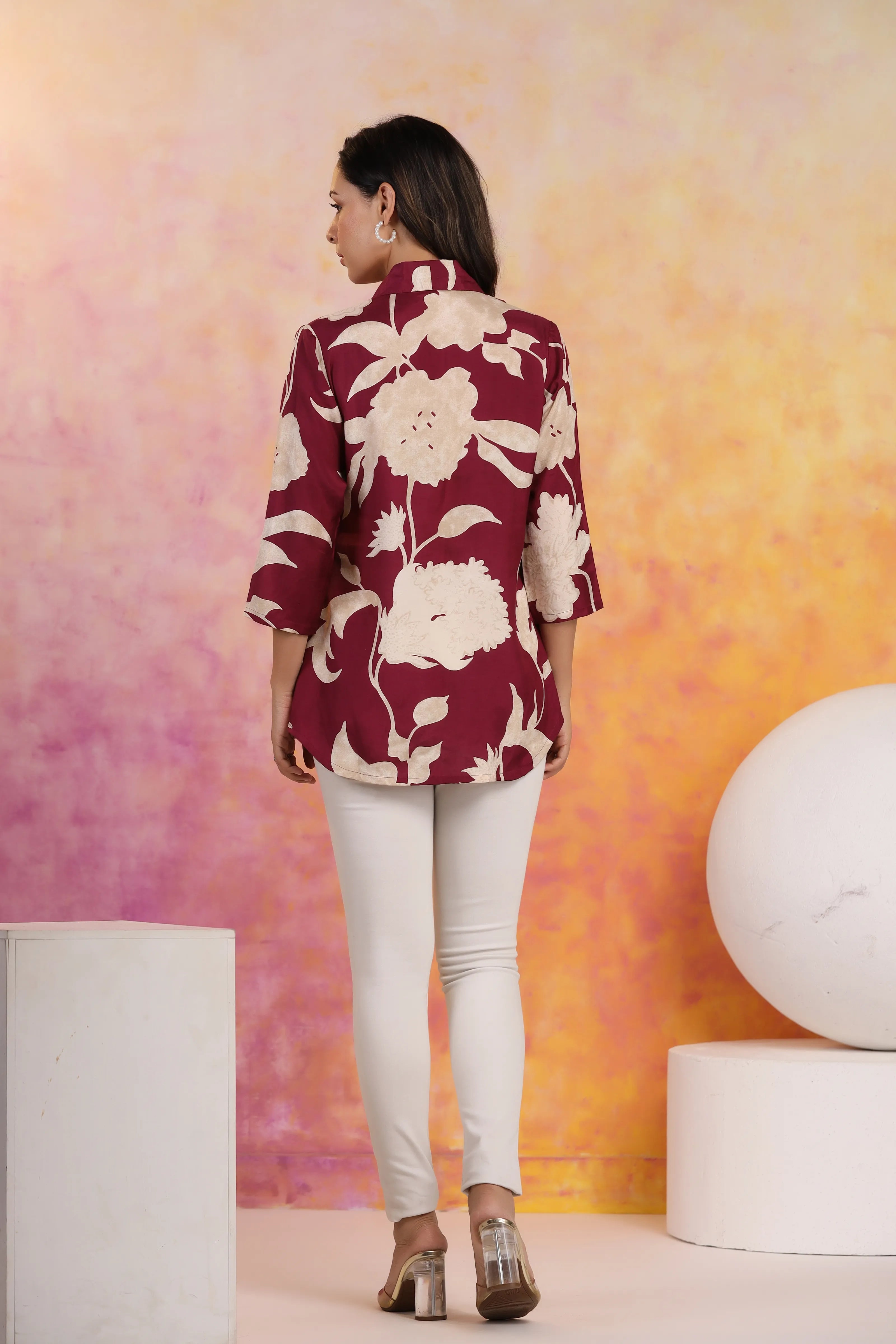Wine Bold Floral Notch Collar Russian Silk Tunic