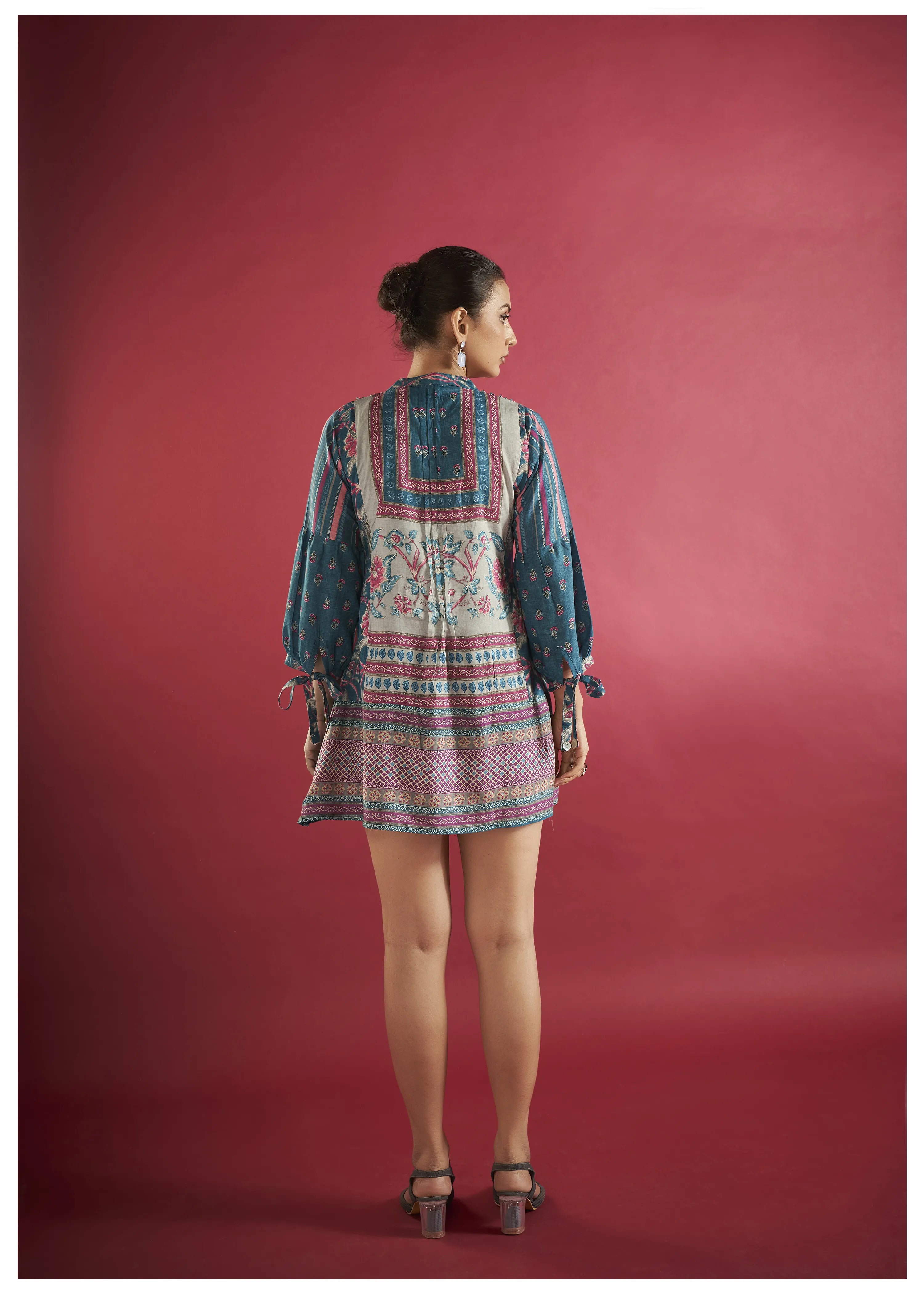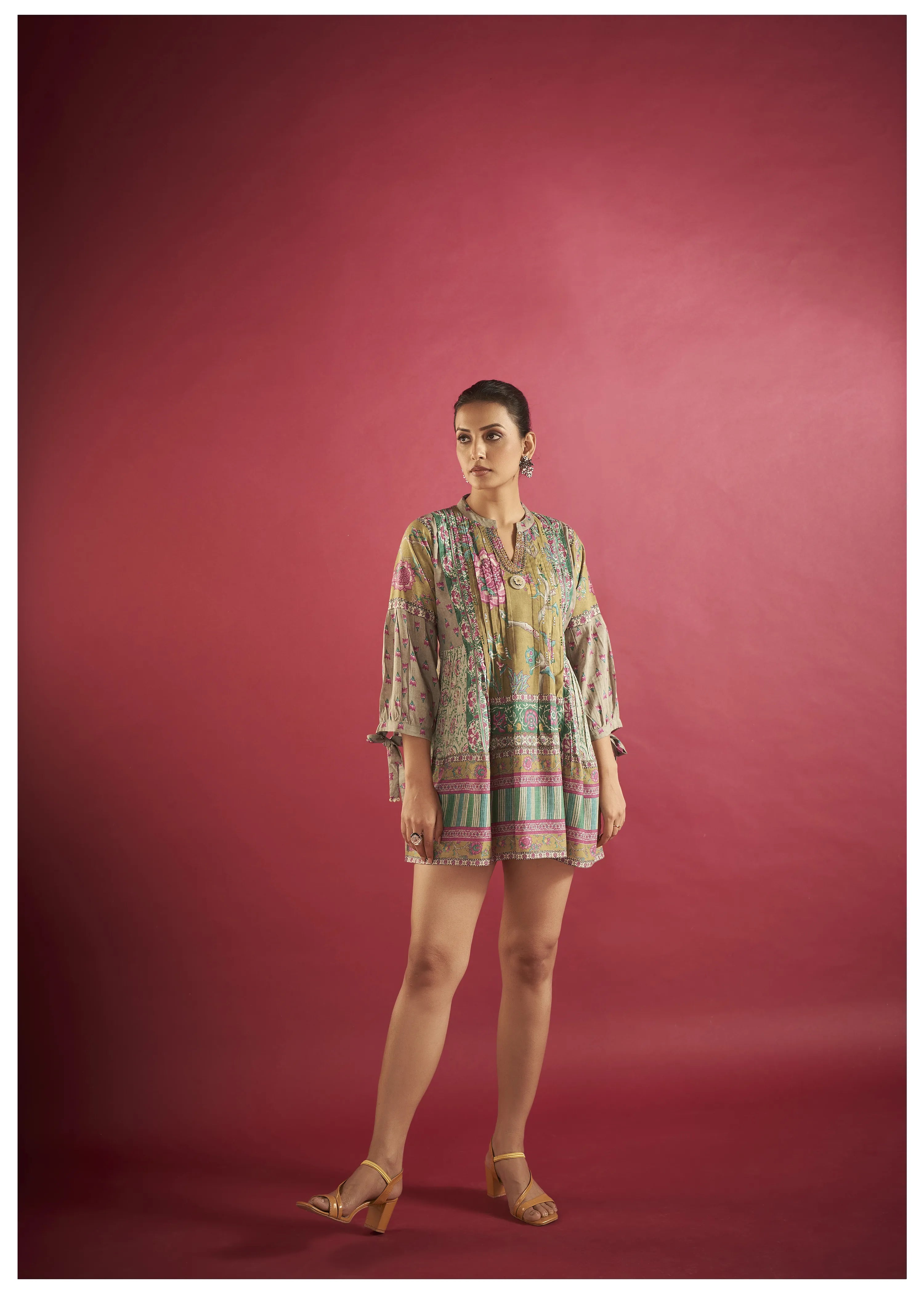 Multi-Print Cotton Viscose Pleated Tunic with Tie