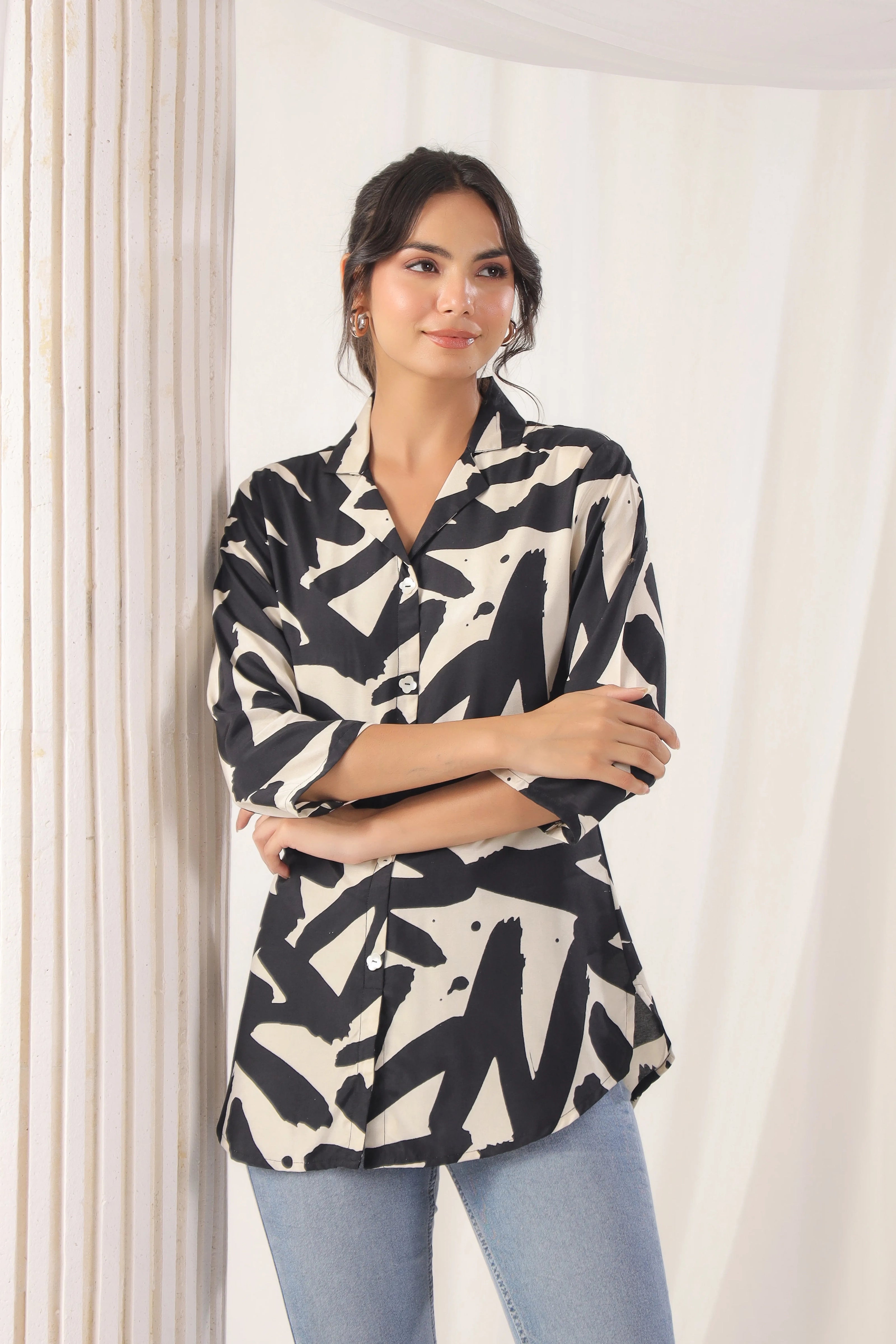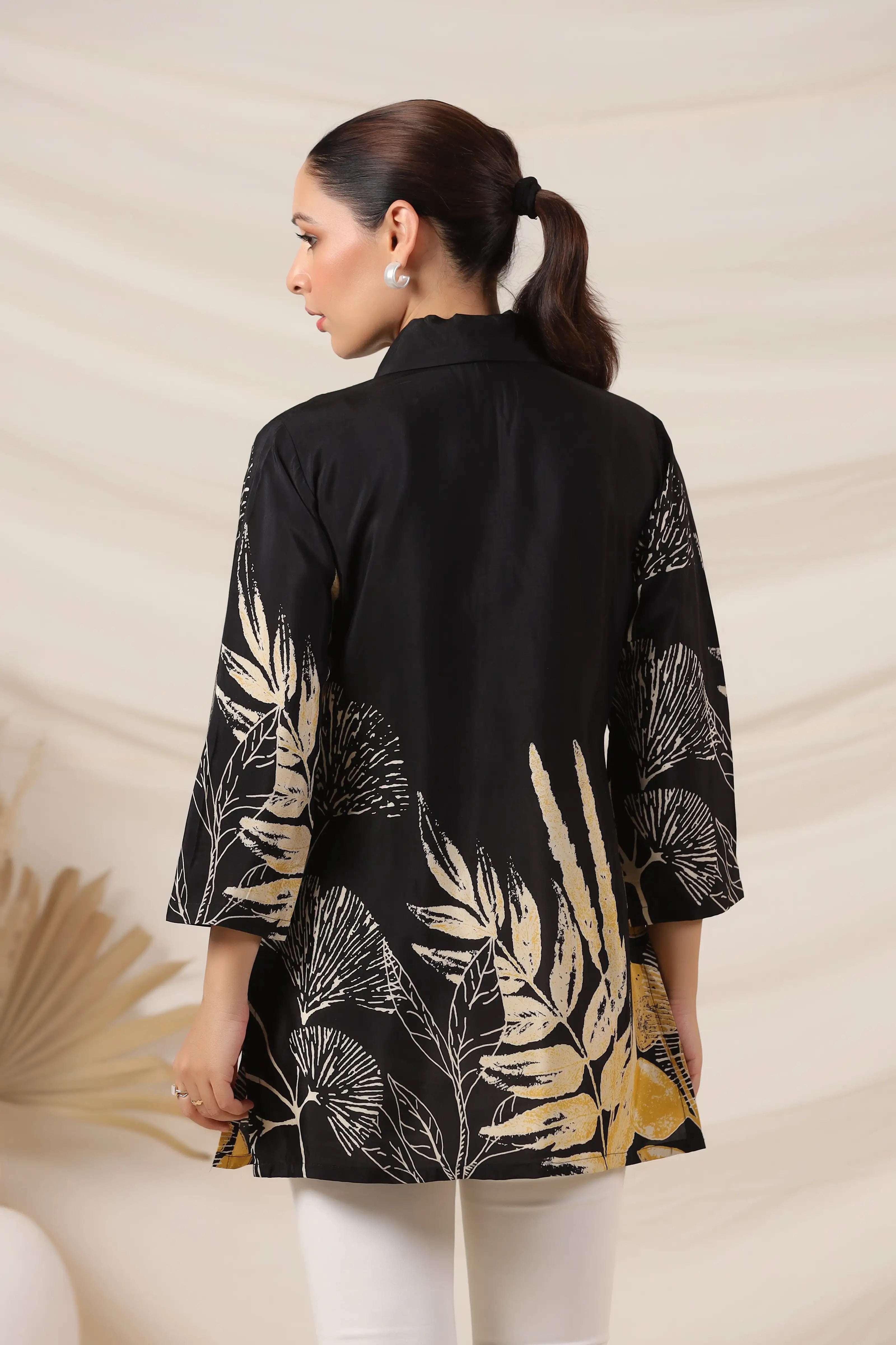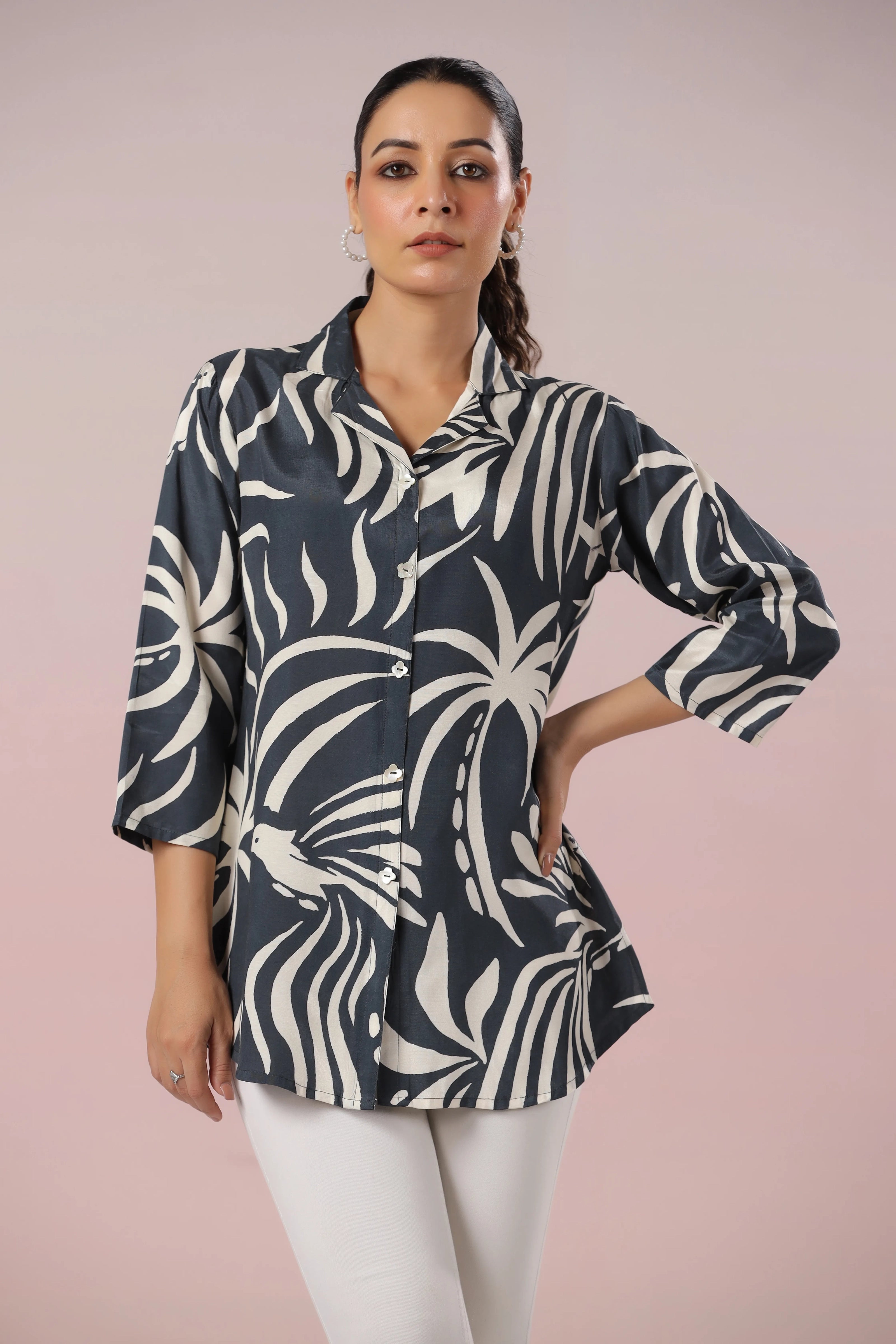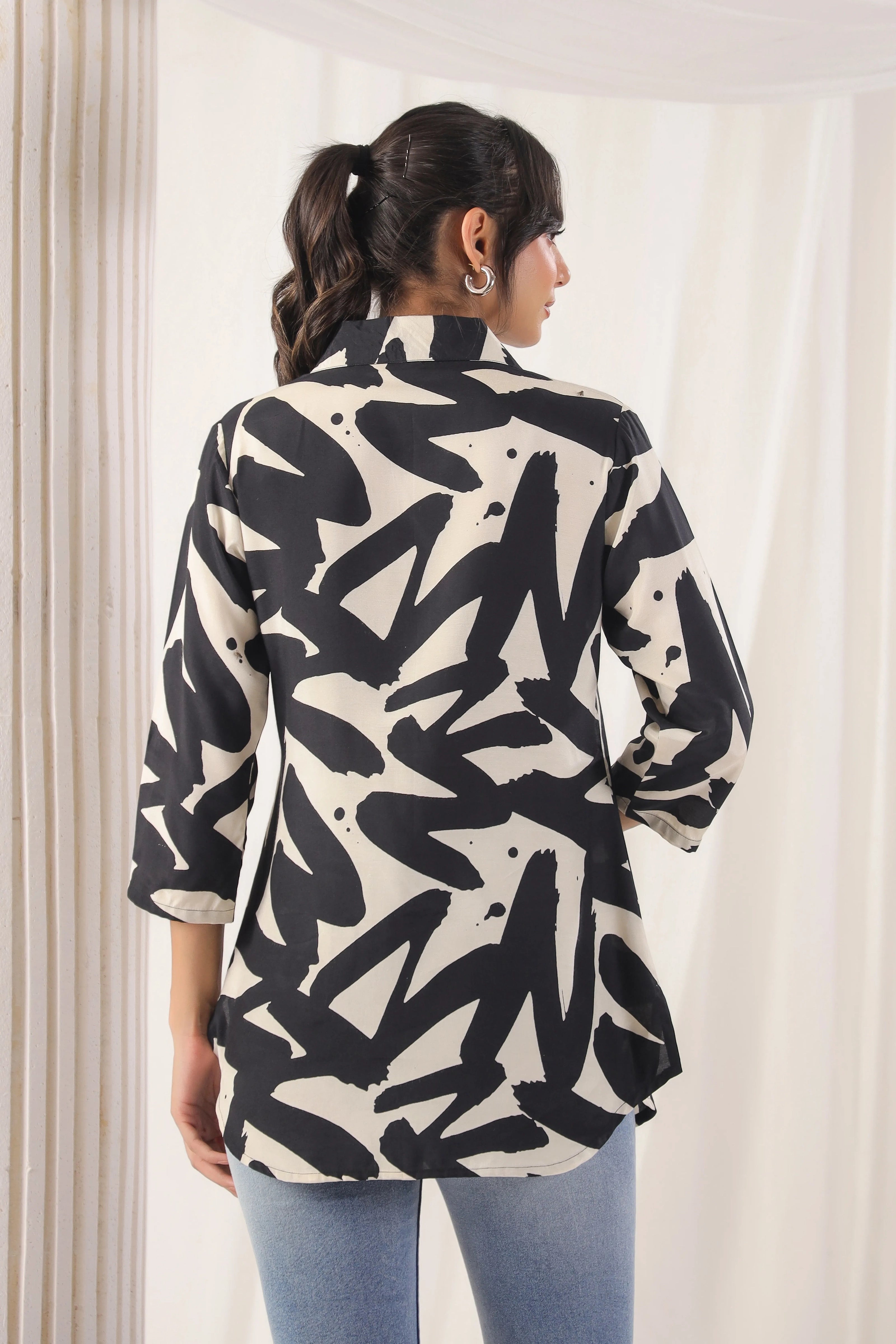 Cream & Black Crepe Leaf/Floral Printed 3/4 Sleeve Tunic