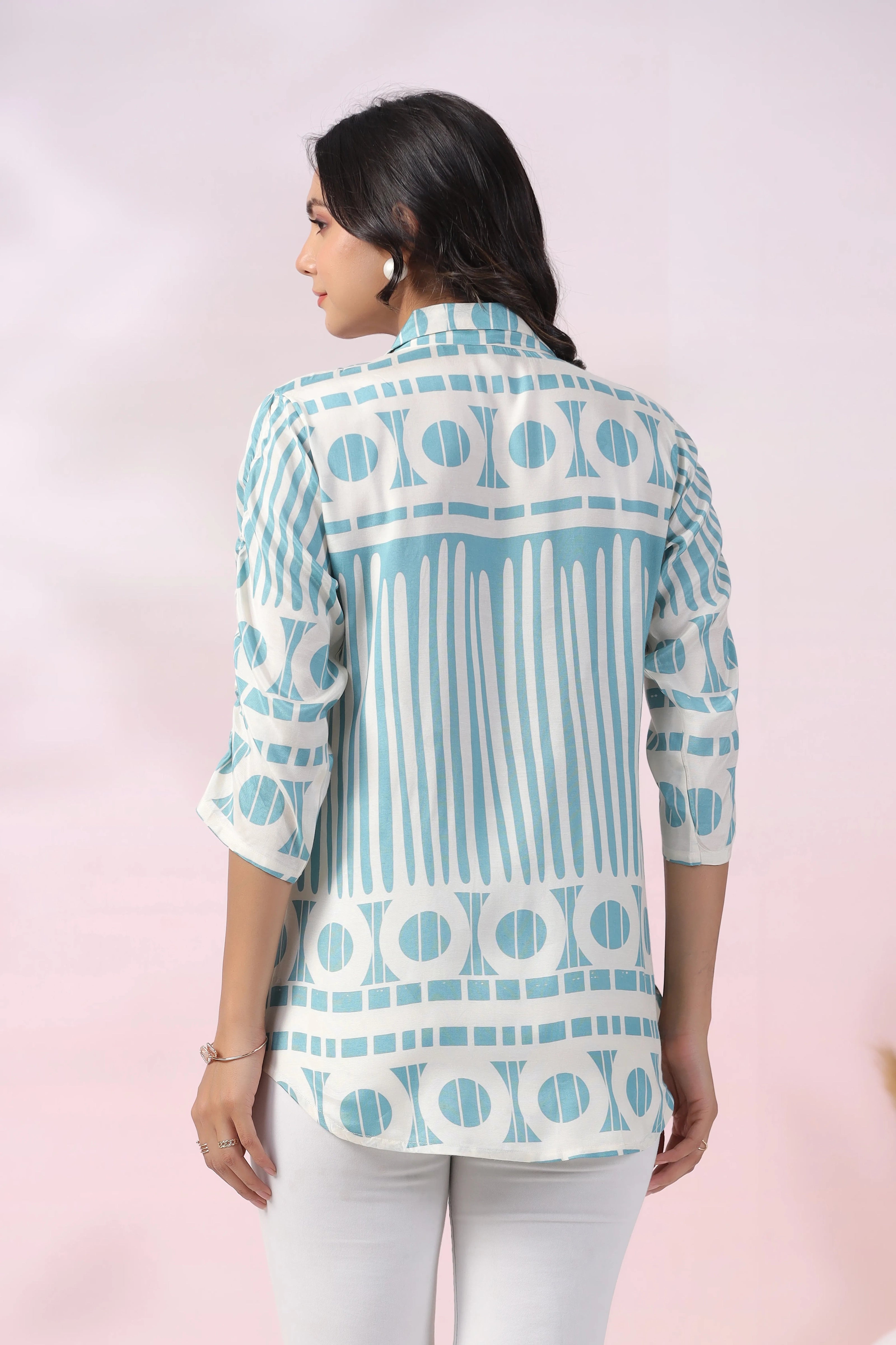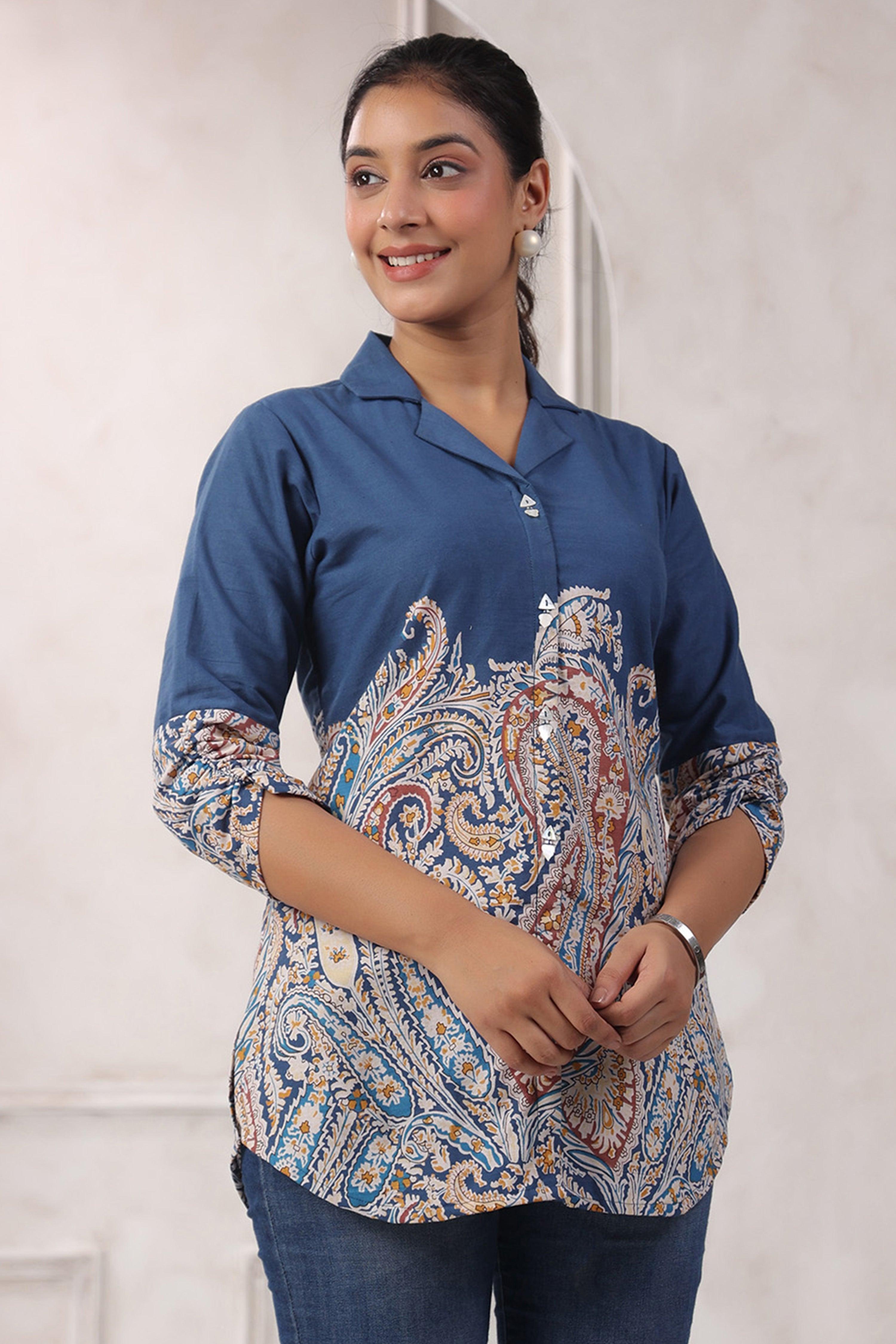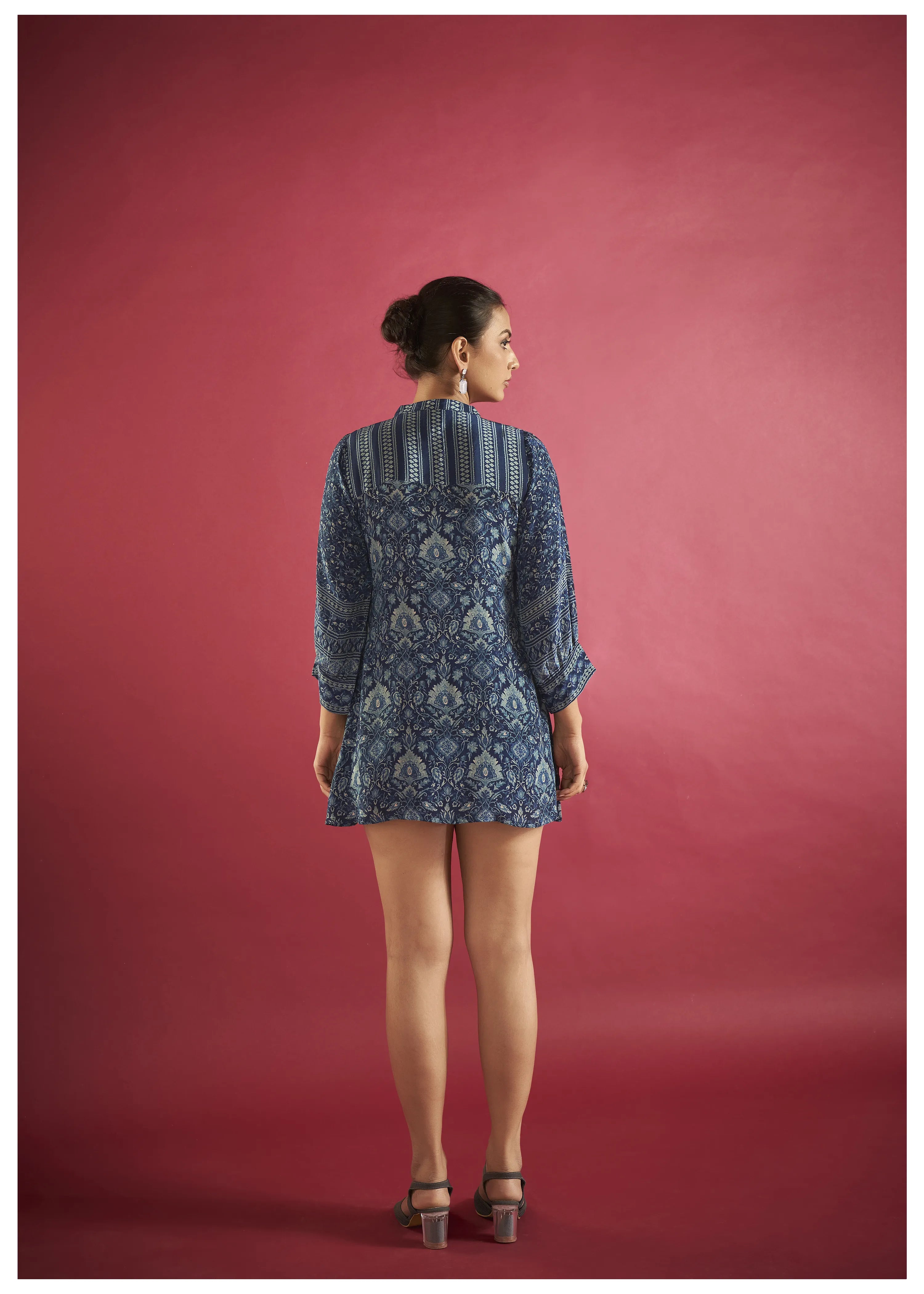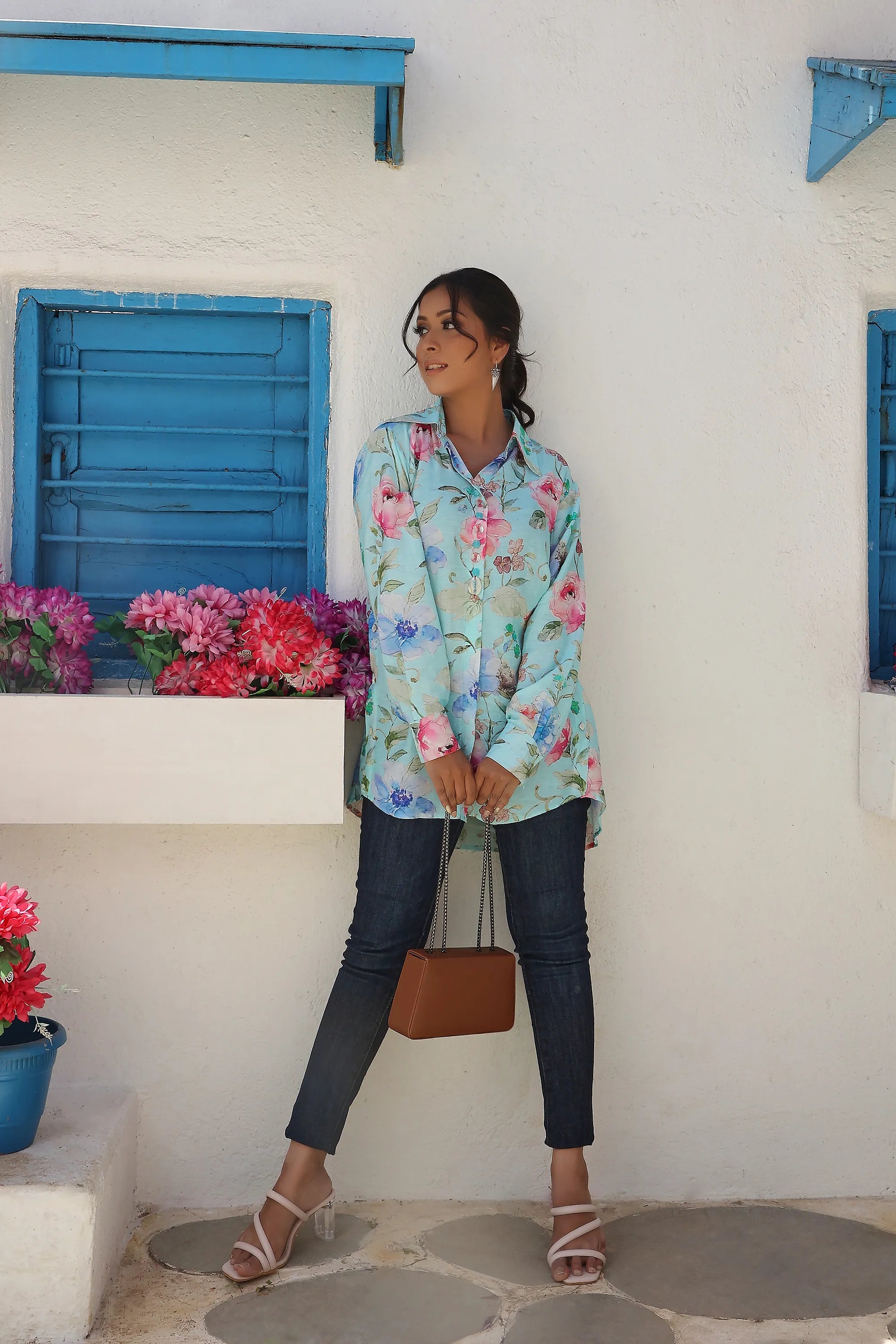 Sky Blue Floral Print Muslin Shirt-Style Tunic