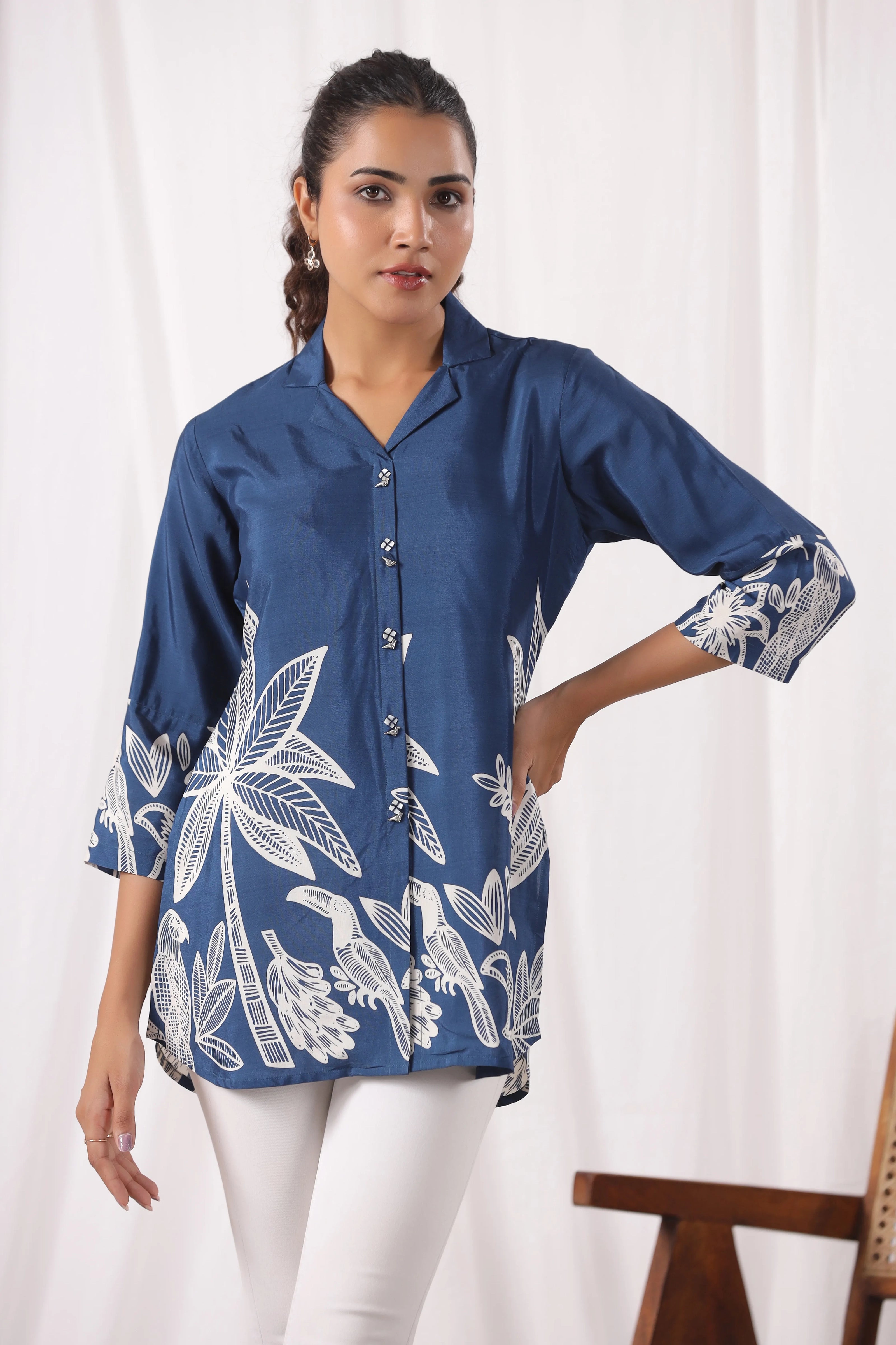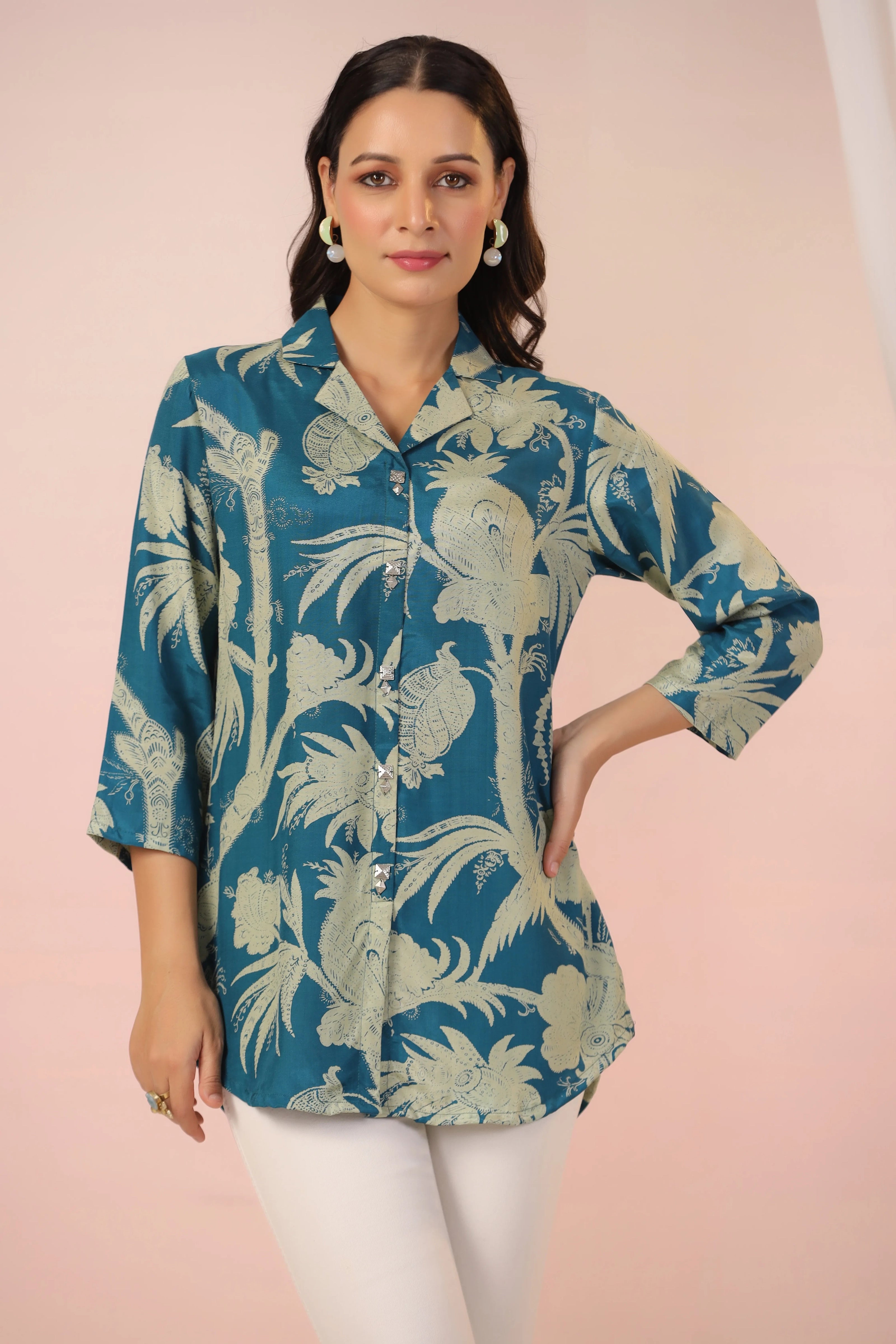 Teal Blue Abstract Floral Printed Russian Silk Tunic