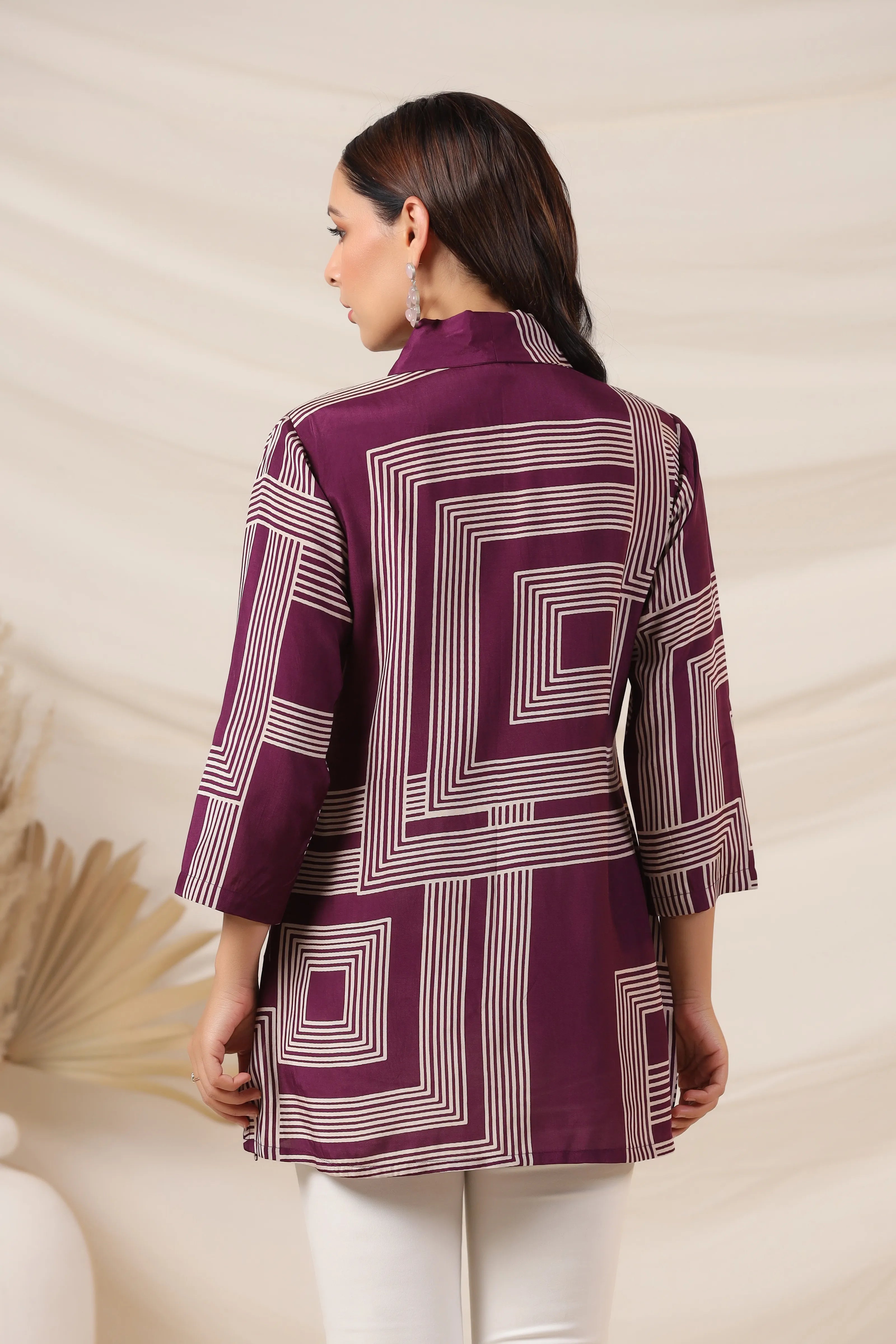 Dark Purple Abstract Stripe Printed Top in Russian Silk