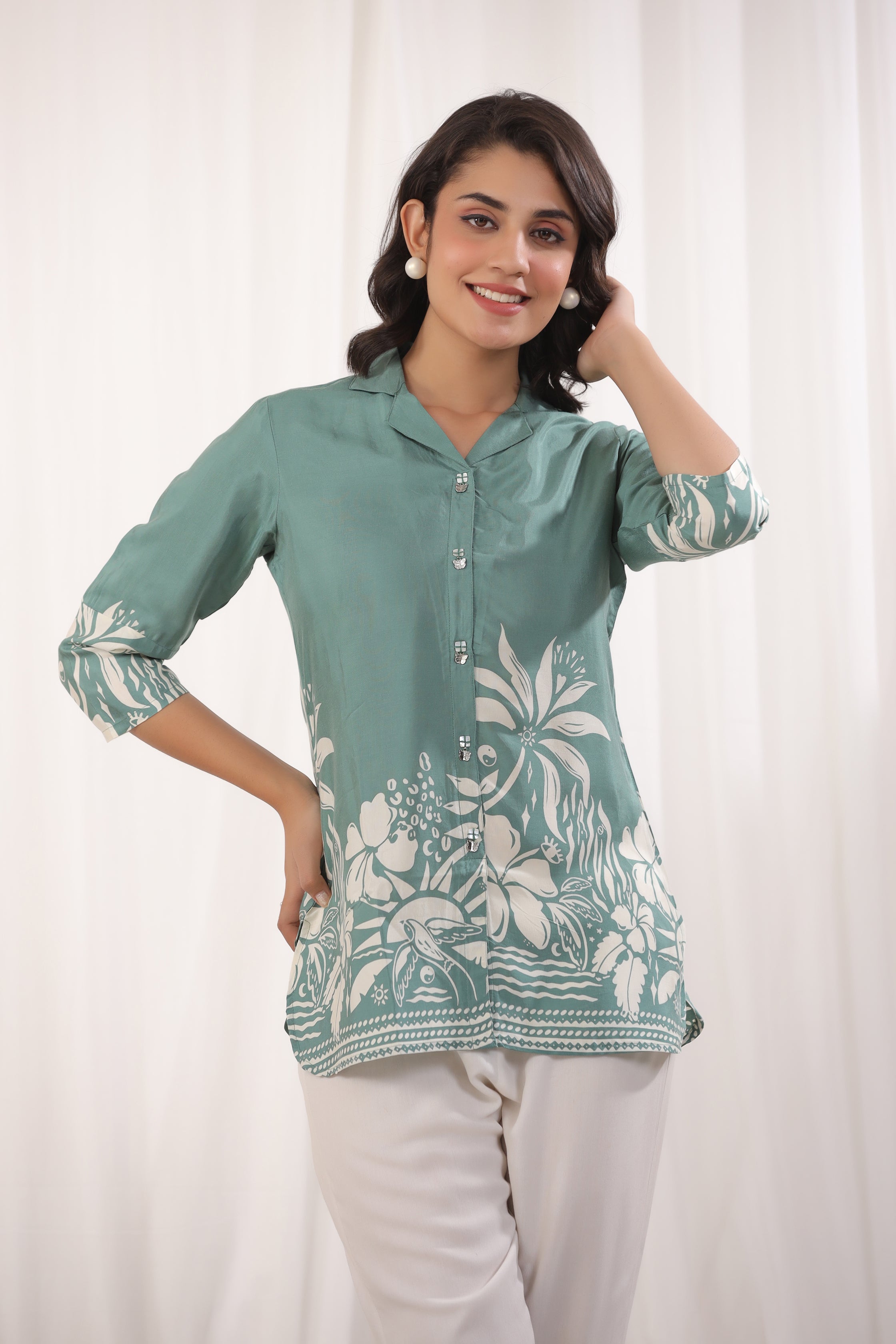 Pista Green Bold Floral Border Printed Top in Russian Silk