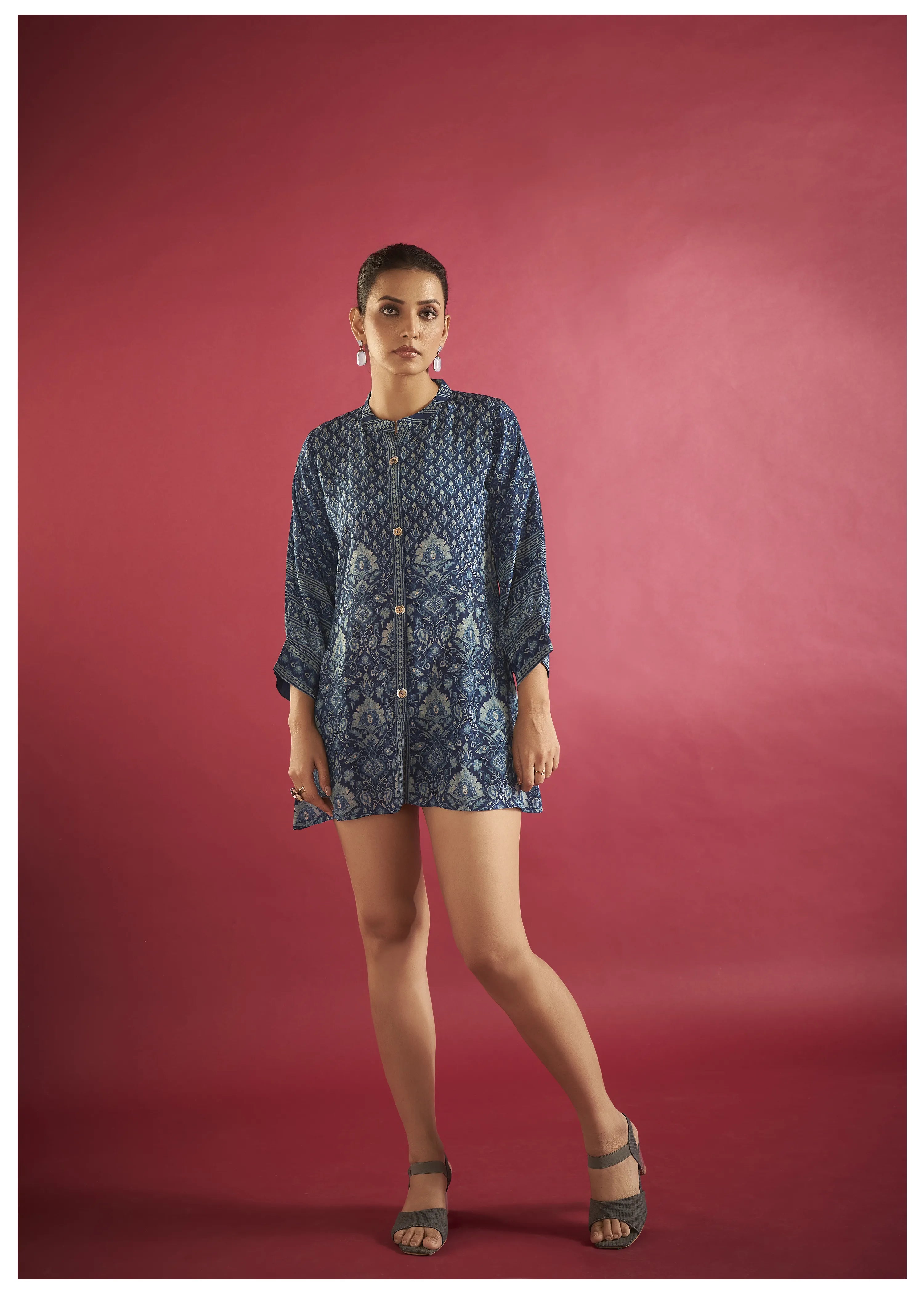Peacock Blue Abstract Printed Russian Silk Tunic