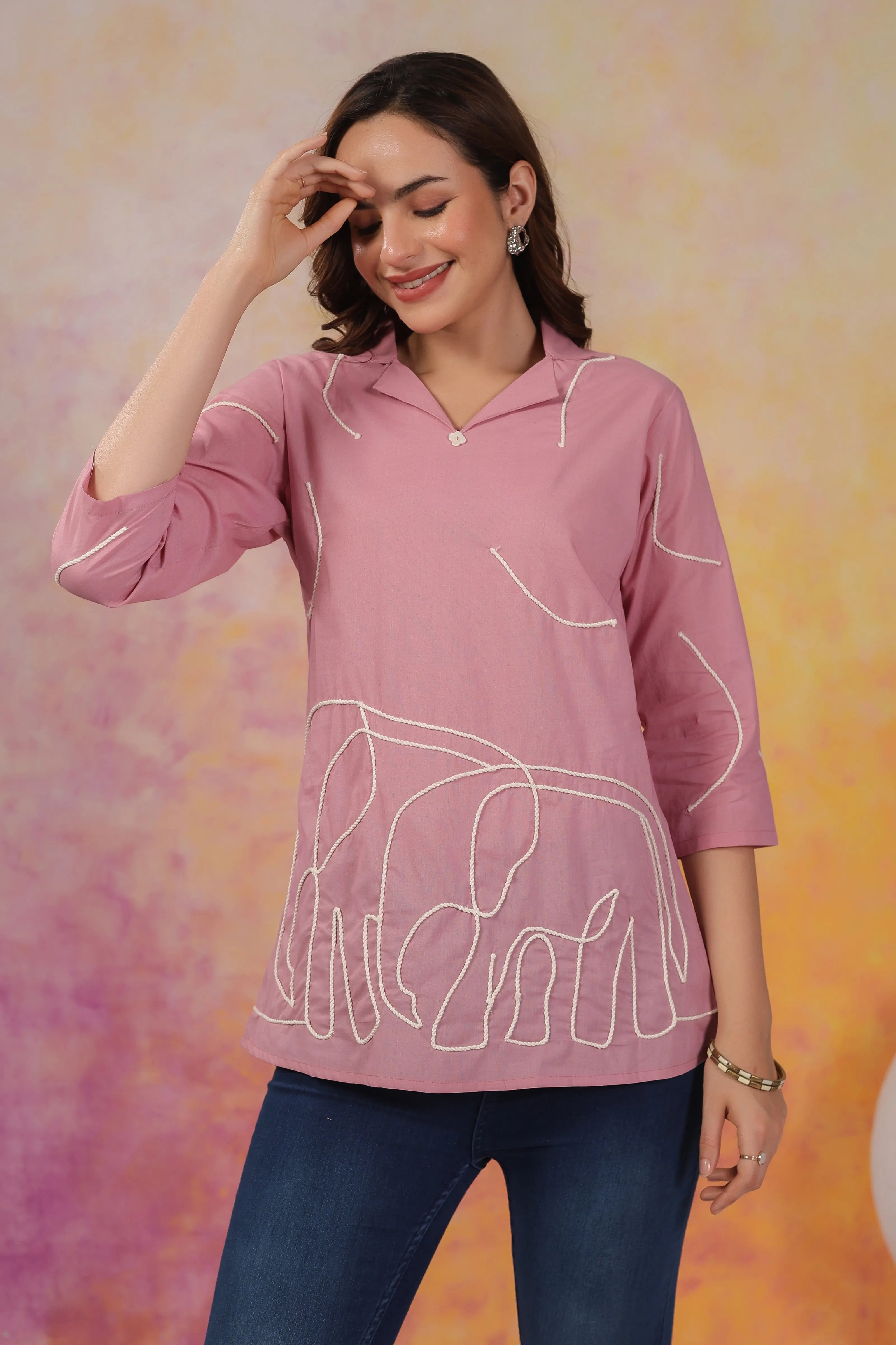 Dusty Pink Elephant Motif Cord Work Top in Cotton Cambric